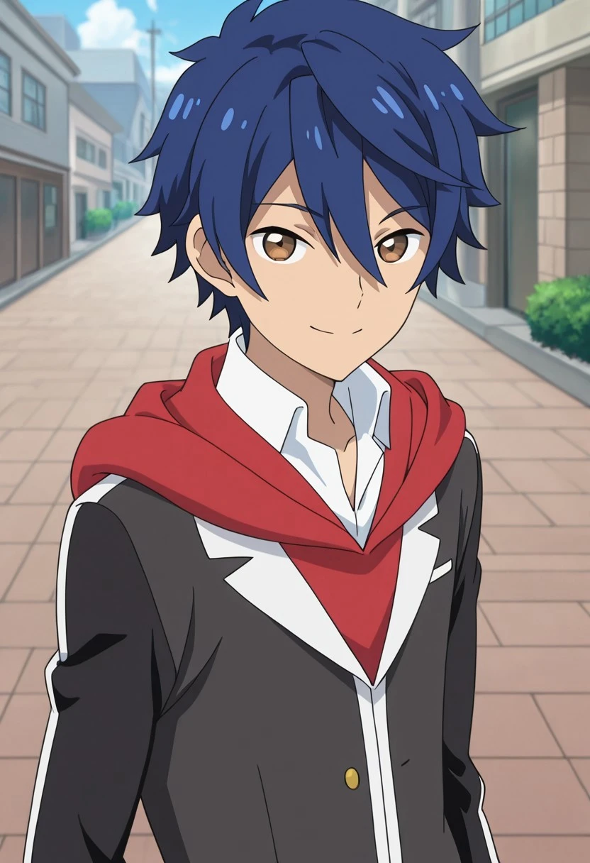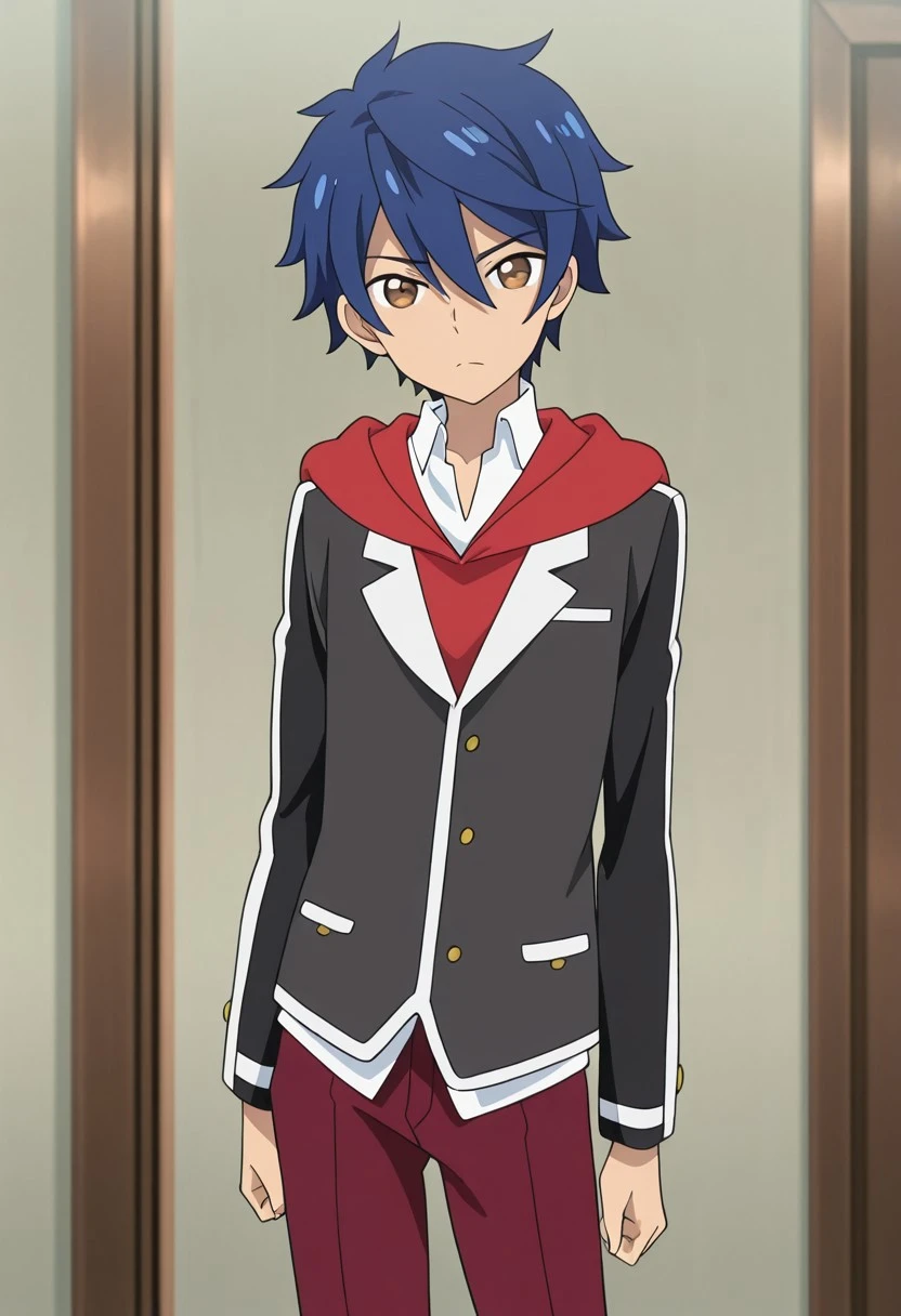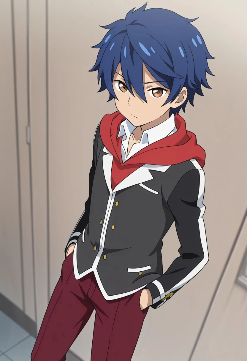 1boy, male focus, solo, brown eyes, blue hair, hair between eyes, school uniform, white shirt, collared shirt, open collar, red hoodie, hood, black jacket, red pants, shoes, brown footwear,
