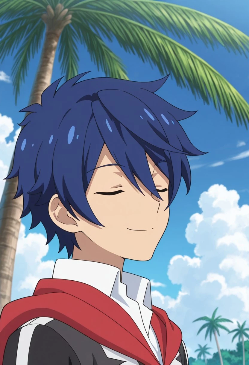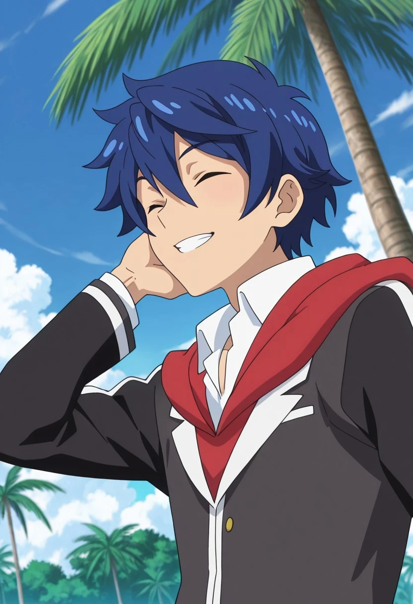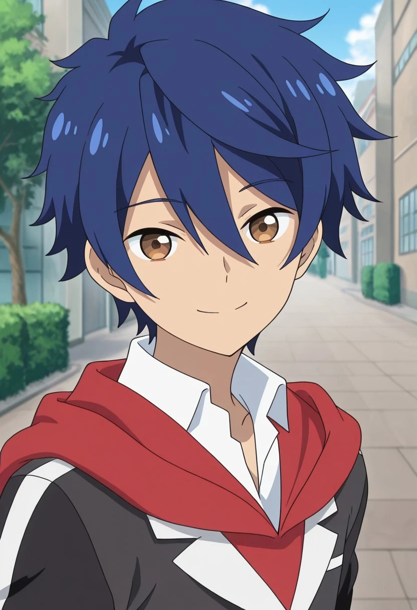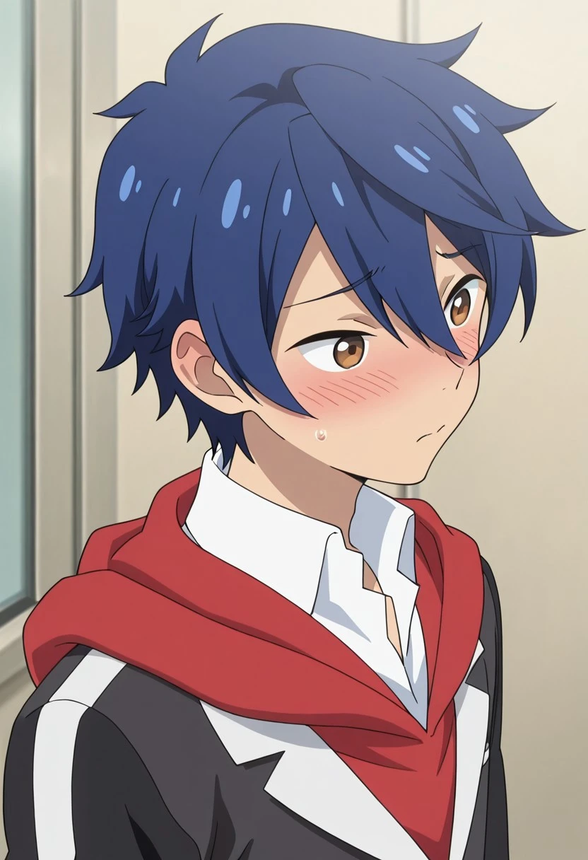 1boy, male focus, solo, brown eyes, blue hair, hair between eyes, school uniform, white shirt, collared shirt, open collar, red hoodie, hood, black jacket, red pants, shoes, brown footwear,