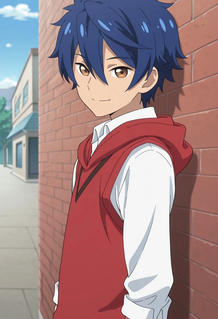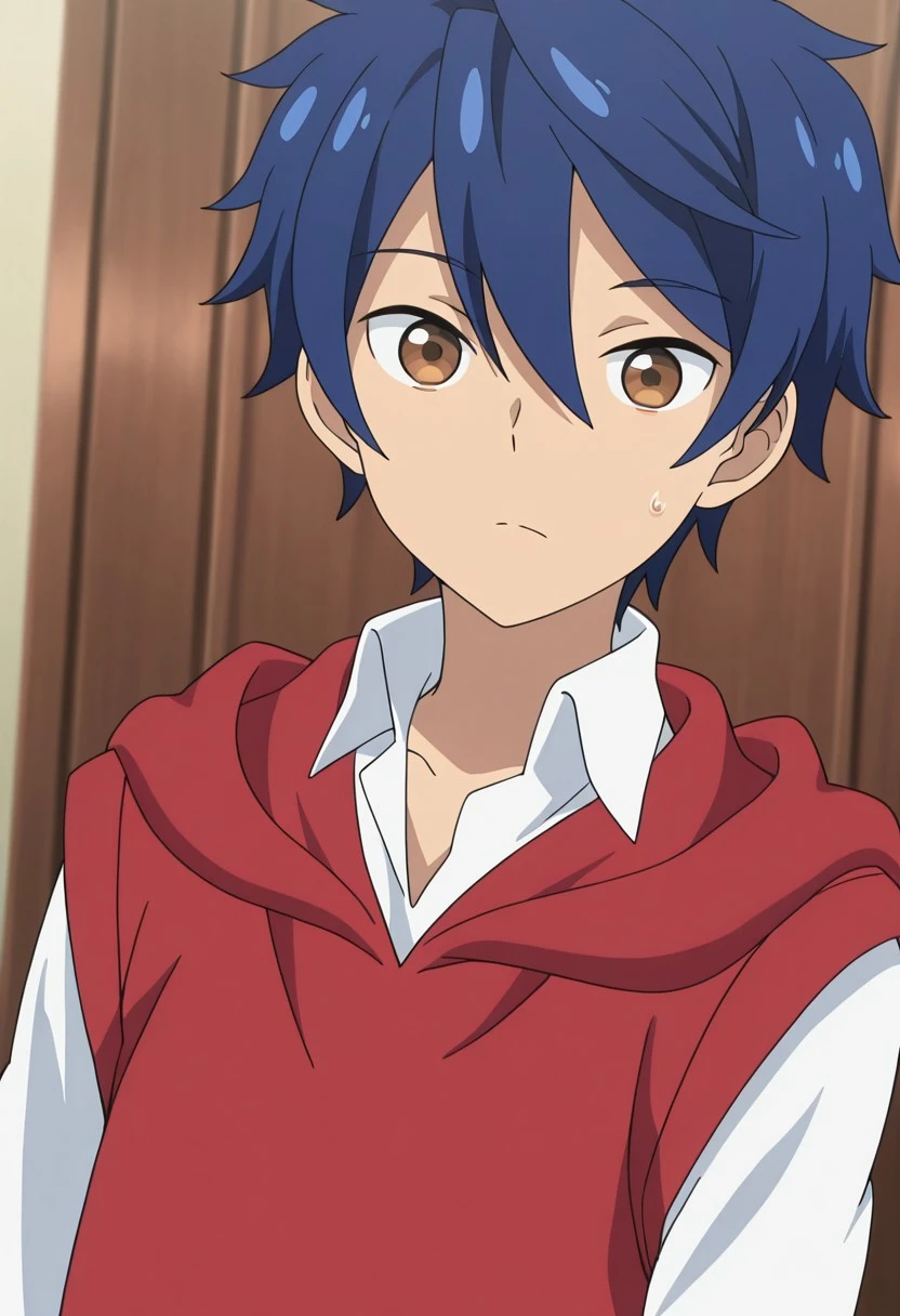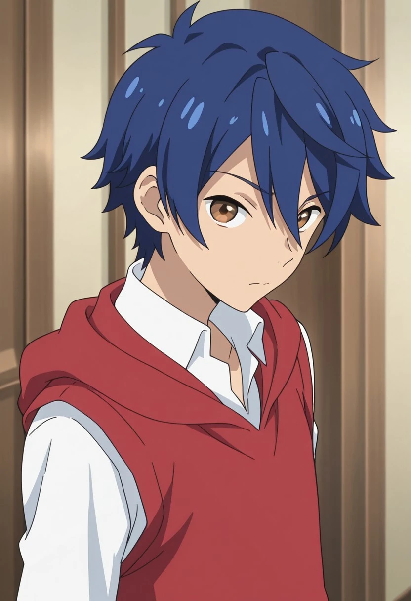 1boy, male focus, solo, brown eyes, blue hair, hair between eyes, white shirt, collared shirt, open collar, sweater vest, red vest, hood, red pants,