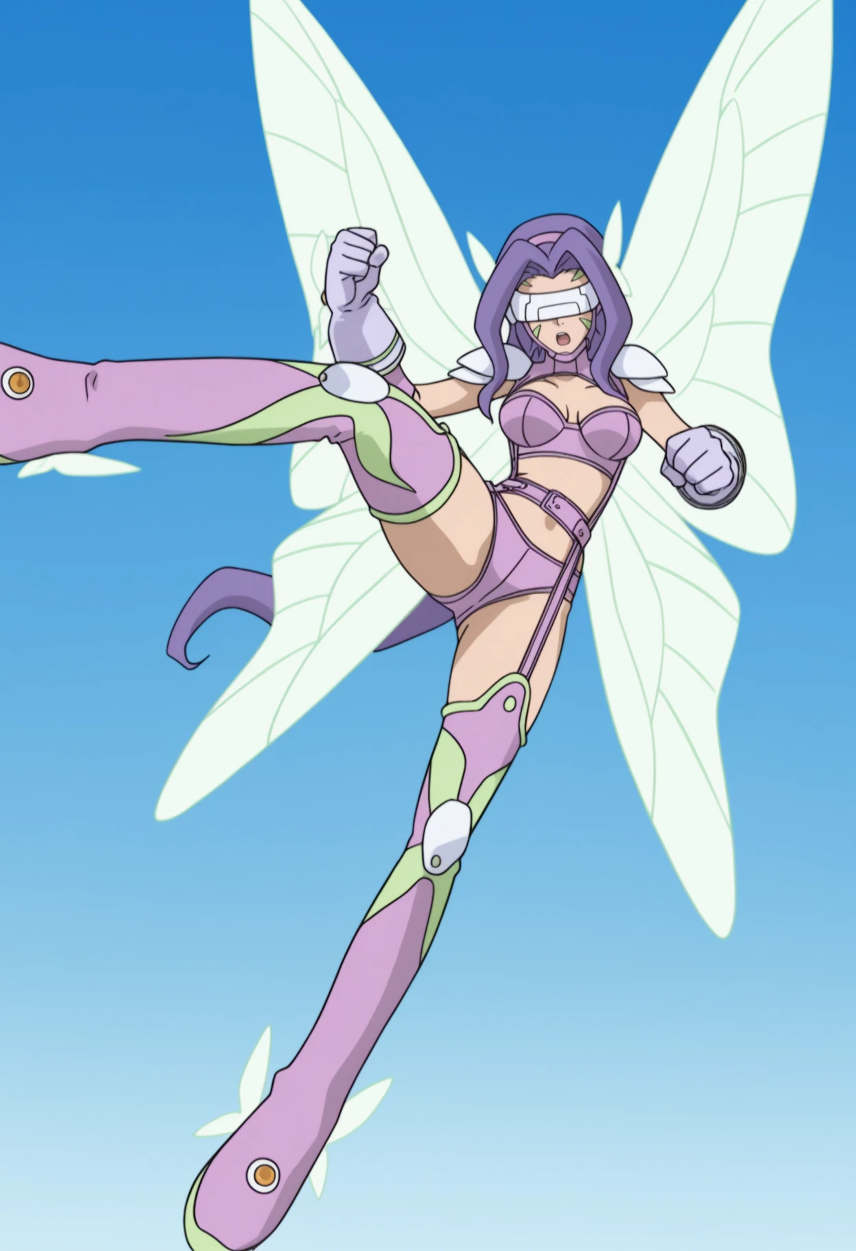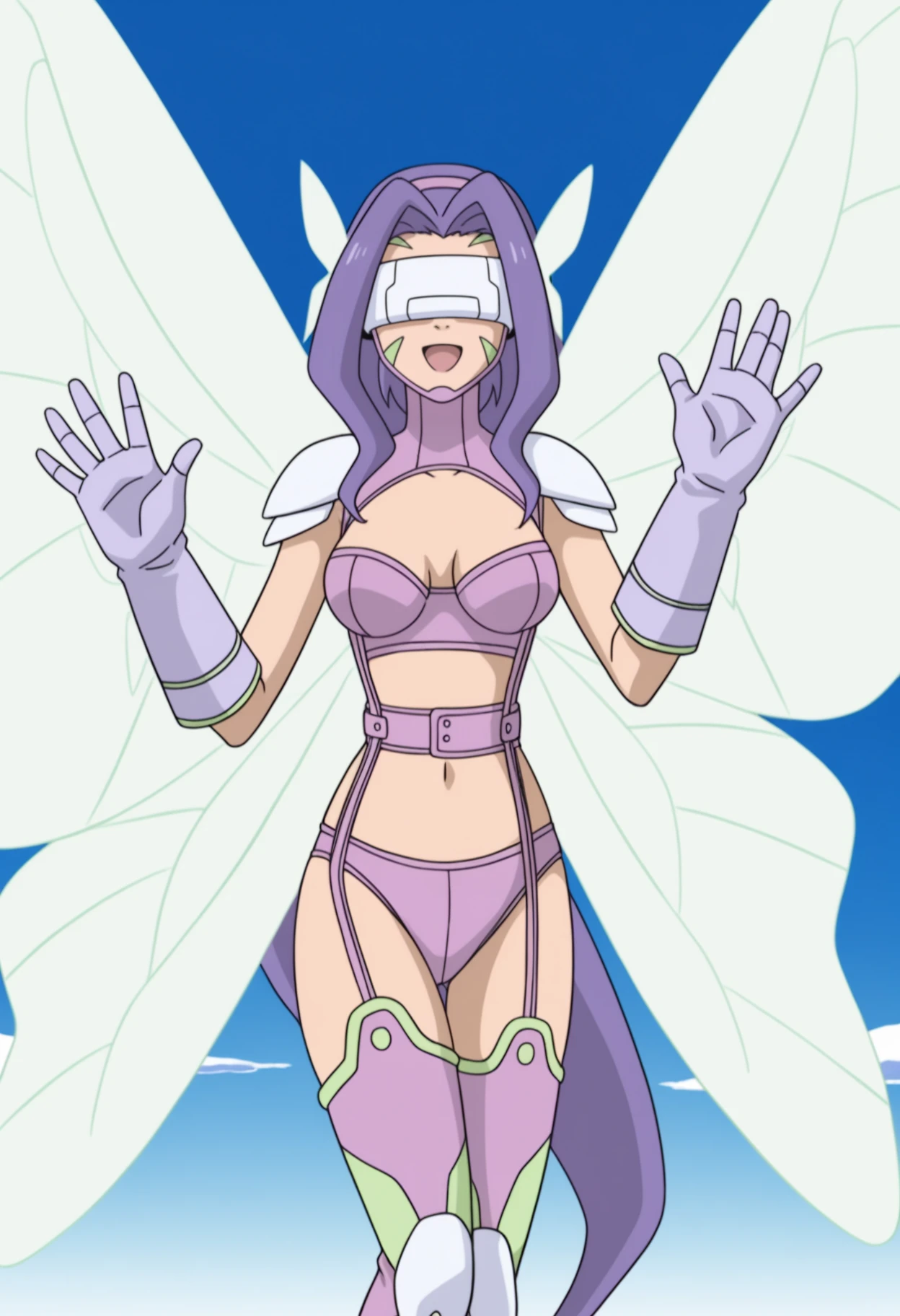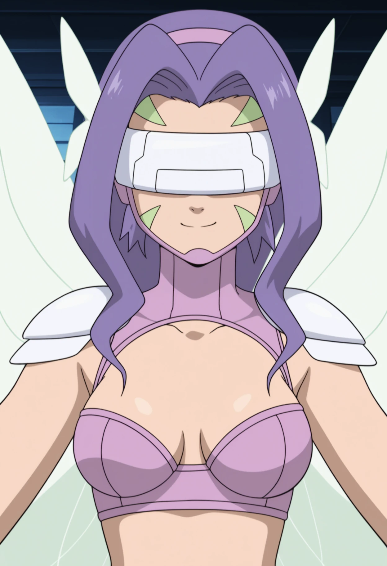 butterfly wings, shoulder pads,purple bikini,gloves,purple hairband,midriff,purple belt,garter straps,thigh boots,purple footwear