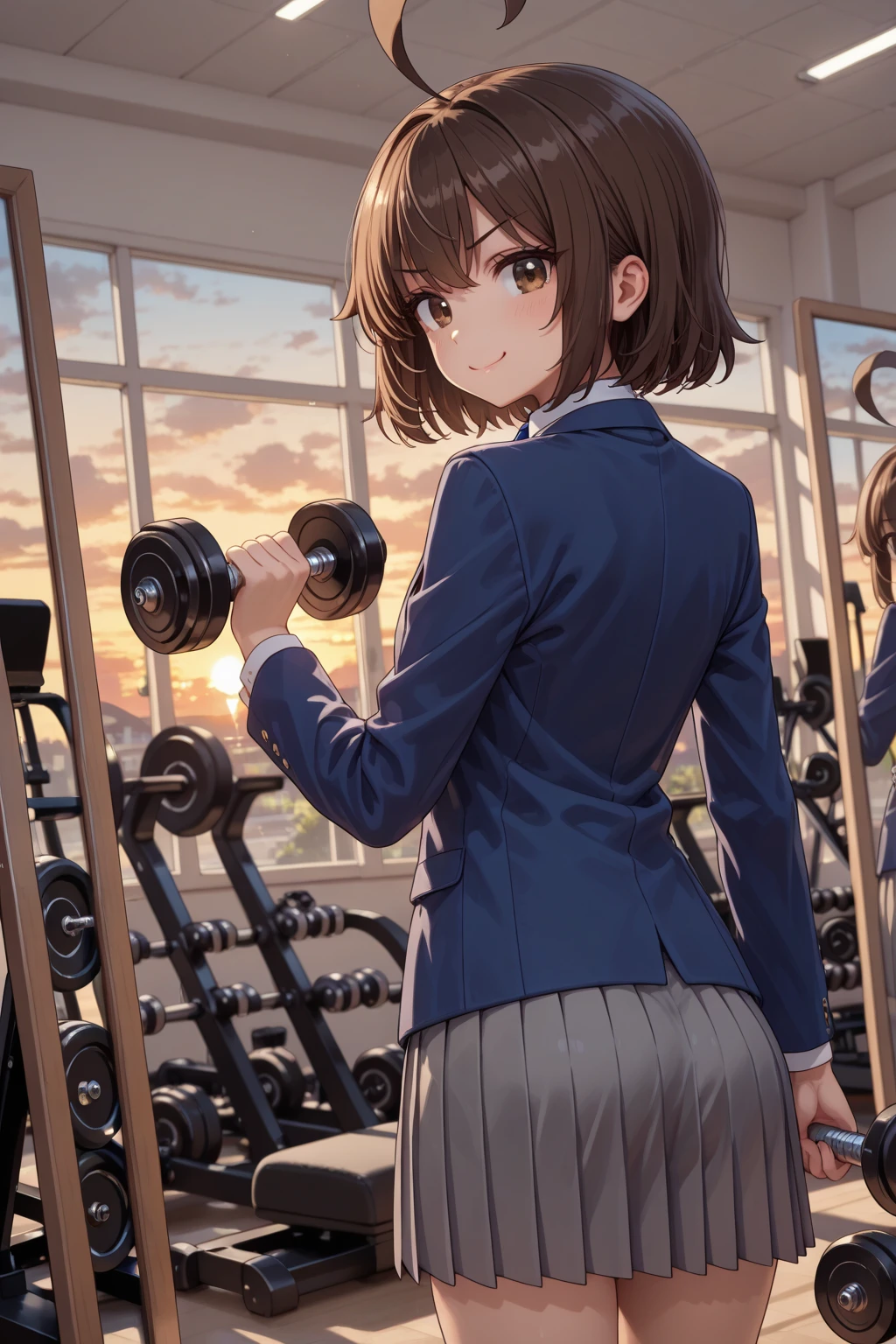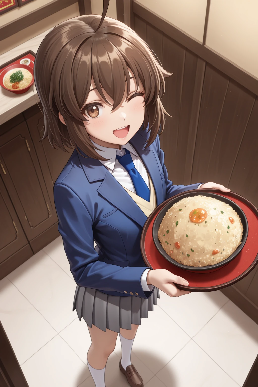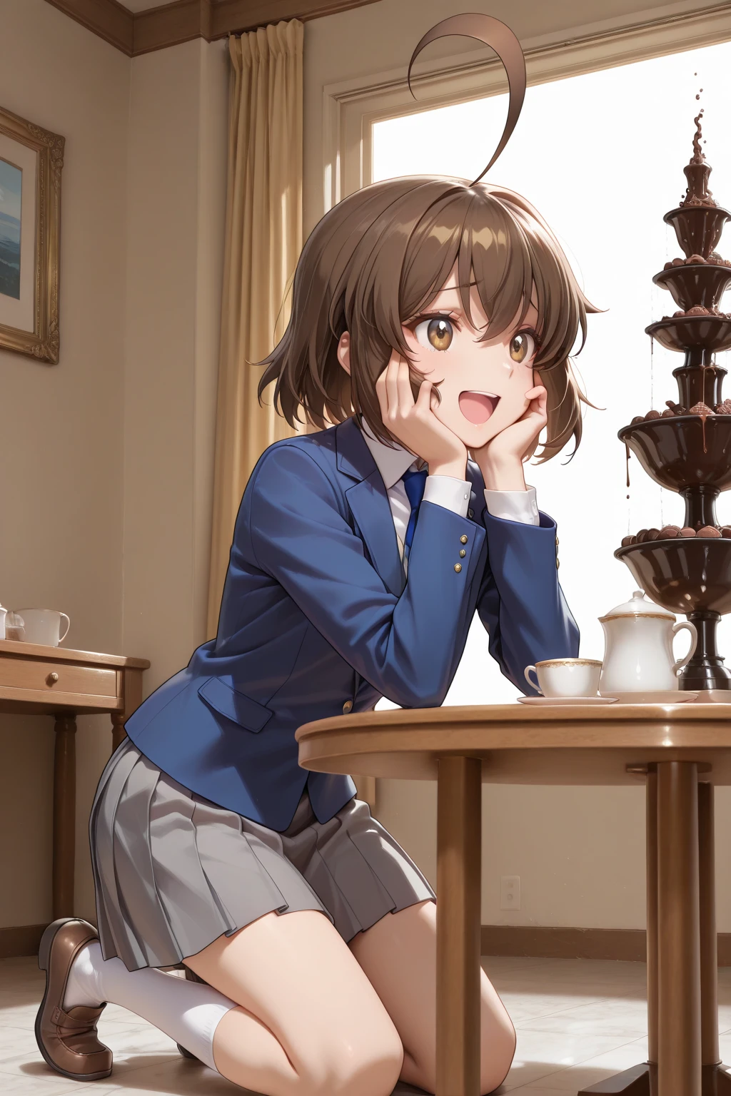 A_Natsuki, brown hair, short hair, huge ahoge, bangs, brown eyes, school uniform, blue jacket, long sleeves, white shirt, collared shirt, blue necktie, grey skirt, pleated skirt