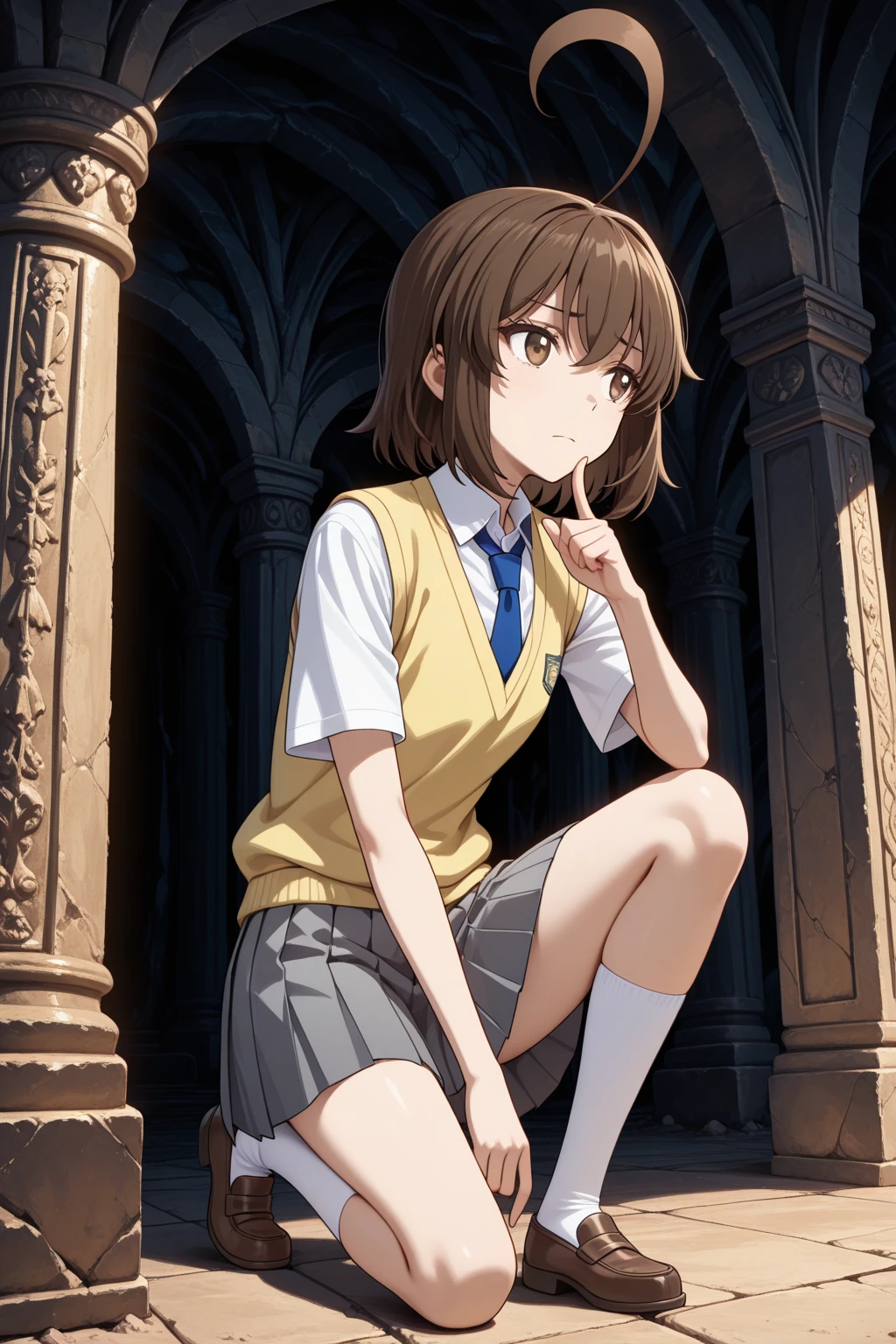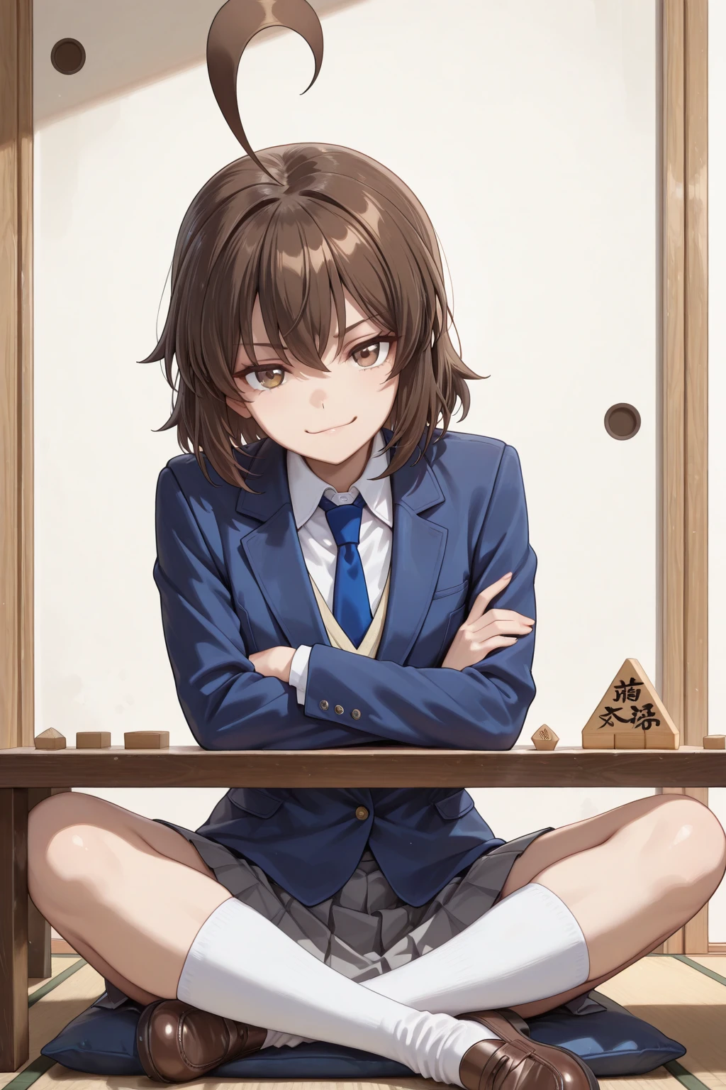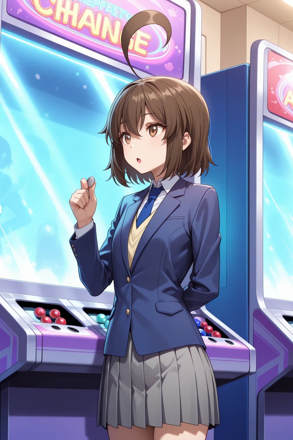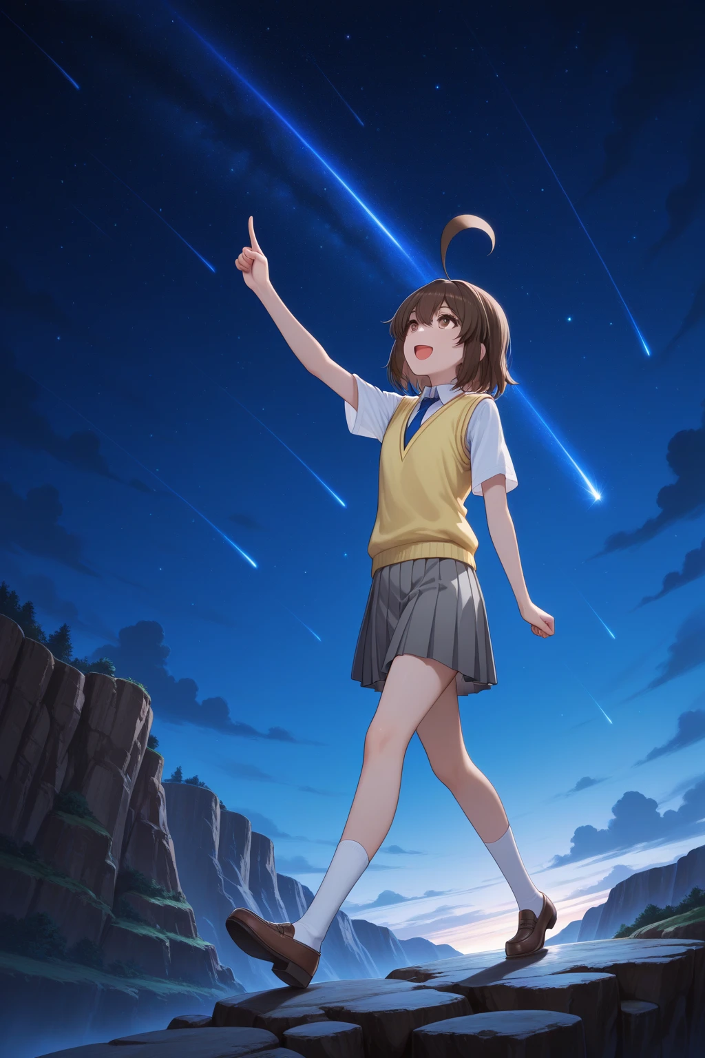 トリガーワード:A_Natsuki, brown hair, short hair, huge ahoge, bangs, brown eyes, school uniform, blue jacket, long sleeves, white shirt, collared shirt, blue necktie, grey skirt, pleated skirtトリガーワード:A_Natsuki, brown hair, short hair, huge ahoge, bangs, brown eyes, school uniform, white shirt, collared shirt, short sleeves, yellow sweater vest, blue necktie, grey skirt, pleated skirt追加:white socks, brown loafers