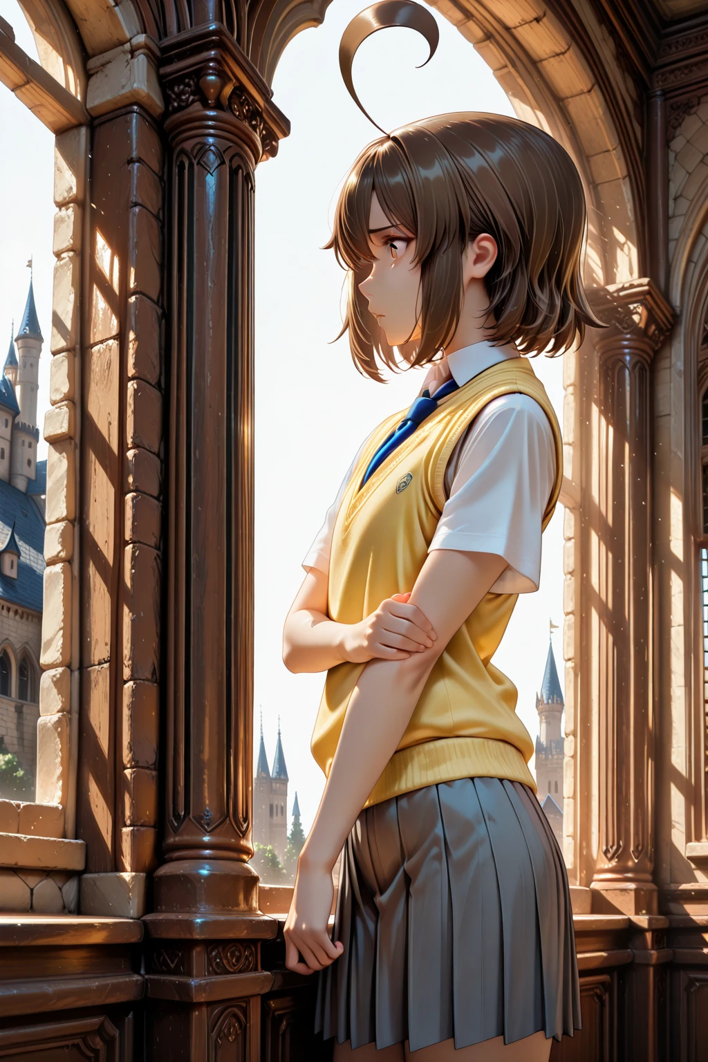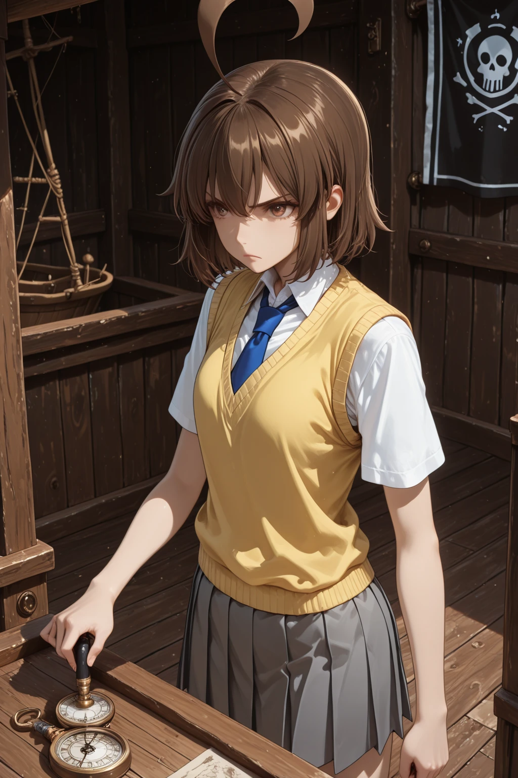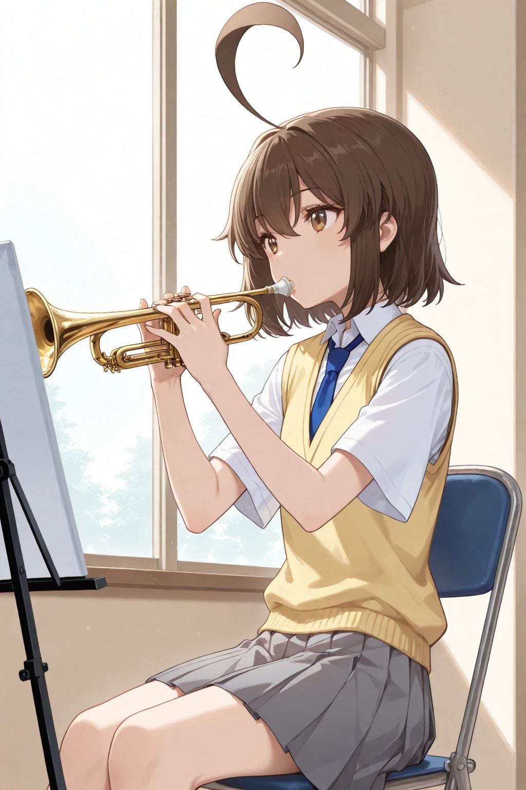 A_Natsuki, brown hair, short hair, huge ahoge, bangs, brown eyes, school uniform, white shirt, collared shirt, short sleeves, yellow sweater vest, blue necktie, grey skirt, pleated skirt