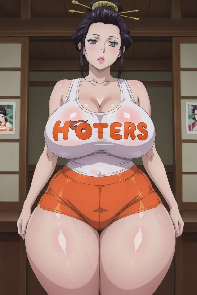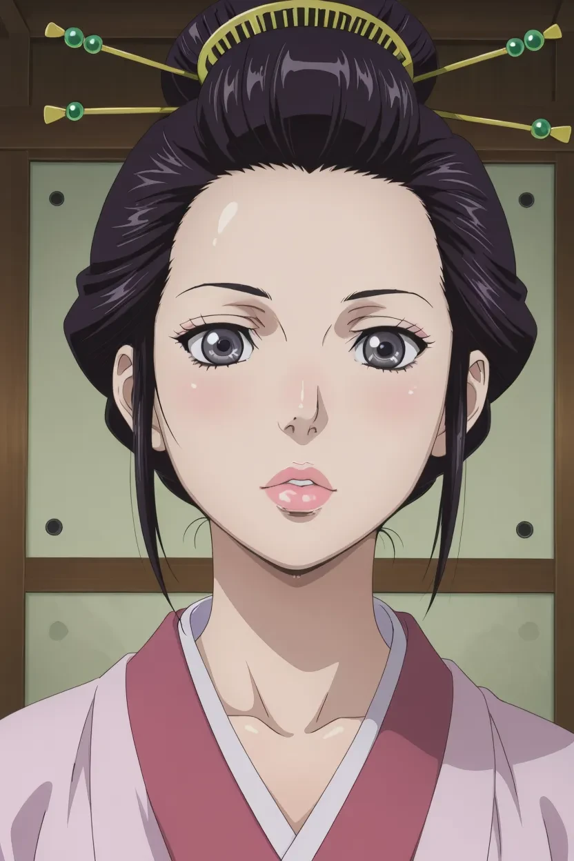 1girl, Omine Tomioka, (Manyuu Hikenchou), black_hair, grey_eyes, hair stick, hair ornament, lips, glossy lips, thick lips, massive breasts, Manyuu Hikenchou_art_style, 4k, HD, excellent quality, high-resolution, clear animation