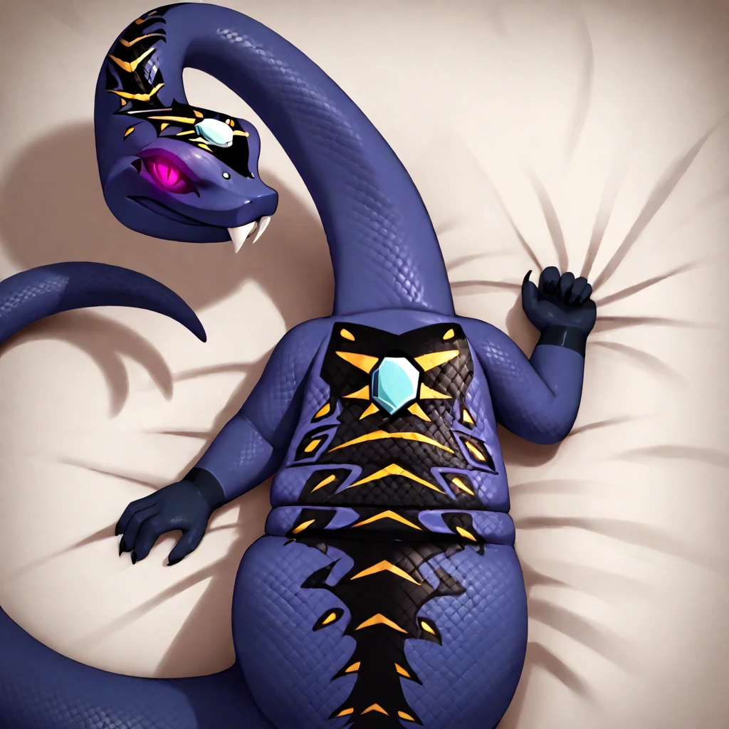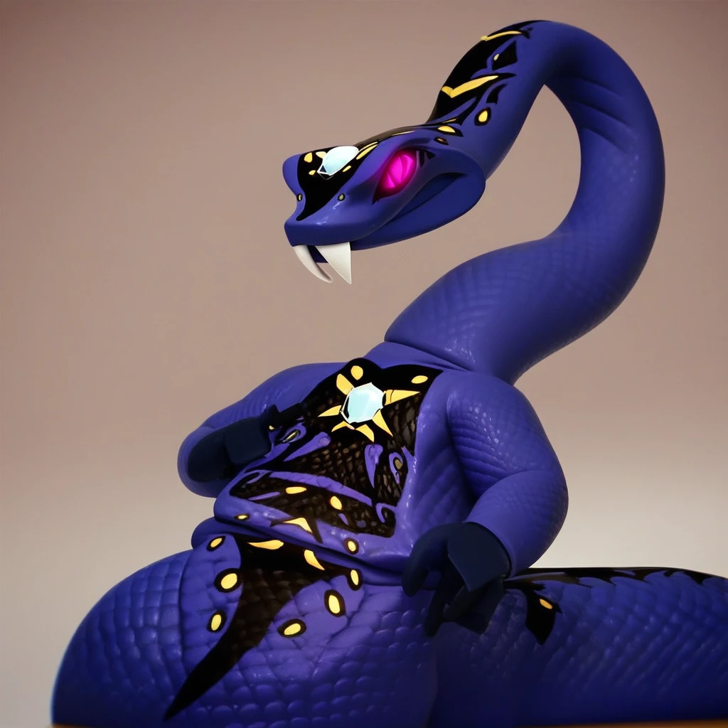 Reinforcement tags: Pythor, snake, naga, forked tongue, snake tail, no legs, purple scales, black and yellow body markings, body markings, blue gem on head, blue gem on chest, head markings, pointed teeth, fangs