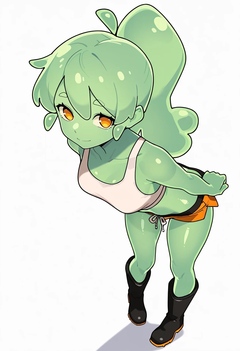 slime_cnr, 1girl,slime girl, green hair, long hair, ponytail, green skin, colored skin, orange eyes,translucent skin, 👗Default Outfit