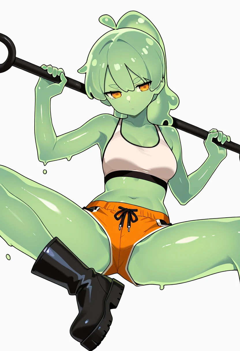 midriff, orange micro shorts, white sports bra,black rubber boots, Explanation and notes below👇
