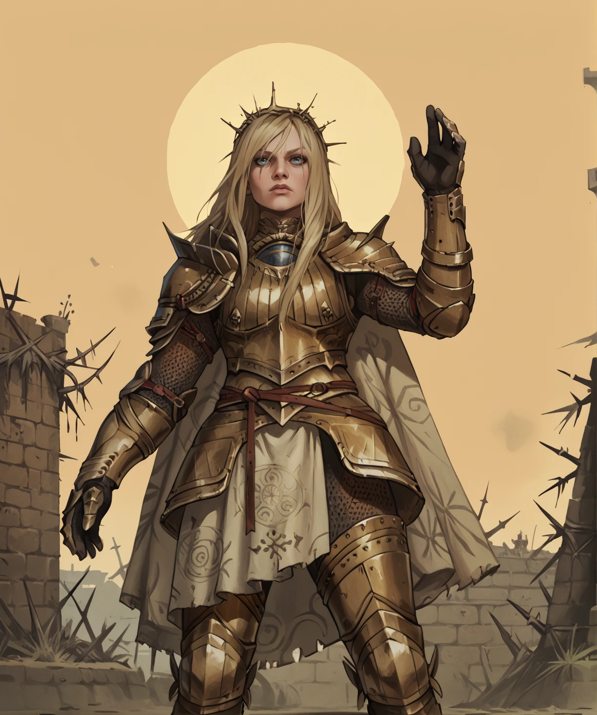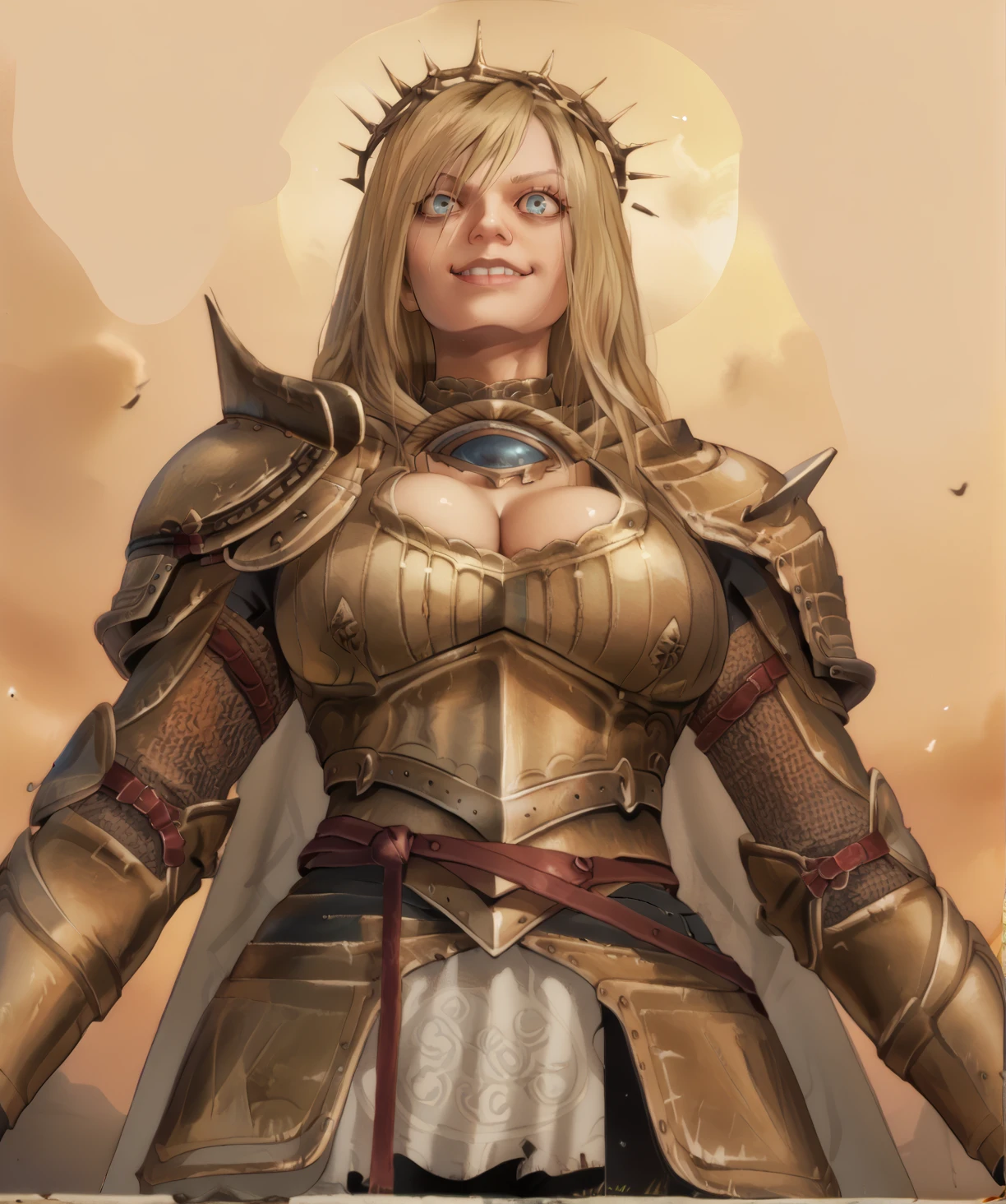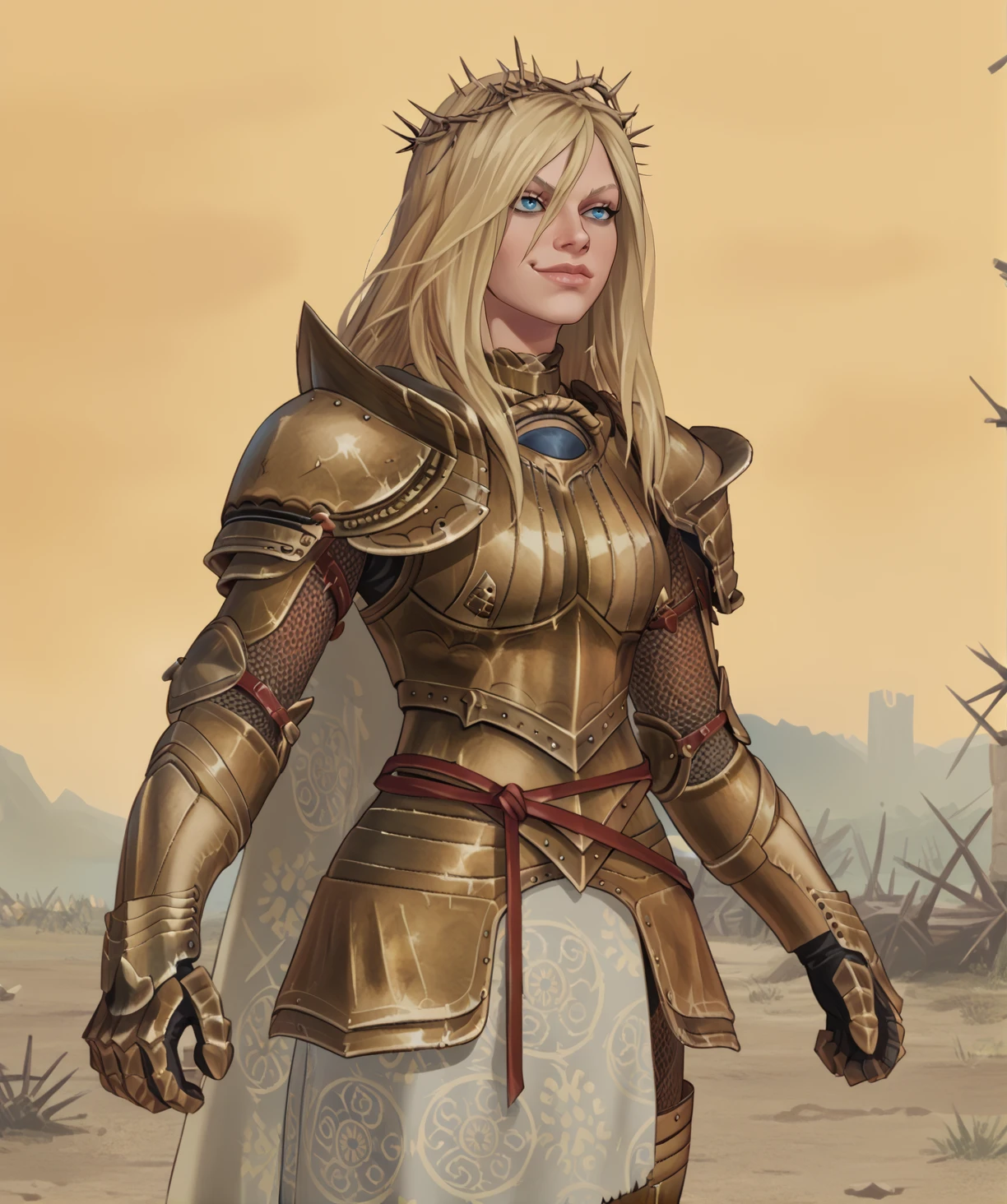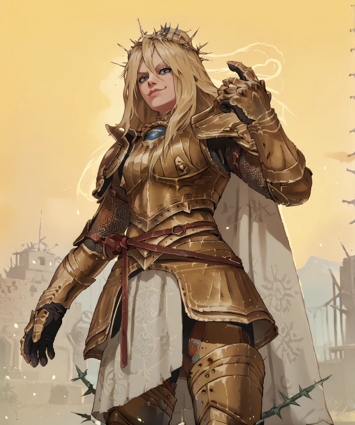 full armor, or yellow armor, or gold armor, pauldrons, cape, Crown, skirt,