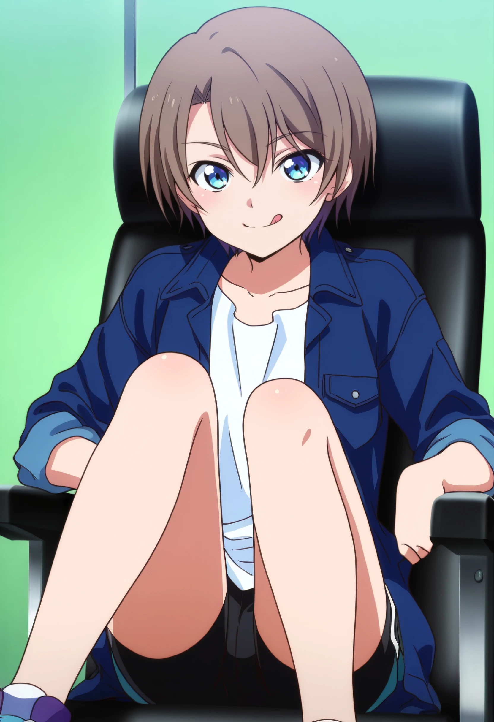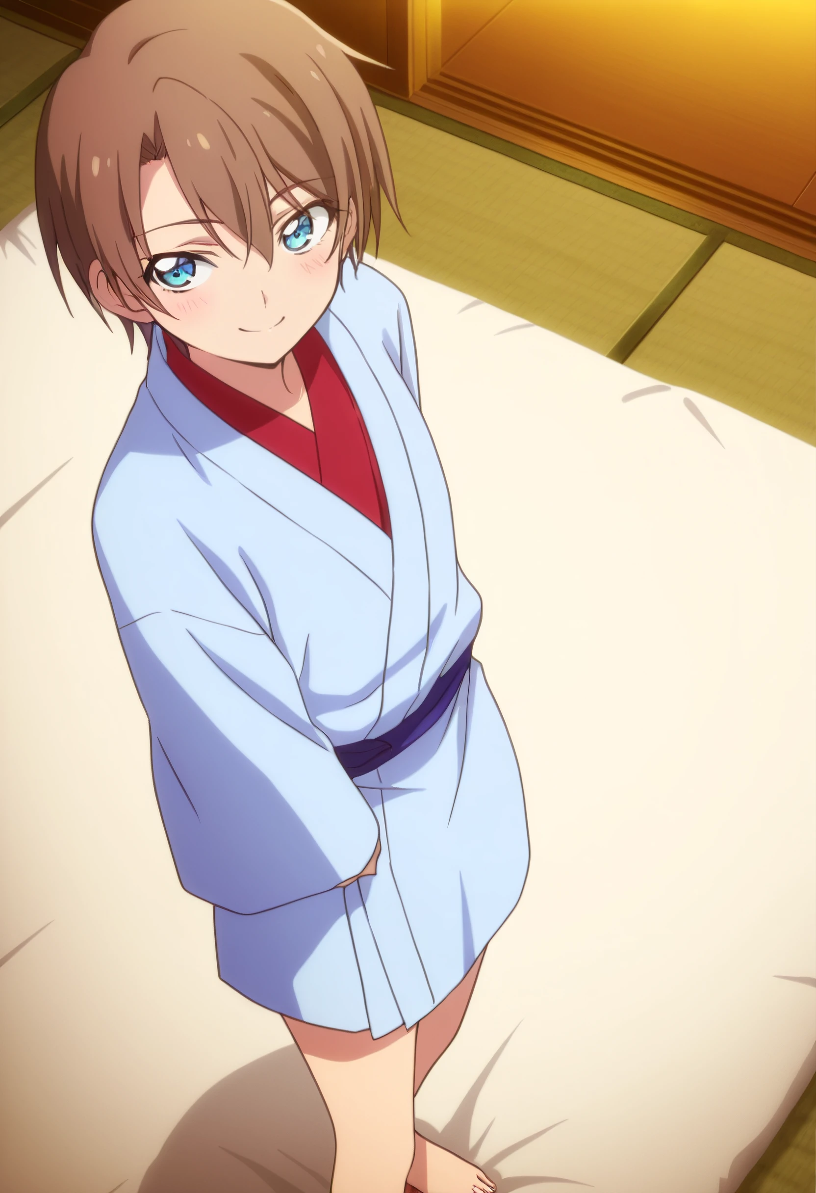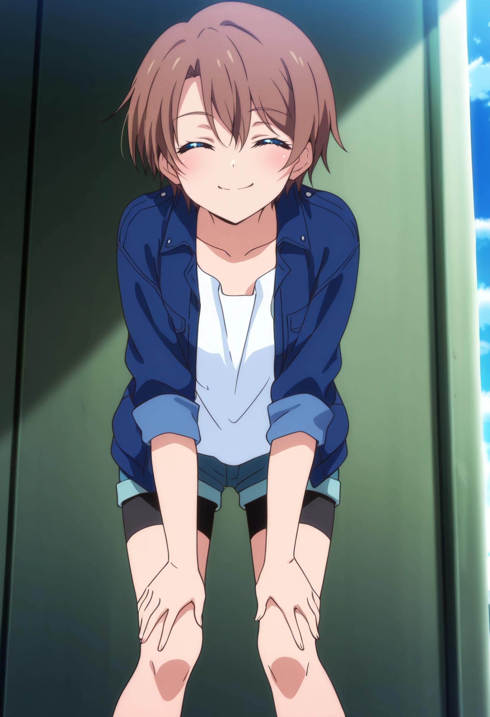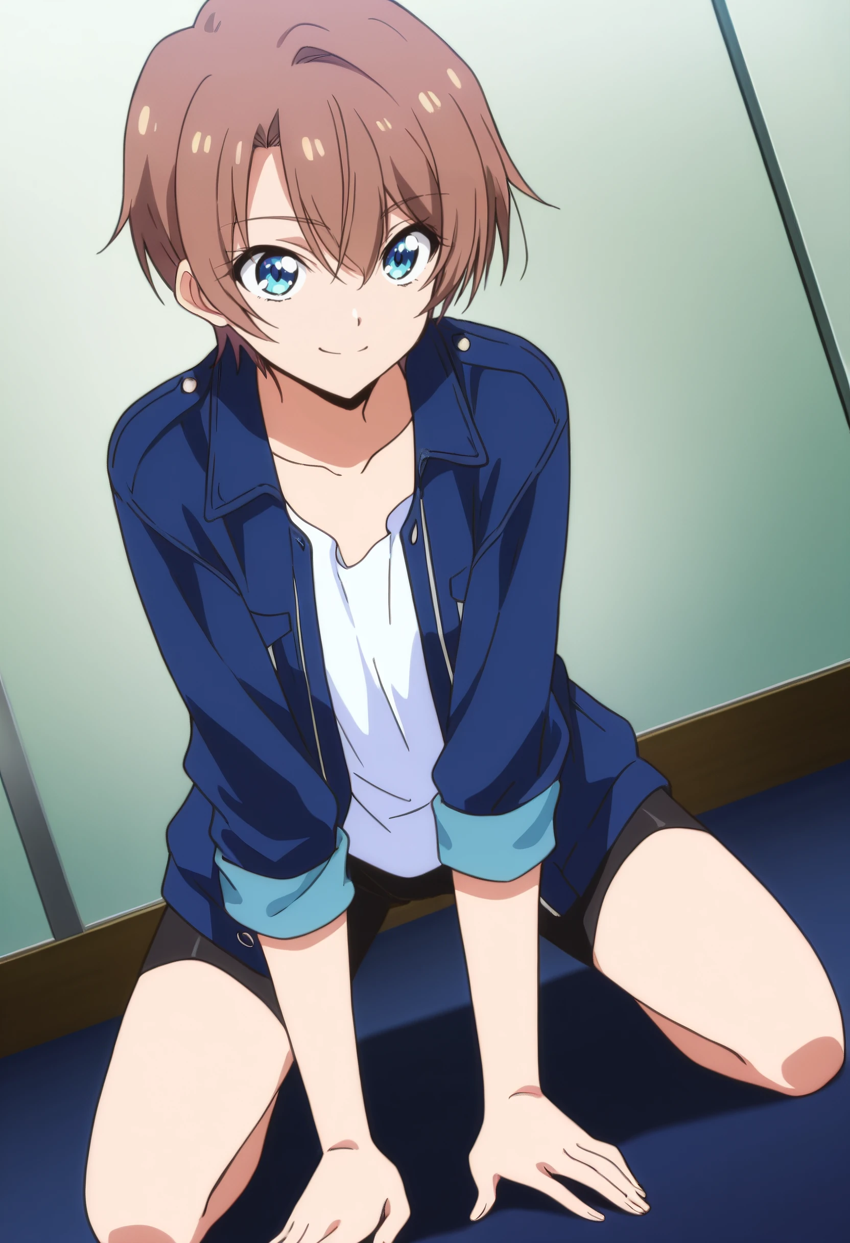 SMSYui, short hair, brown hair, blue eyes, bangs, eyebrows visible through hair, hair between eyes,