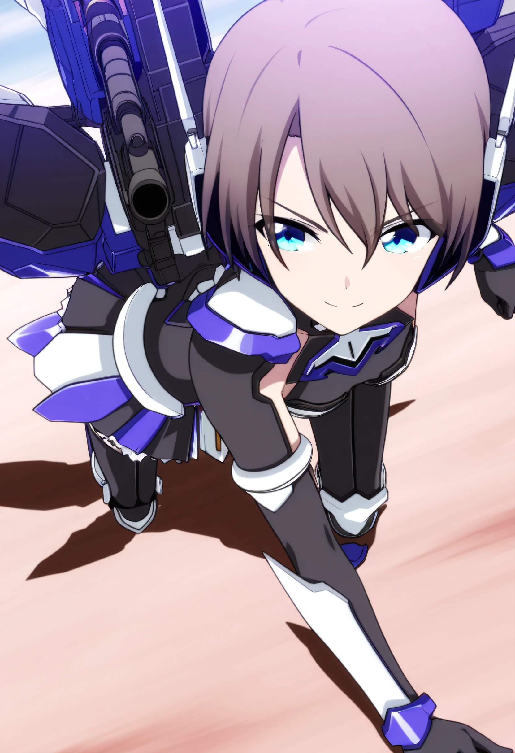 YuiMecha, gloves, weapon, mecha musume, armor, headgear, thighhighs, mecha, gun, elbow gloves, machinery, leotard, science fiction, skirt, cannon, rifle, black gloves, pilot suit, thrusters,