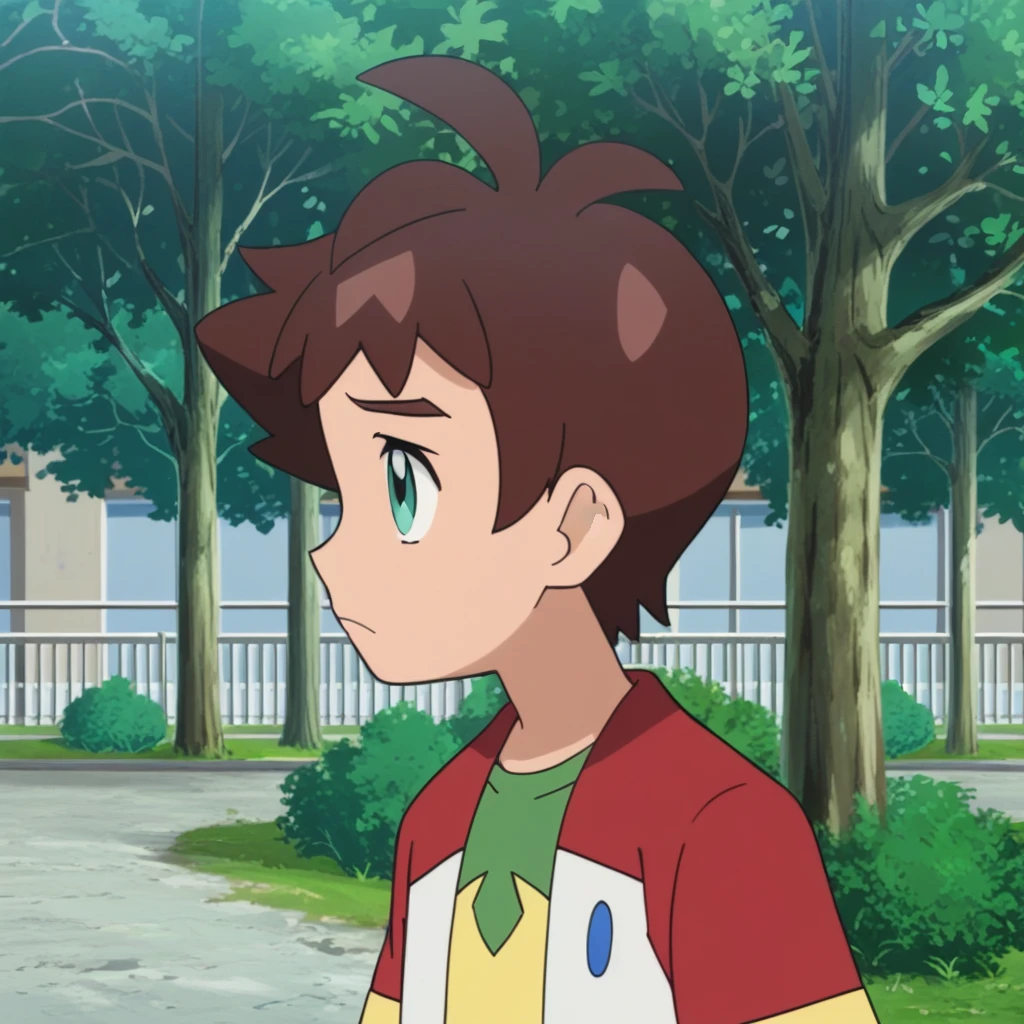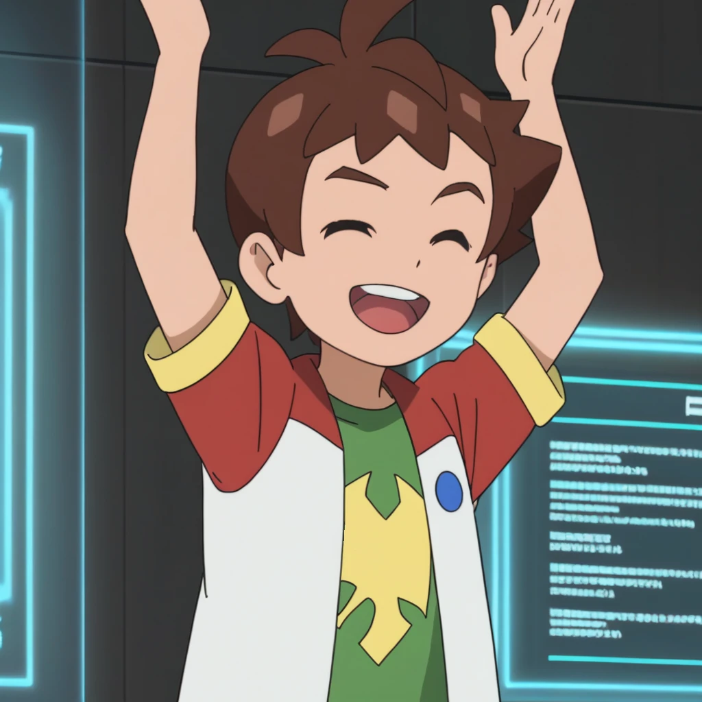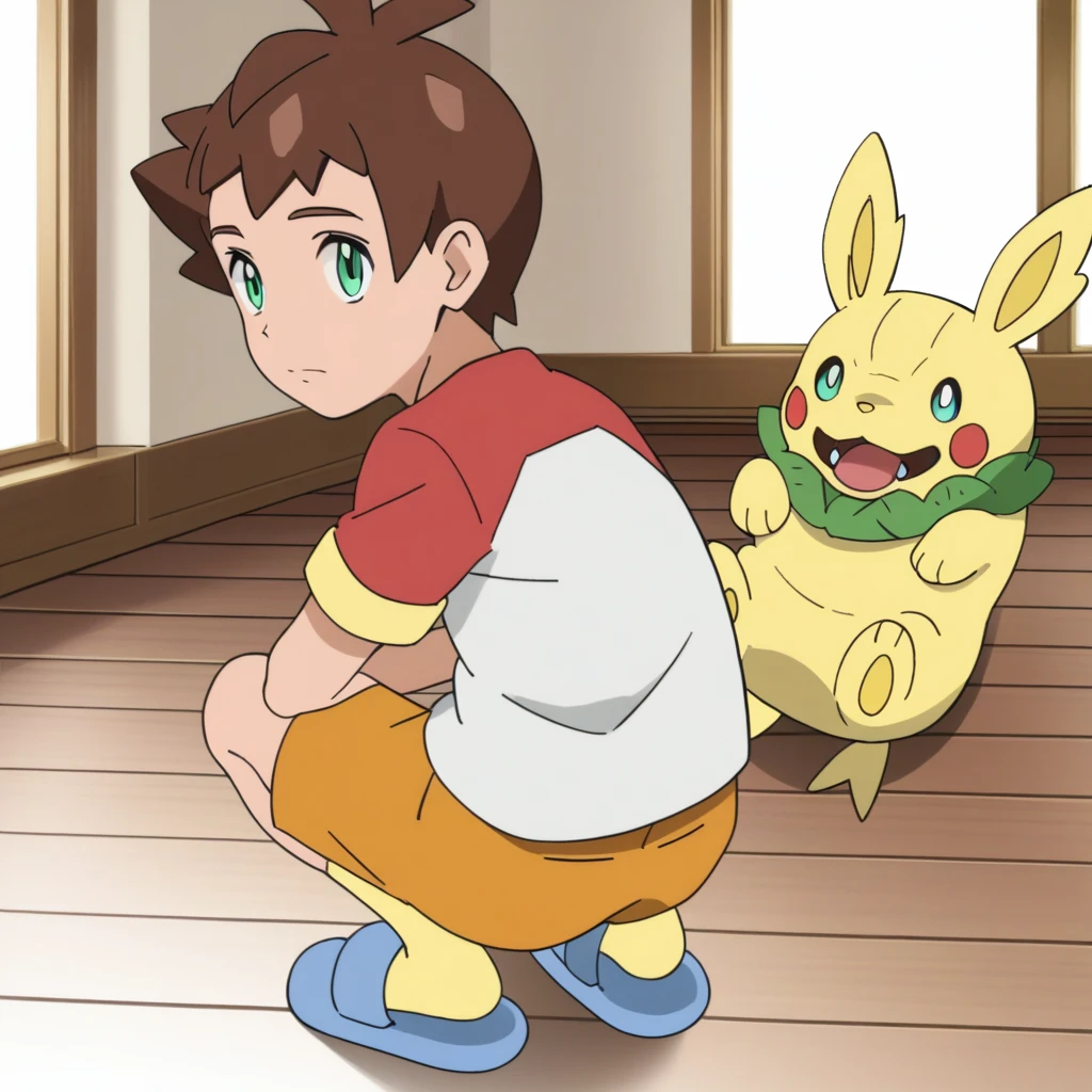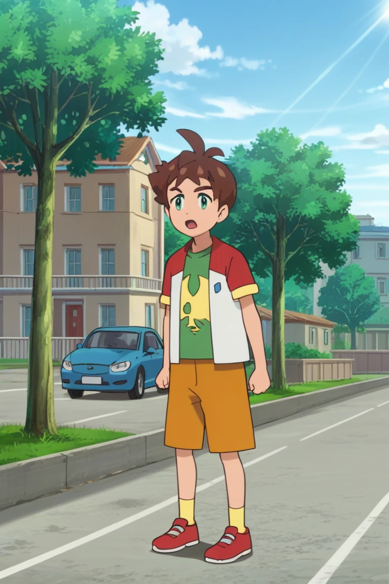 Prompts: male, brown hair, antenna hair, bangs, teal eyes, green shirt, print shirt, jacket, raglan sleeves, short sleeves, open clothes, orange shorts, yellow socks, red footwear