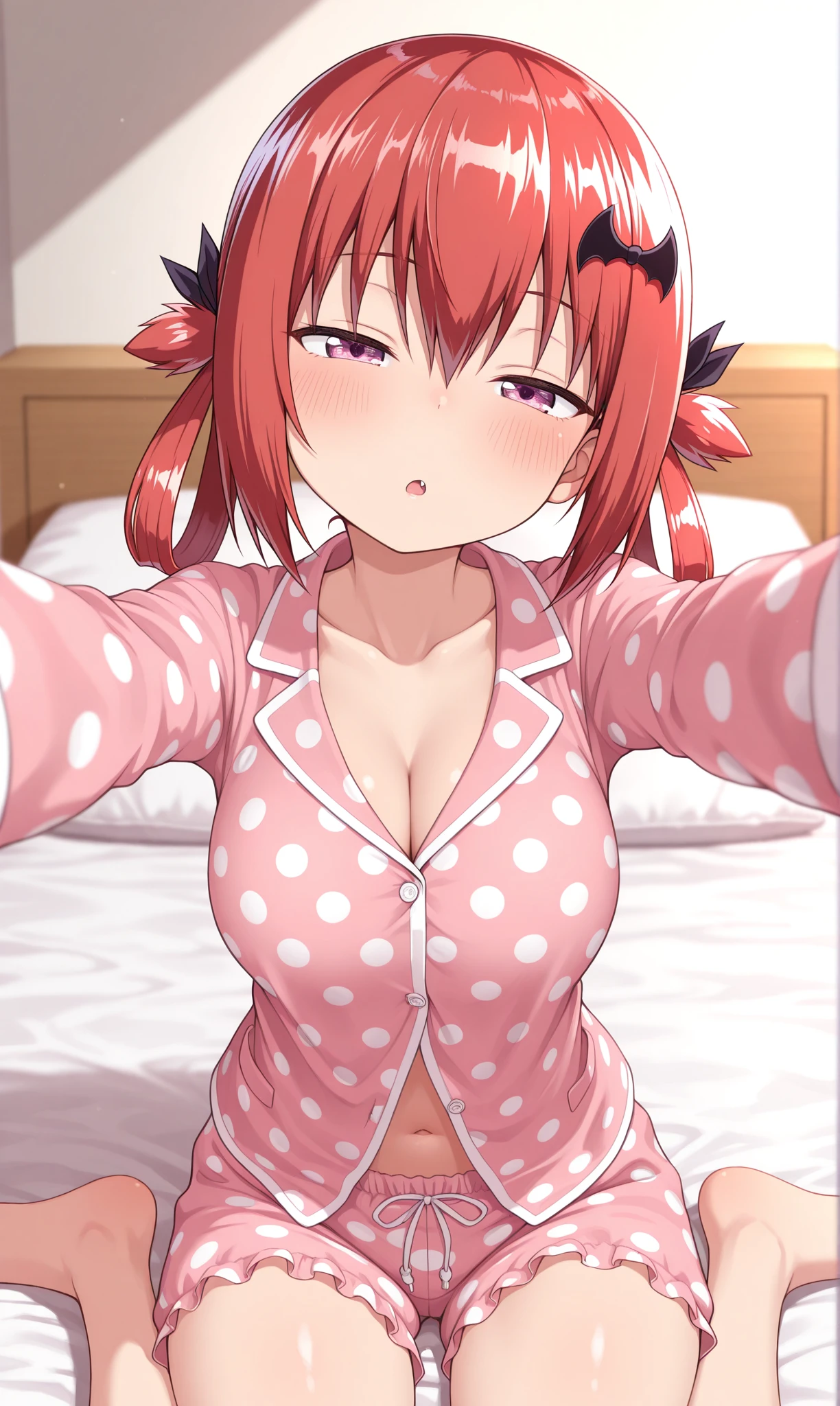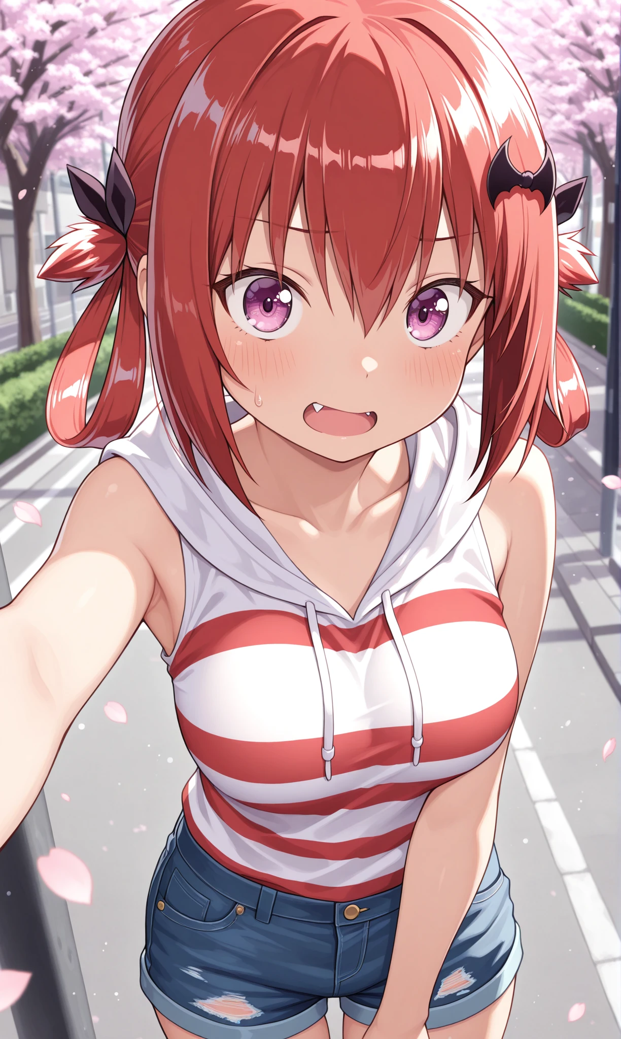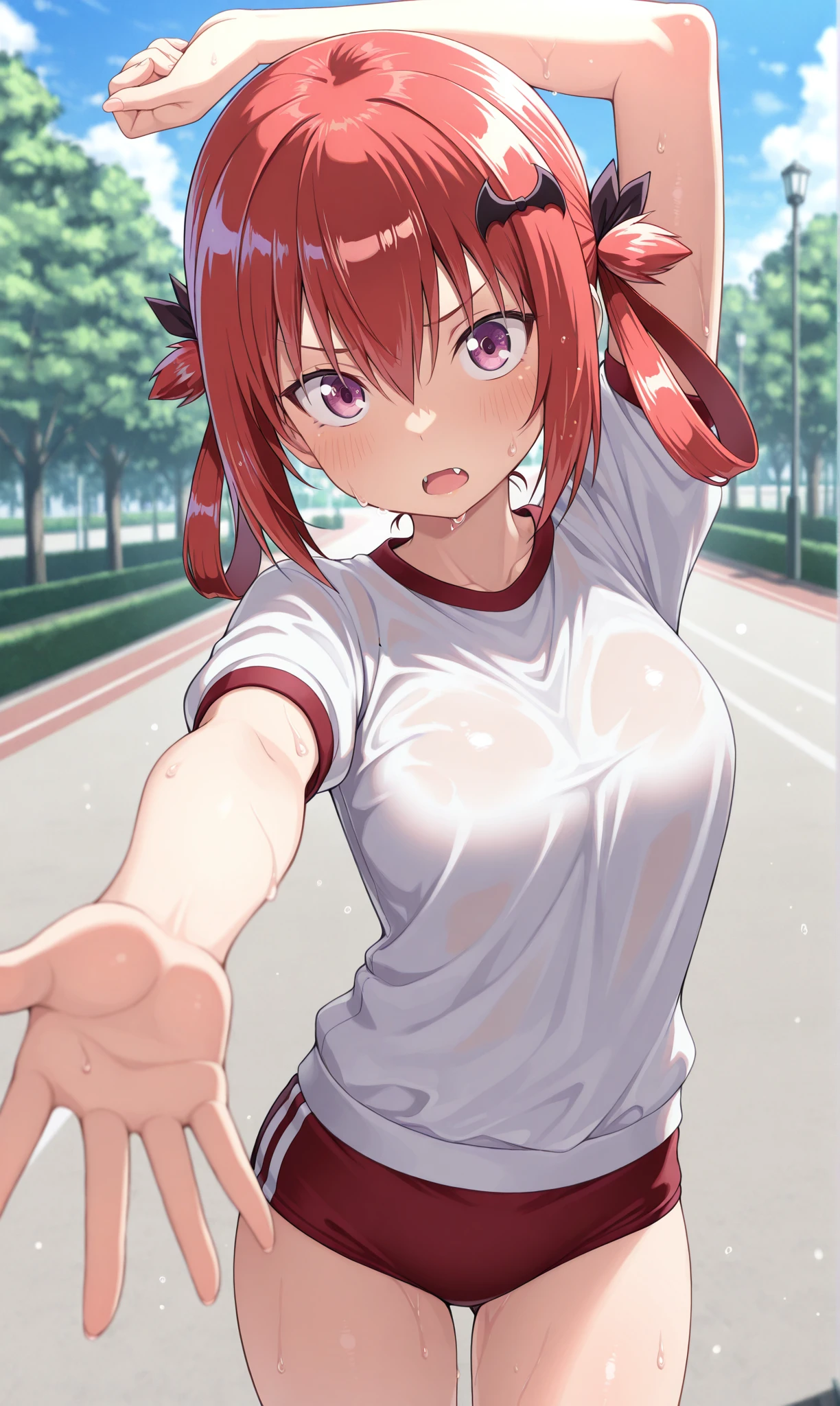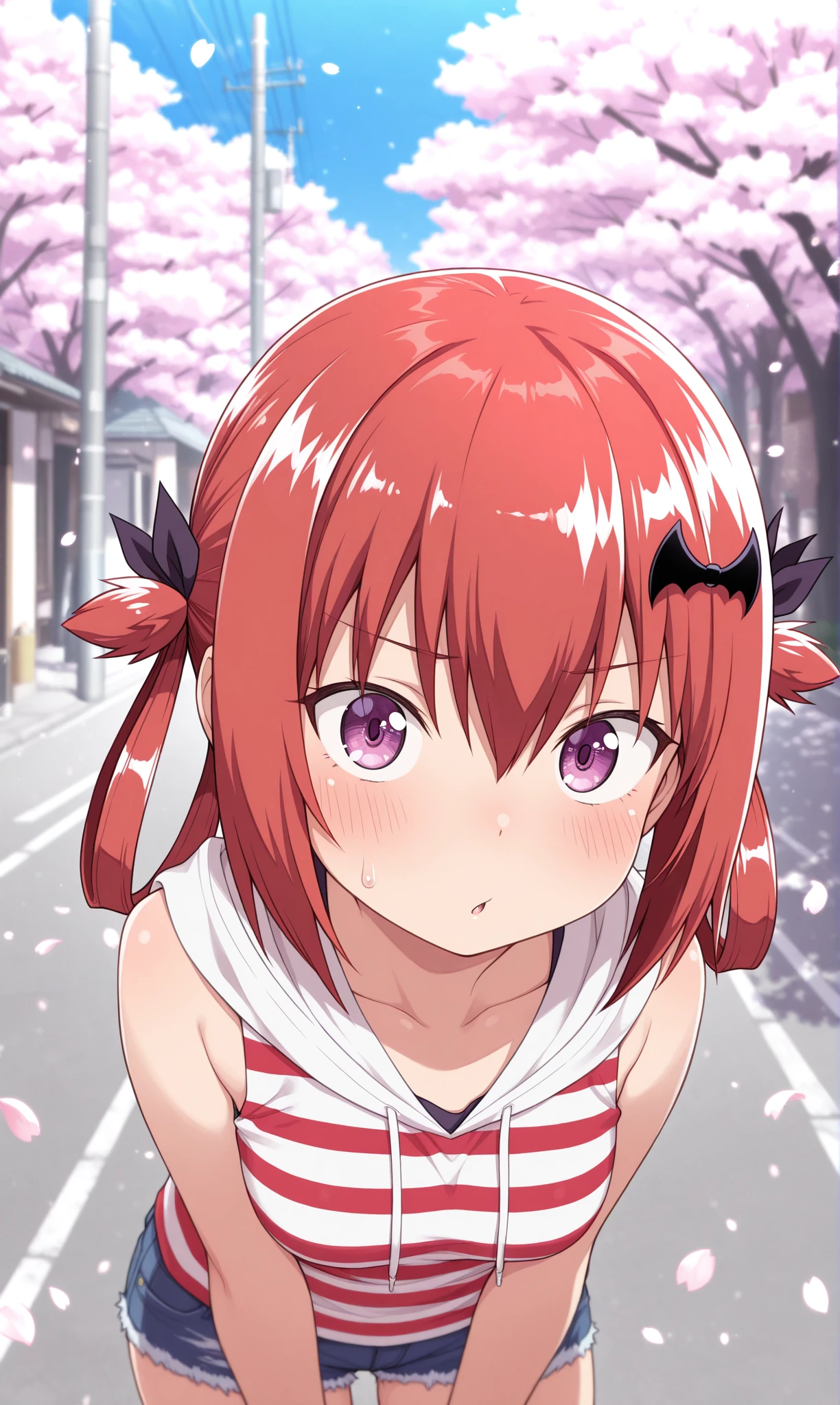 satanichia kurumizawa mcdowell, purple eyes, red hair, sidelocks, hair between eyes, red hair, hair ornament, bat hair ornament, hair rings