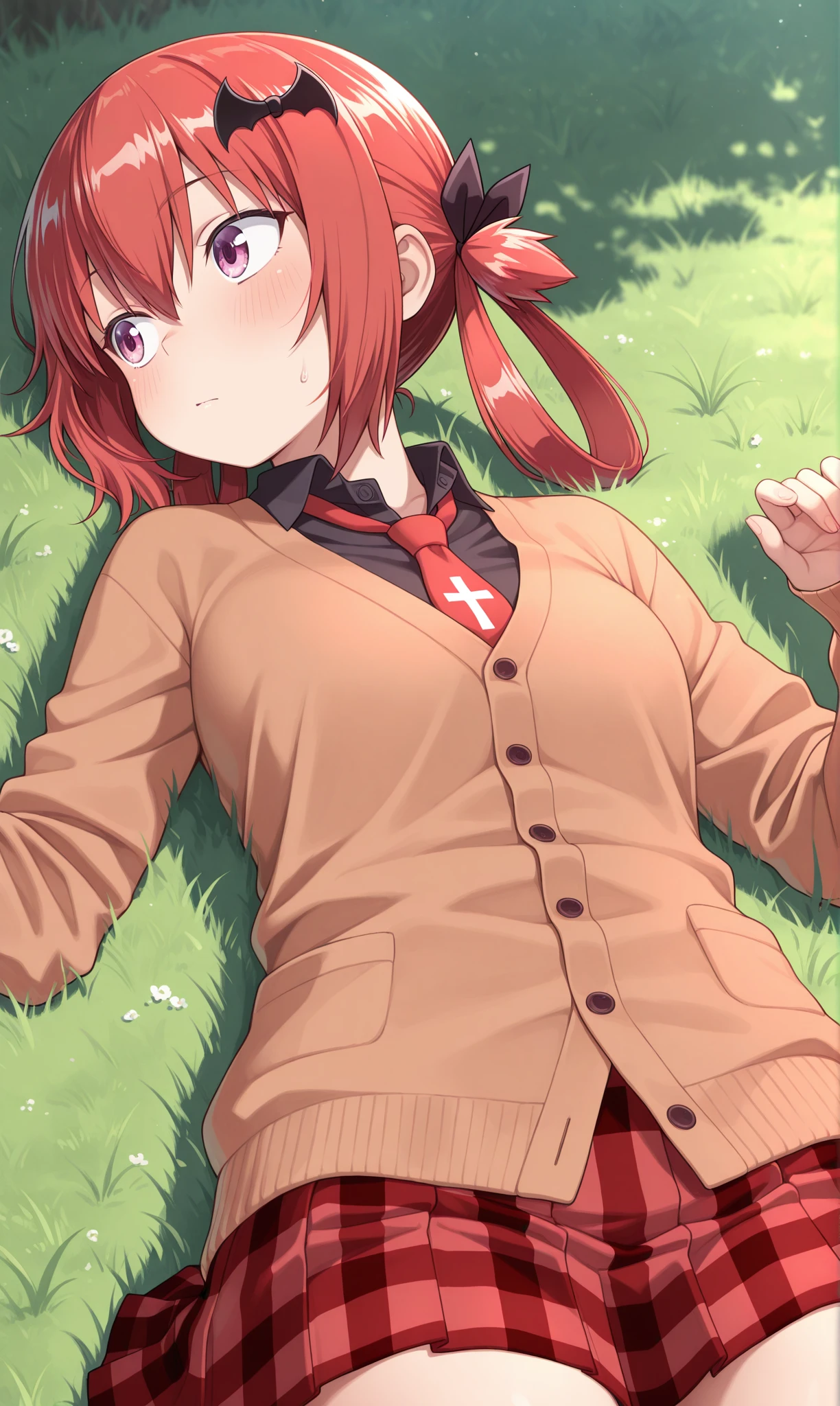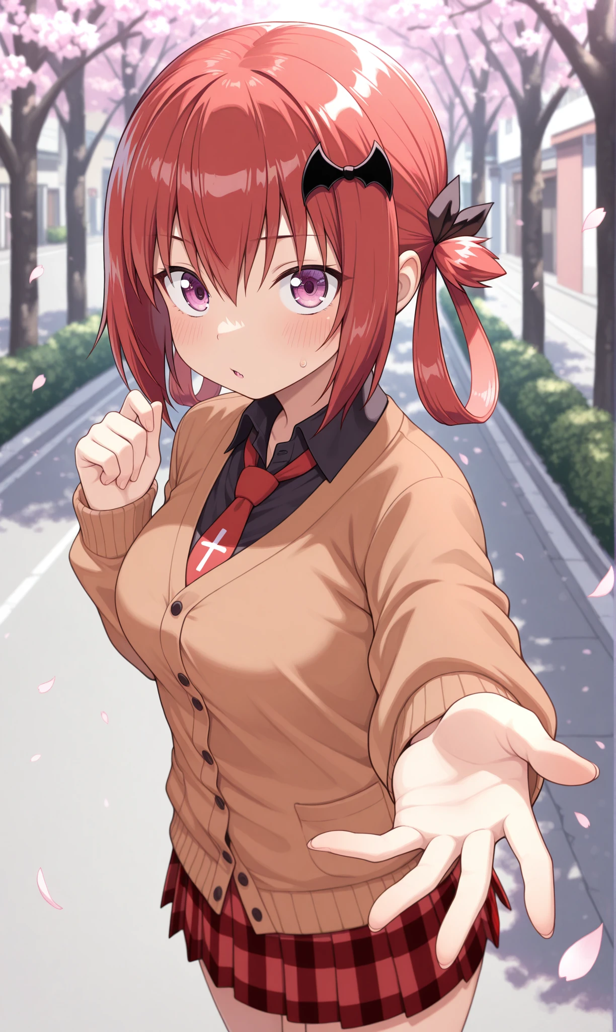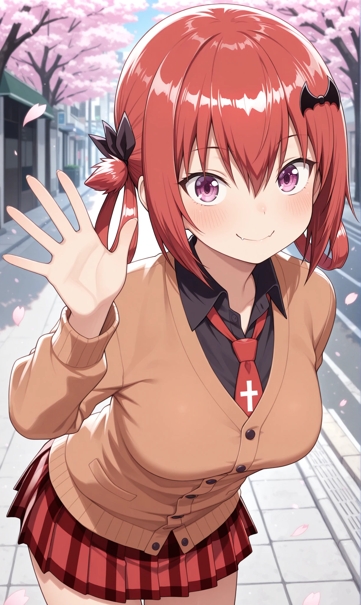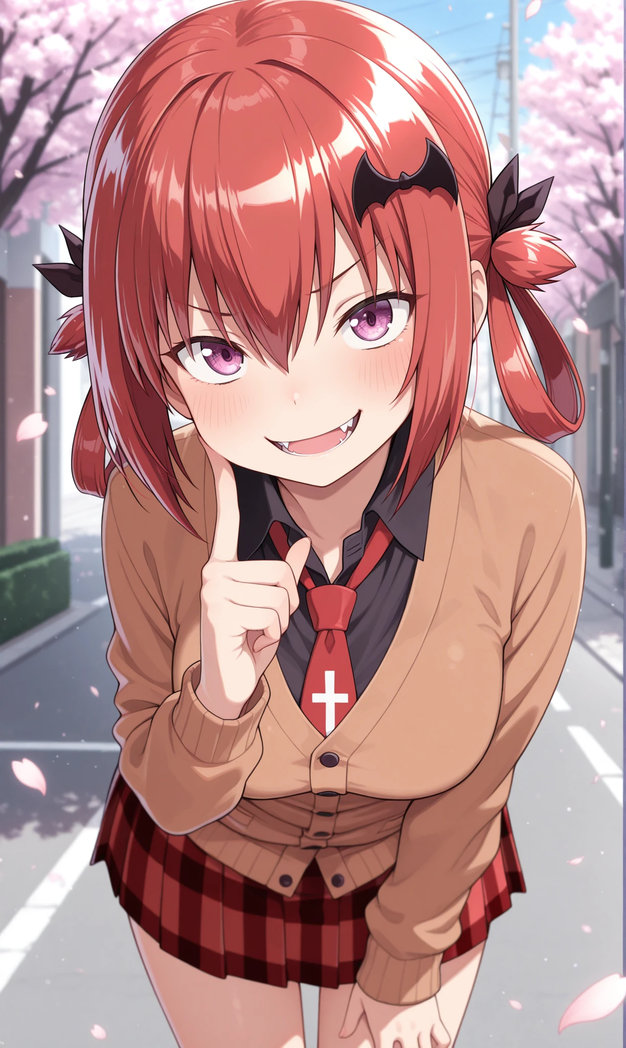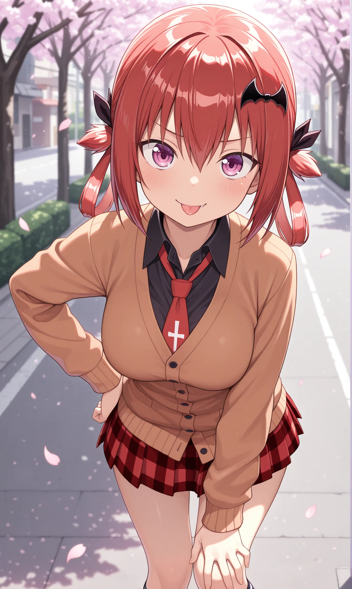 black shirt, collared shirt, brown cardigan, buttons, red necktie, inverted cross, long sleeves, miniskirt, pleated skirt, red skirt, plaid skirt, black socks, striped socks, loafersDescription