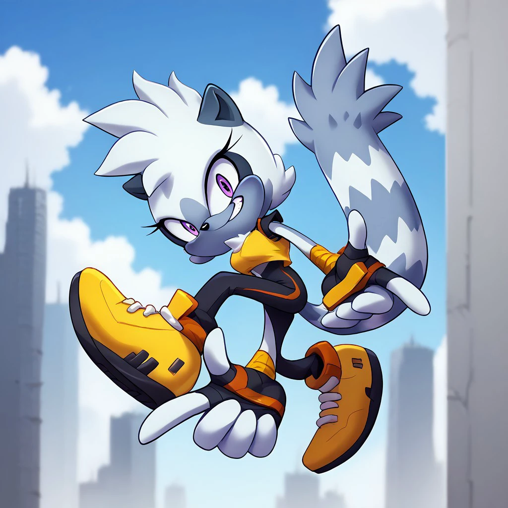 Tangle the Lemur, gray fur, purple eyes, long white and gray tail, yellow crop top, black bodysuit, yellow shoes