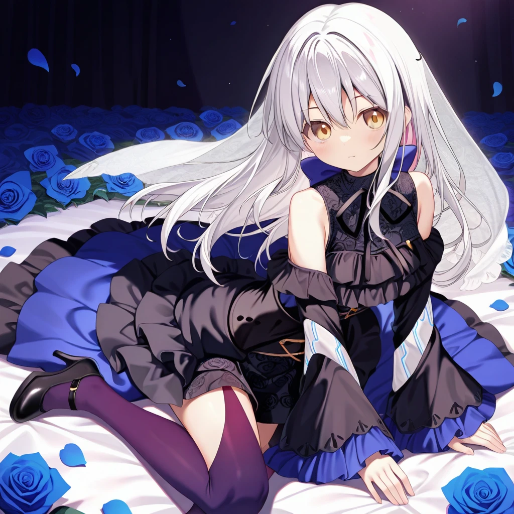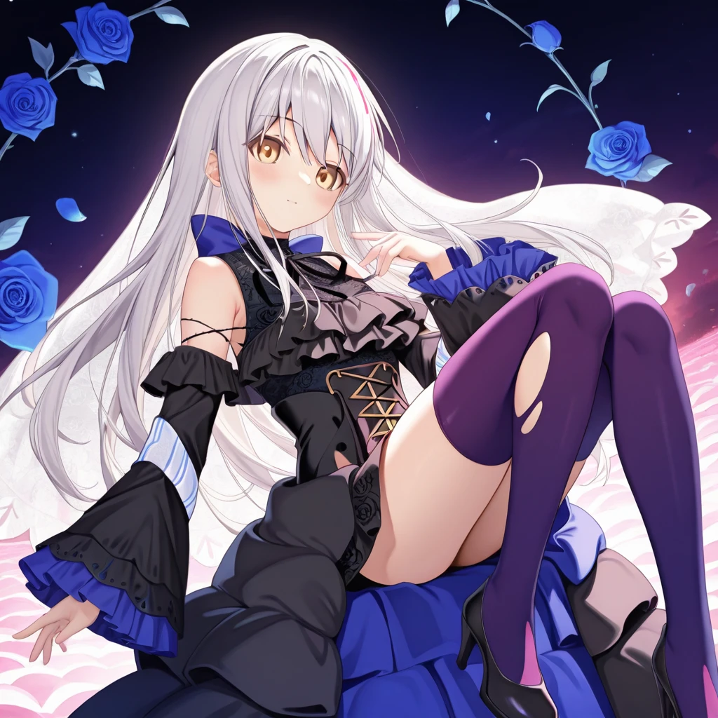 Rose\(Bang Dream AI\), 1girl, long hair, long sleeves, bow, ribbon, hair between eyes, yellow eyes, white hair, sidelocks, frills, detached sleeves, wide sleeves, black dress, neck ribbon, black ribbon, frilled dress, frilled sleeves, veil, cross-laced clothes, two-tone dress, high-low dress, floral print, back neck bow, blue bow, layered dress, high heels, black heel, gradient thighhighs,