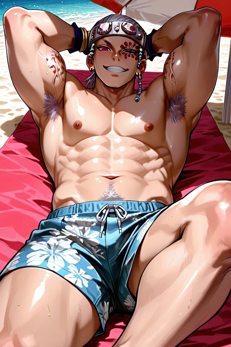 uzui tengen-1male focus, red_uzui tengen_faciial mark on single eye, reddish pink_uzui tengen_eyes, grey_uzui tengen_jewelry, grey_uzui tengen_short ponytail