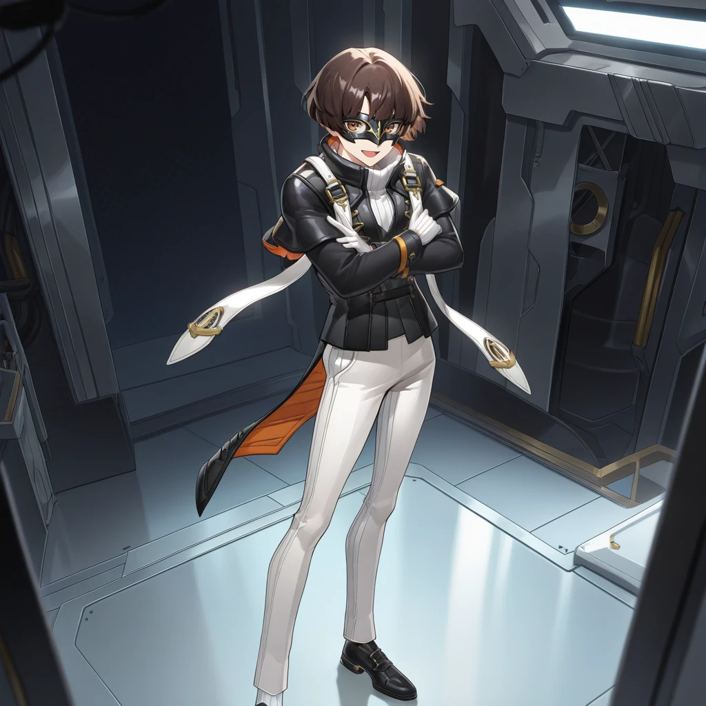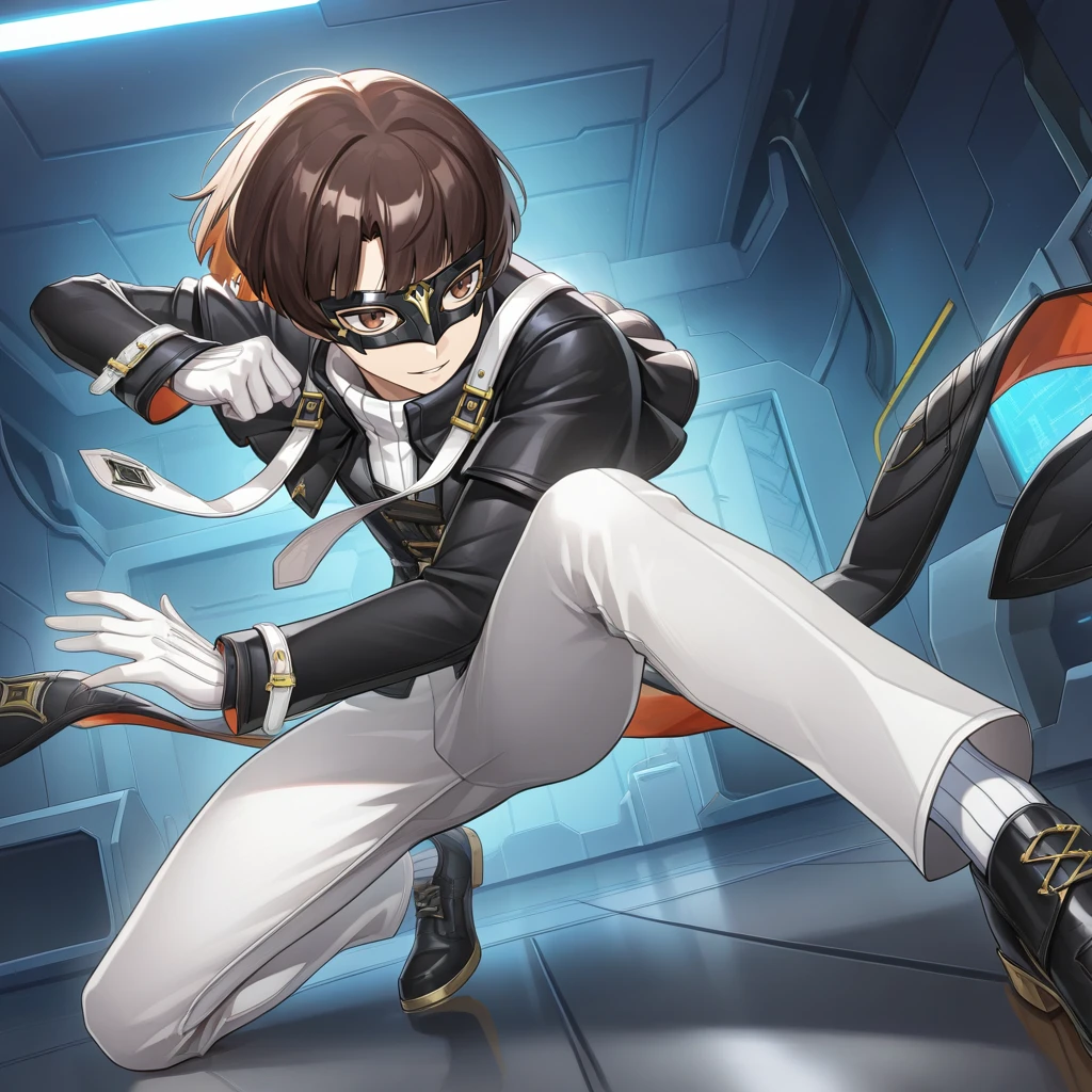 KiyoshiP5X, Kiy_Alt, curtained hair, brown hair, brown eyes, short hair, black jacket, white shirt, turtleneck shirt, striped shirt, white stole, stole, shoulder straps, white straps, black capelet, capelet, black sleeves, long sleeves, white gloves, gloves, arm strap, white pants, dress pants, coattails, striped pants, striped socks, white socks, black footwear, dress shoes, shoes, domino mask, eye mask, black mask,The results of your generations are dependent on the additional LoRAs, weights, and models you use, so it may not work or come out as consistent as my sample images.
