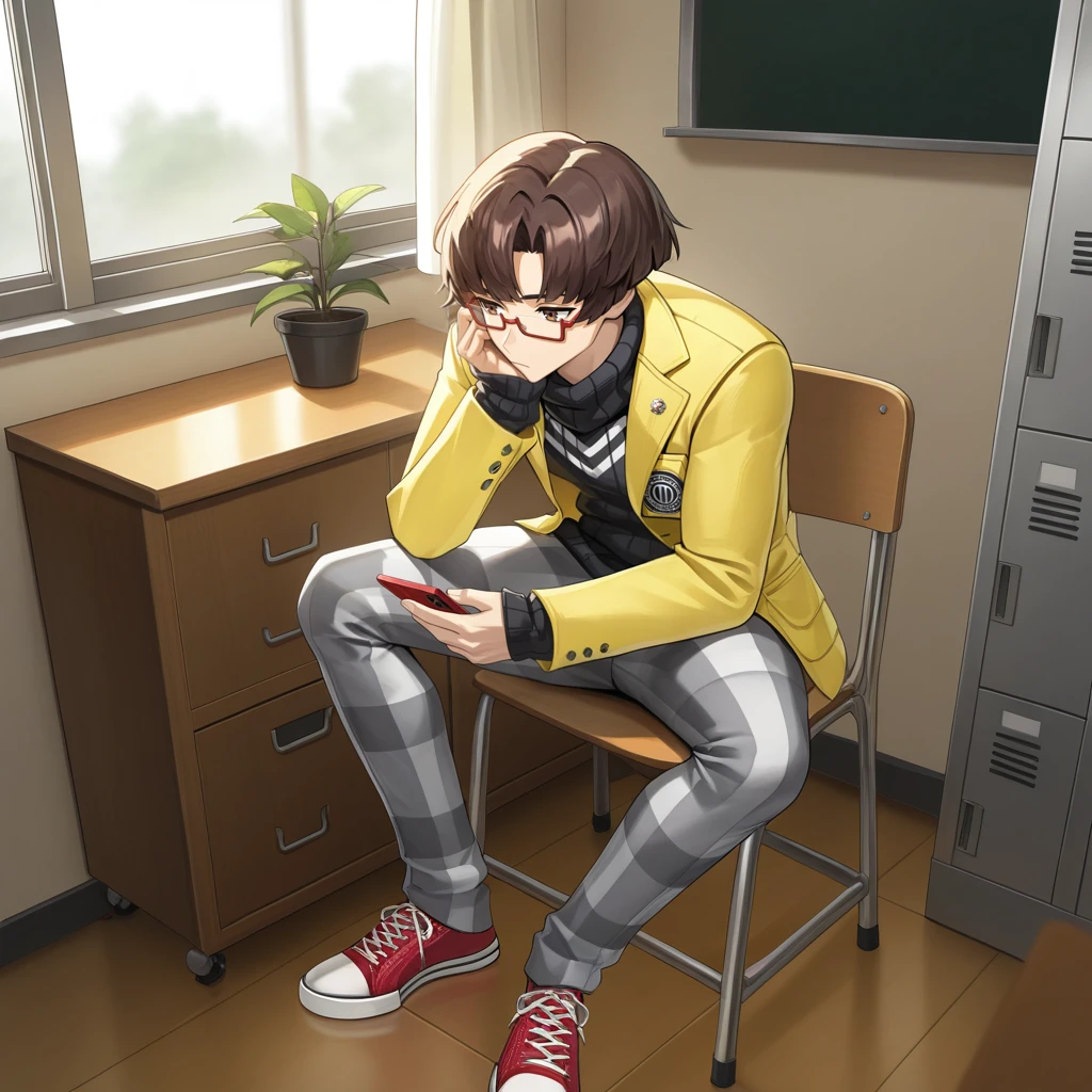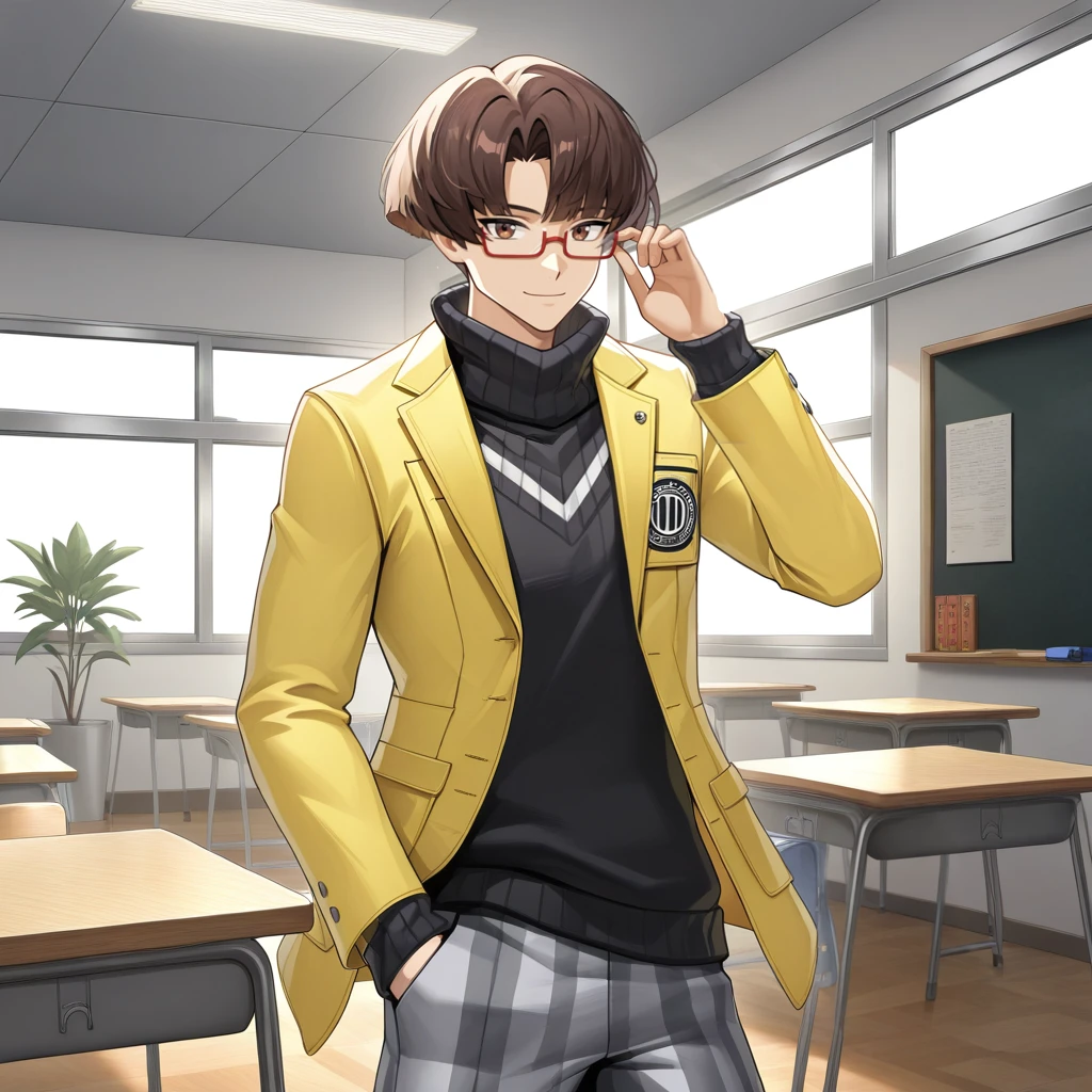 KiyoshiP5X, Kiy_Def, under-rim eyewear, glasses, red-framed eyewear, curtained hair, badge, brown hair, short hair, brown eyes, school uniform, black sweater, striped sweater, turtleneck sweater, yellow blazer, open blazer, yellow sleeves, long sleeves, layered sleeves, plaid pants, grey pants, emblem,Alt Outfit: