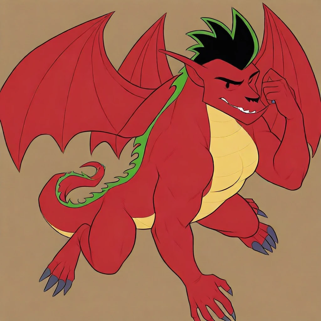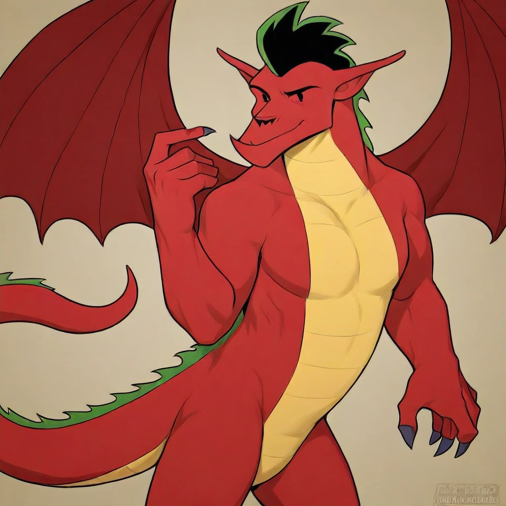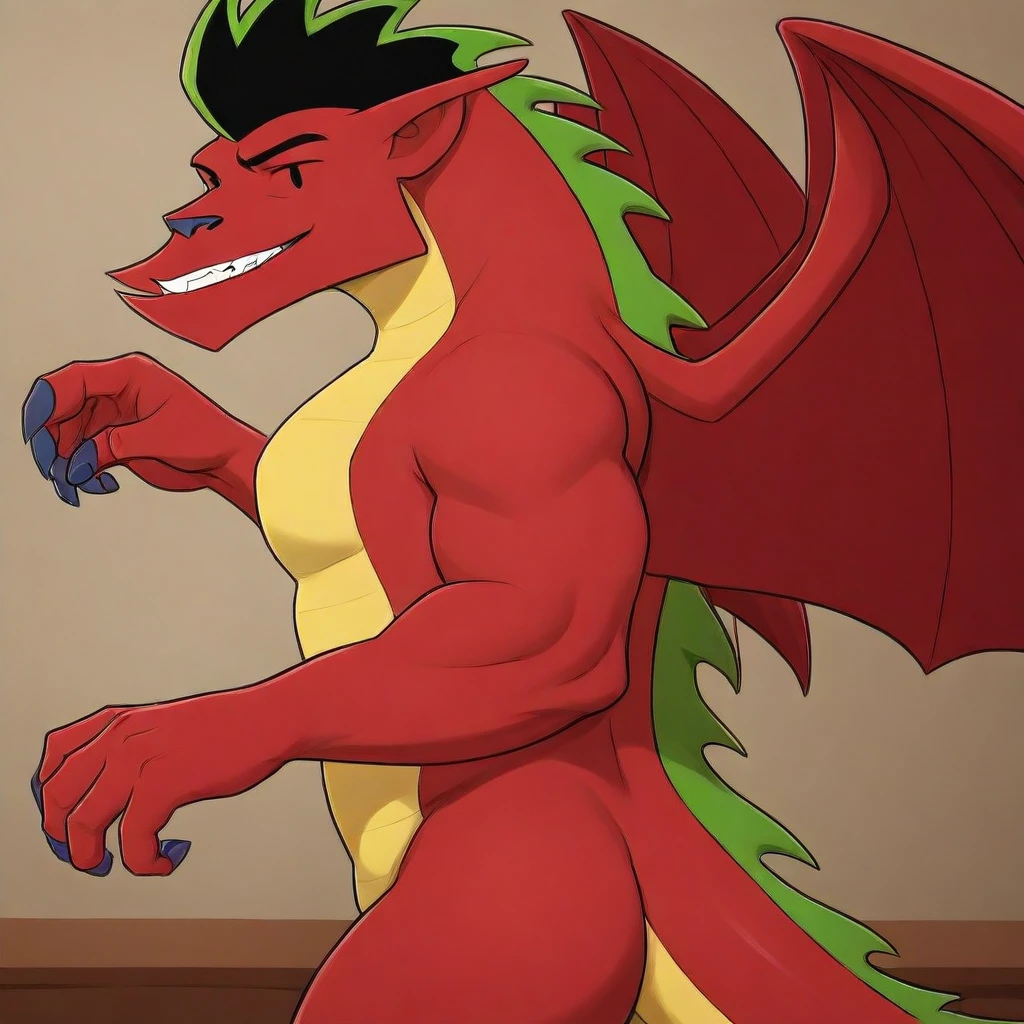 Jake Long, solo, male, furry, dragon, dragon wings, black eyes, black eyebrows, pointy ears, black and green hair, combed back, red skin, yellow chest and abdomen, claws, green dorsal crest, tail