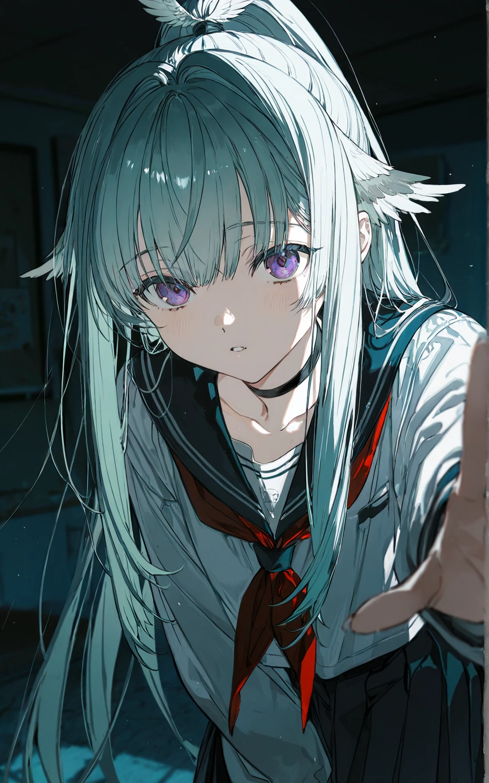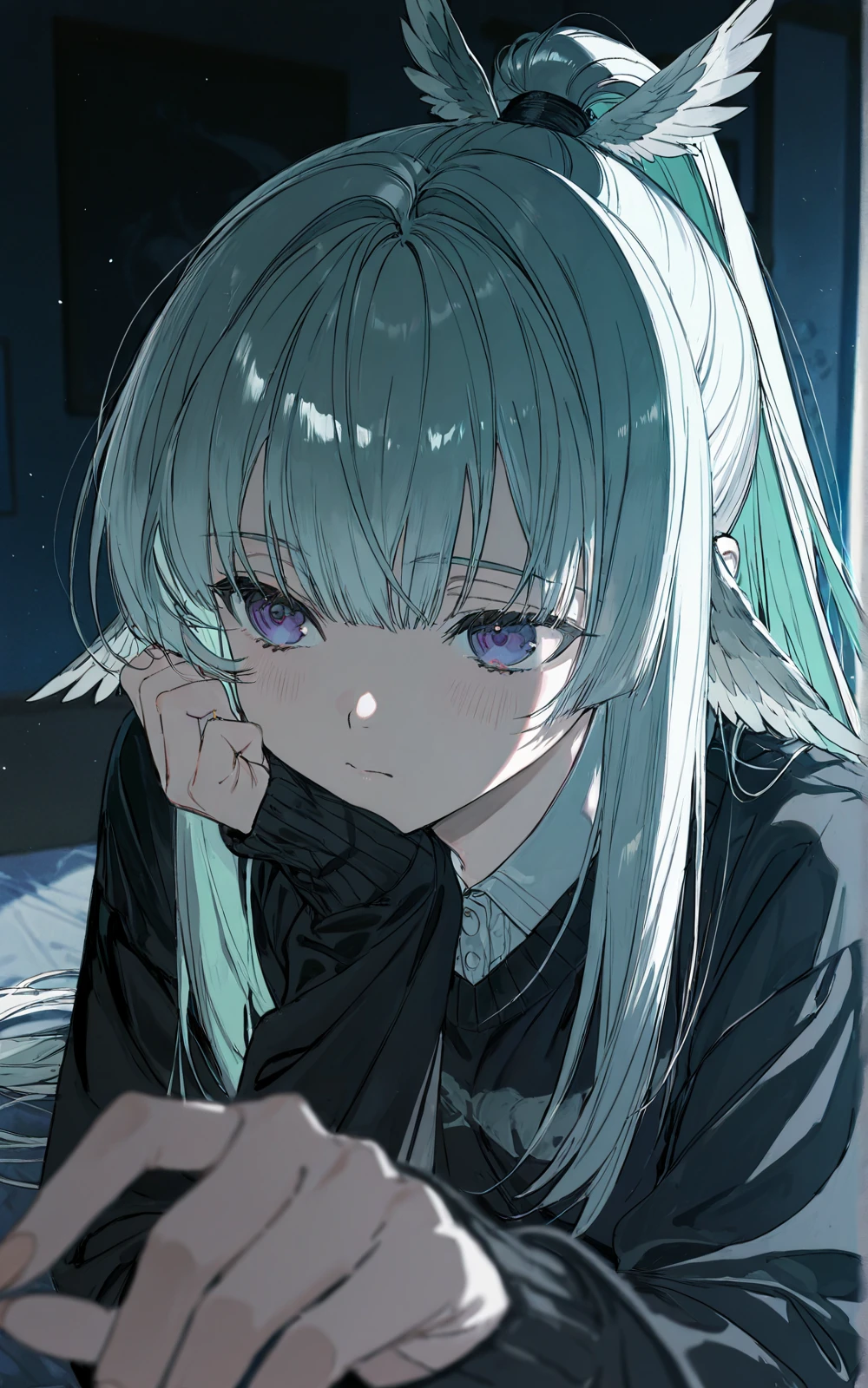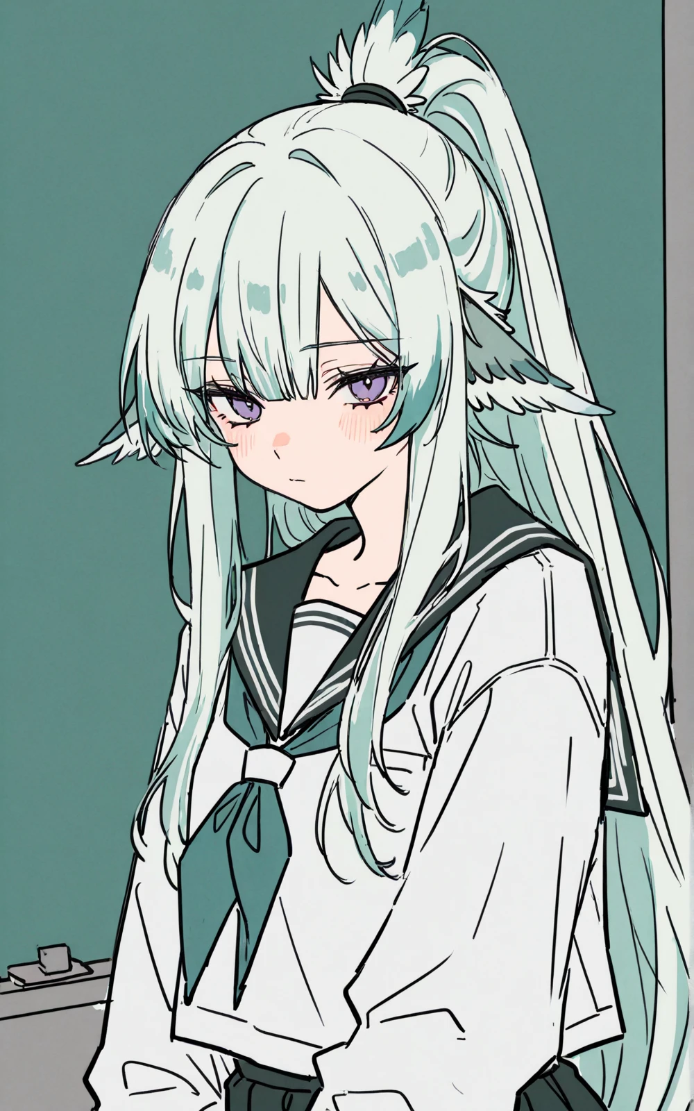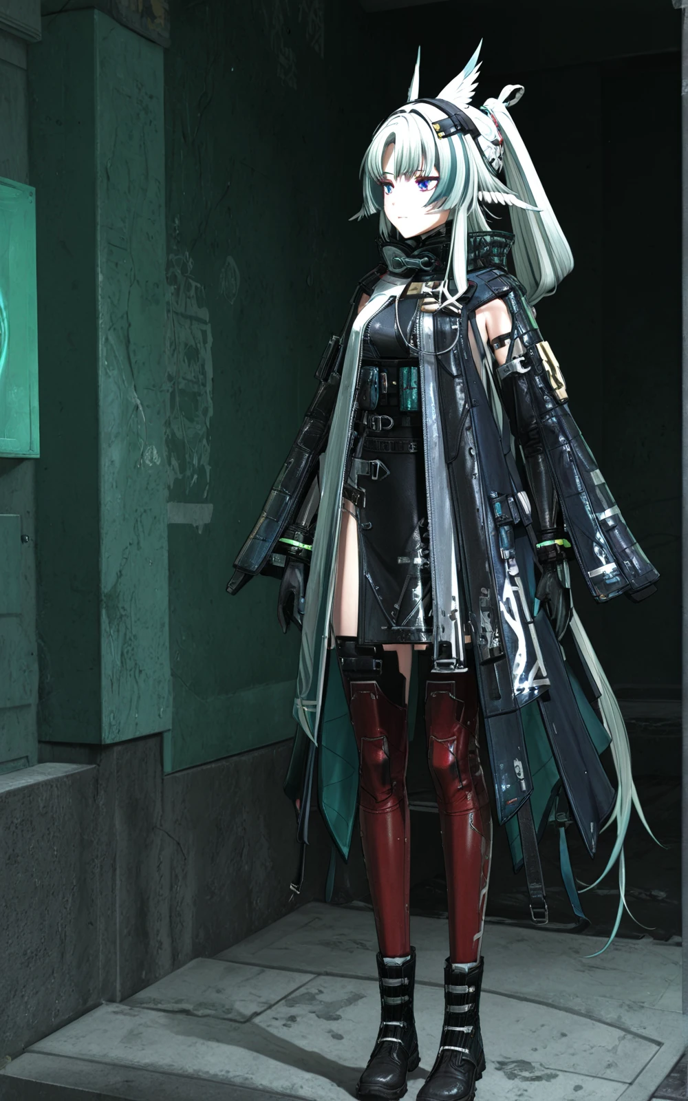 white-teal hair, high ponytail, feather ears, purple eyes,black techwear jacket, layered outfit, transparent panel,black cropped top, high slit skirt, utility belt, thigh holster,burgundy thigh-high boots, black combat boots