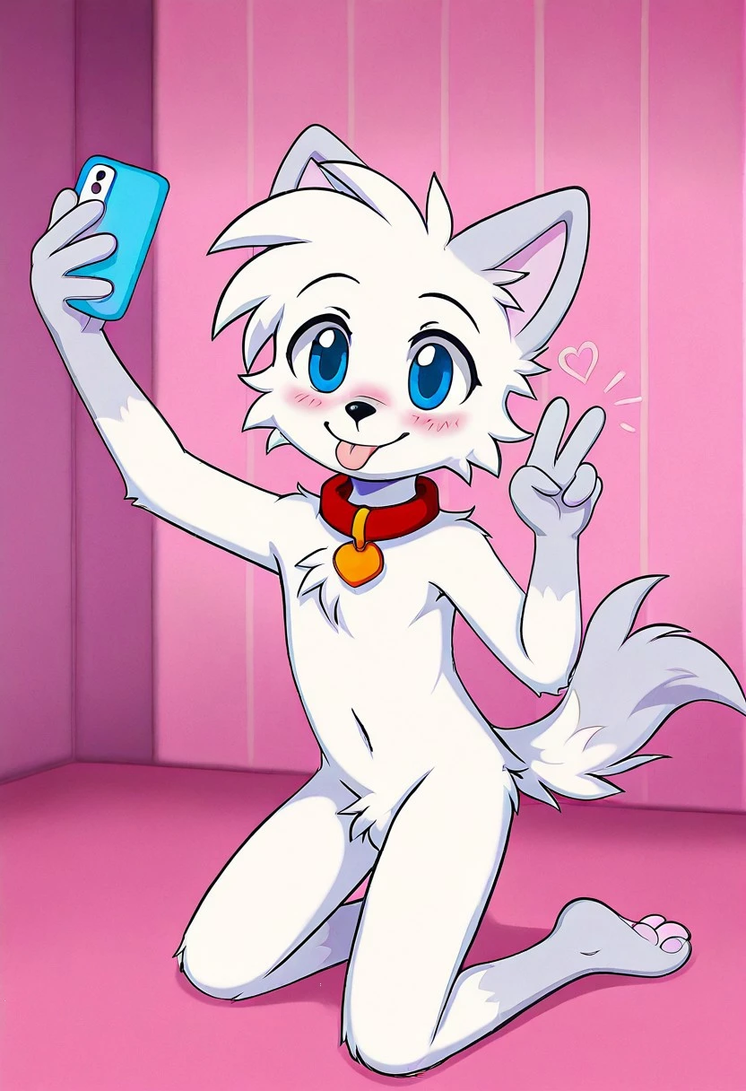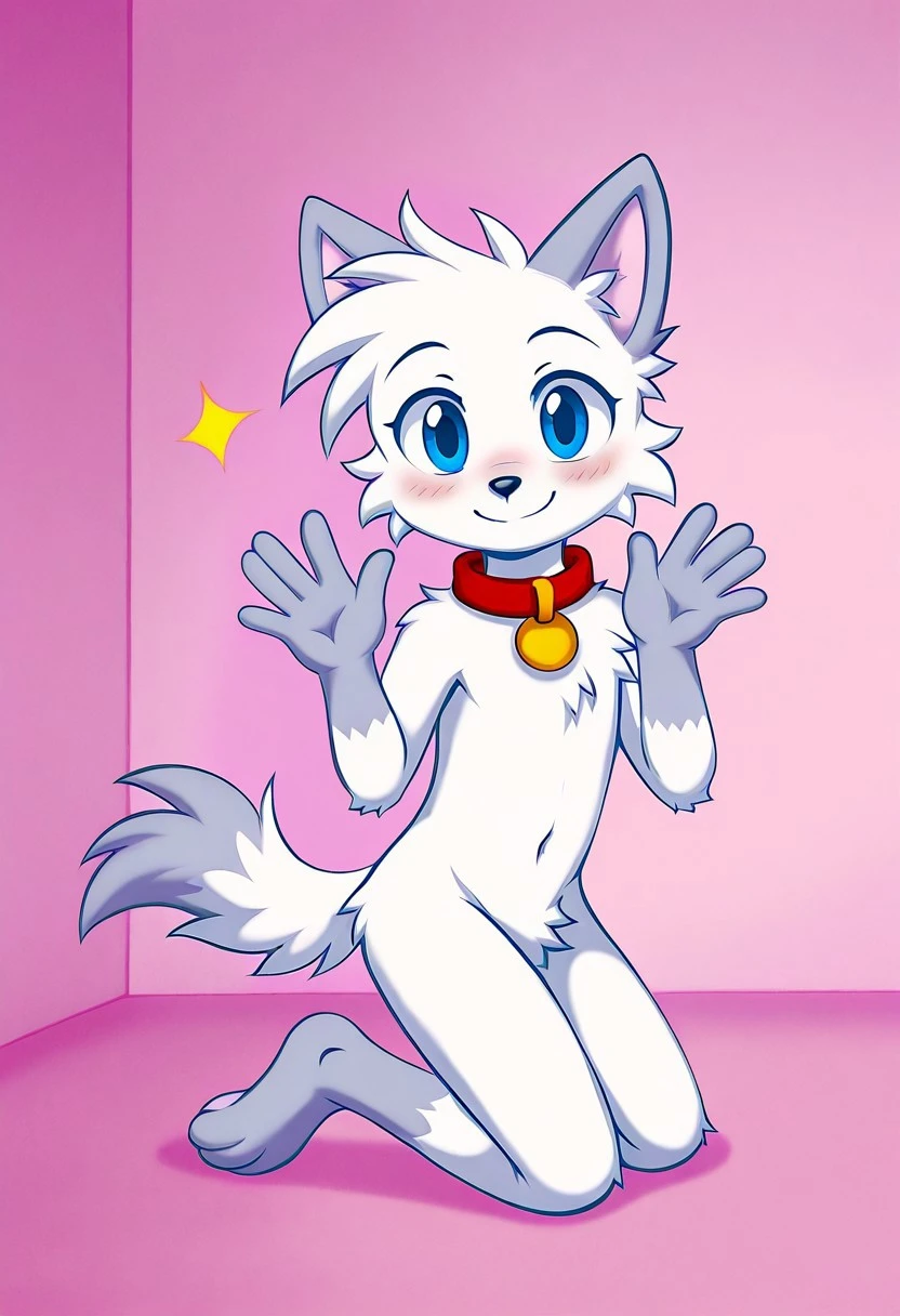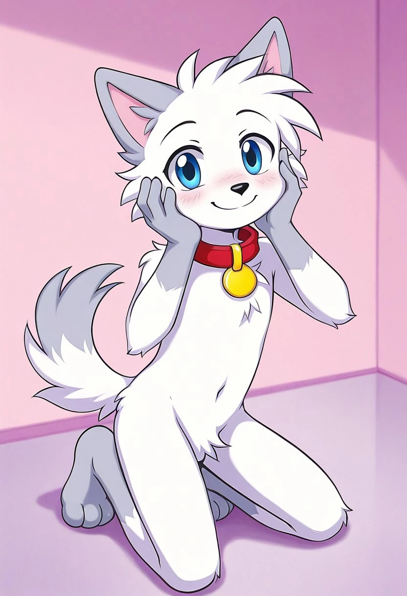 Alexy lobito,solo, anthro,Inside of the pink ears, wolf, male, young, blue eyes, red collar With circular gold plate, Grey tail tip, black nose, grey paws, grey hands, white fur, grey ears, pink pawdaws