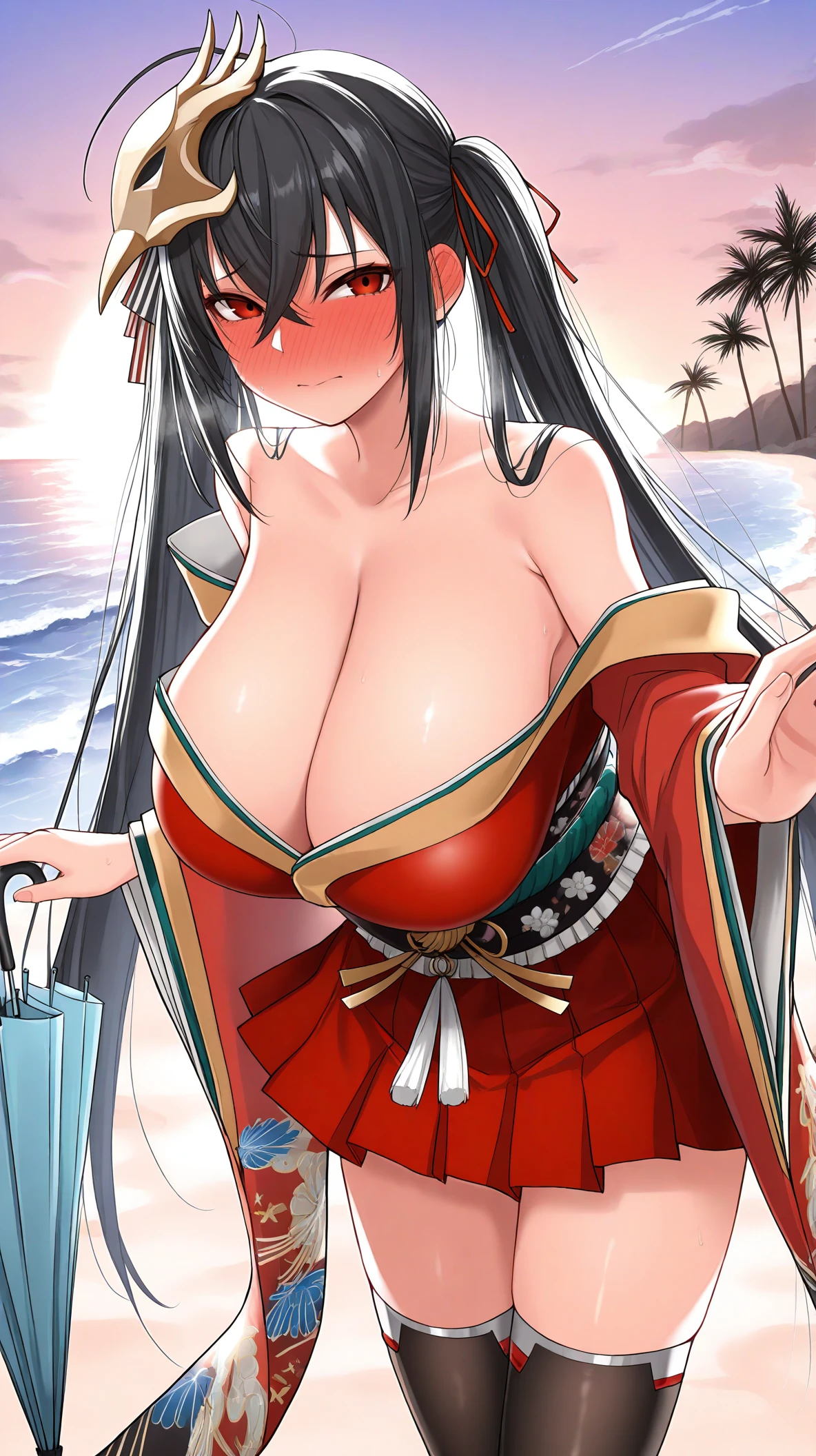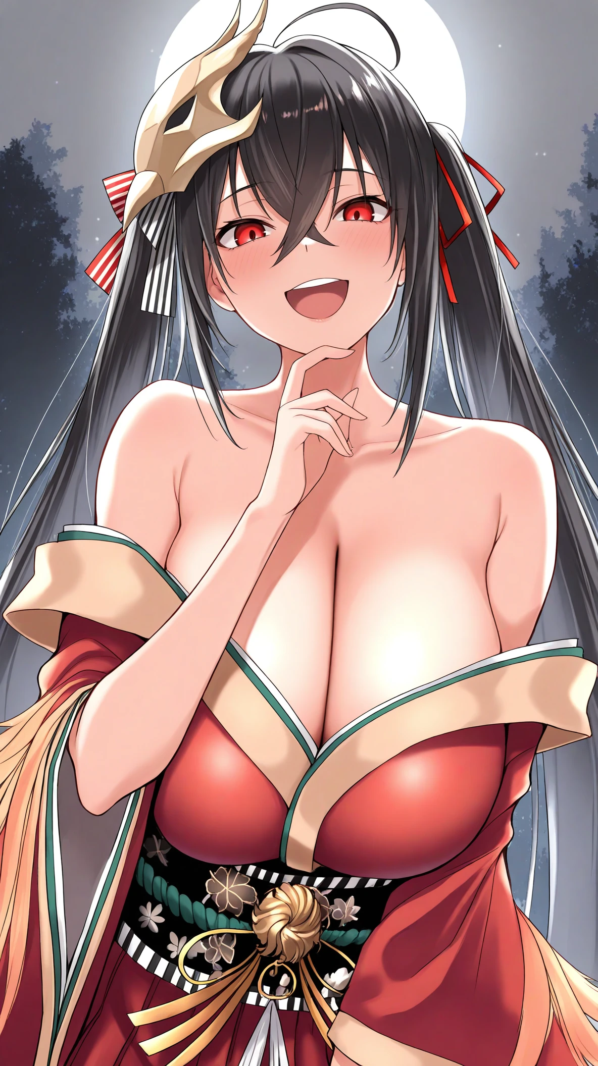 t4h4zl, red eyes, black hair, twintails, crossed bangs, ahoge, sidelocks, long hair, hair ornament, hair ribbon, mask on head, red kimono, off shoulder, bare shoulders, japanese clothes, feather-trimmed sleeves, wide sleeves, striped ribbon, sash, obi, tassel, hakama skirt, miniskirt, black thighhighs, huge breasts,
