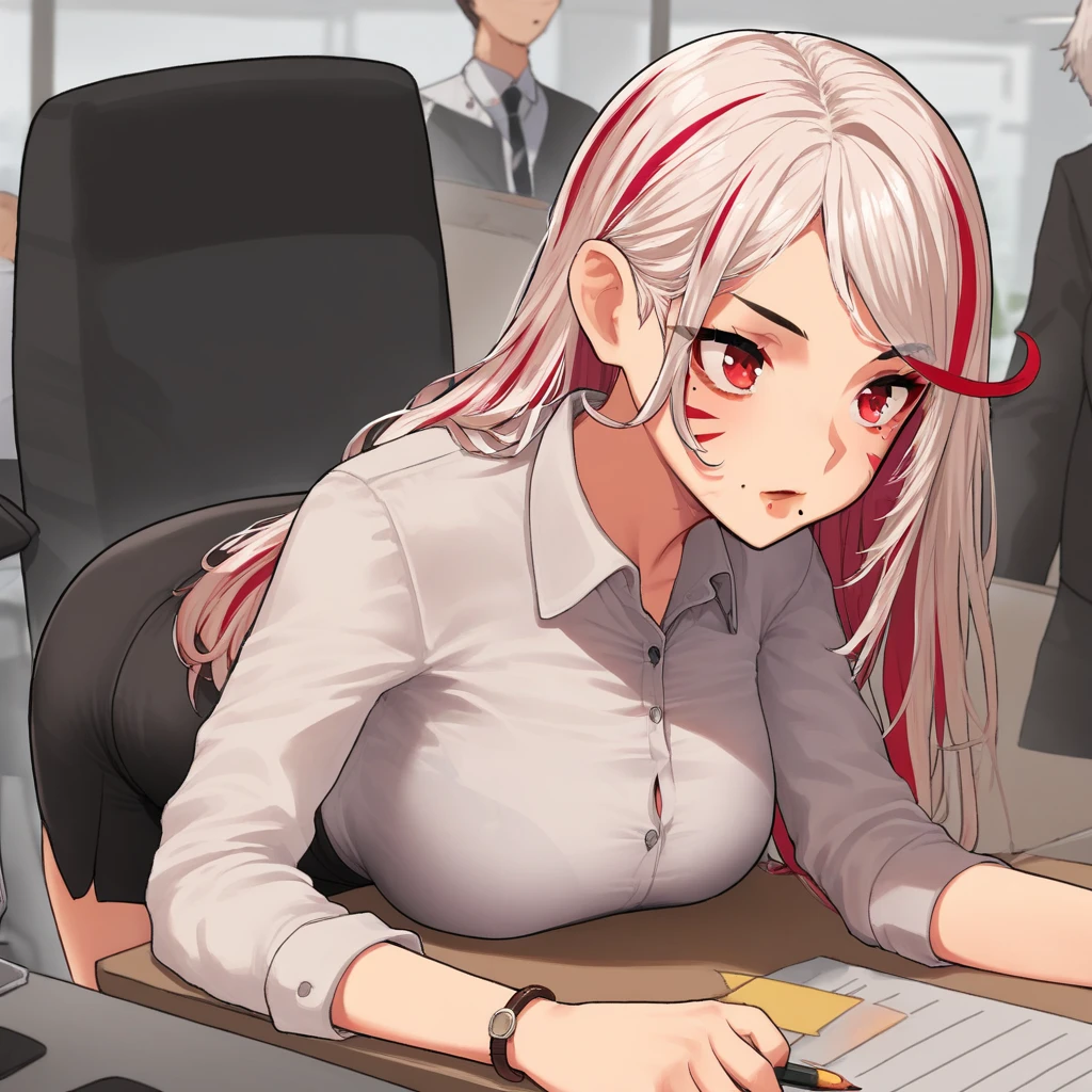 red eyes, white hair, red hair, streaked hair, multicolored hair, long hair, whisker markings, mole under mouth,