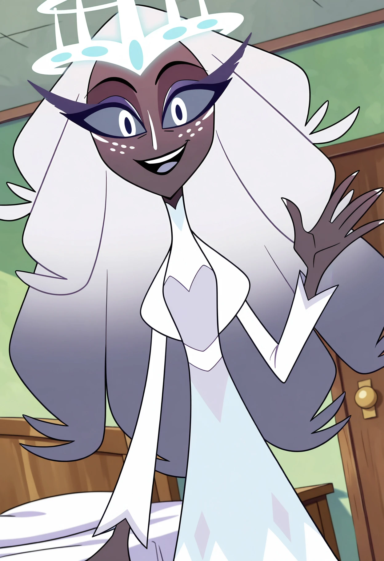 seraHH, grey skin, halo, long hair, grey hair, colored sclera, grey sclera, blue eyes, dress, long dress, white dress, long sleeves