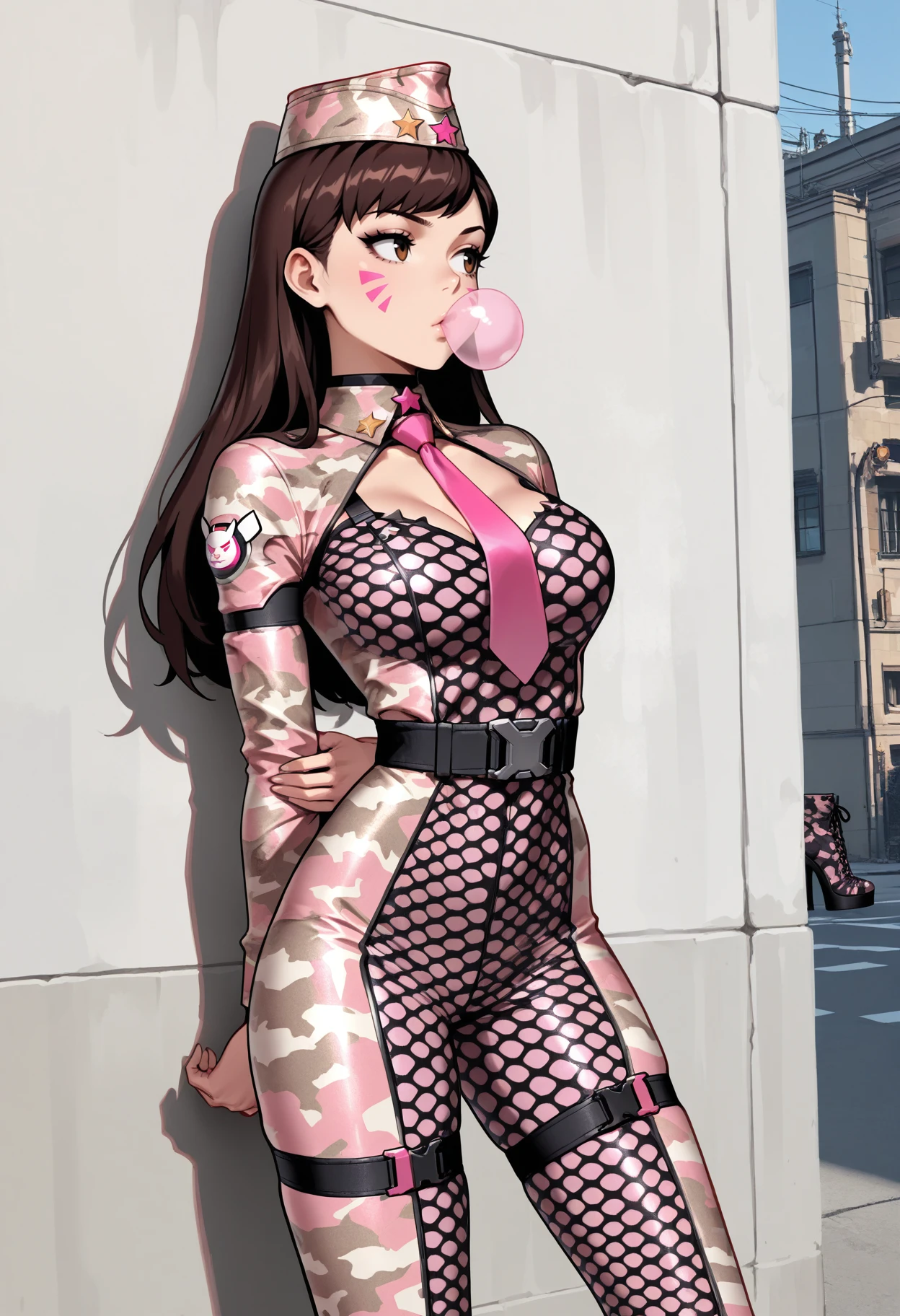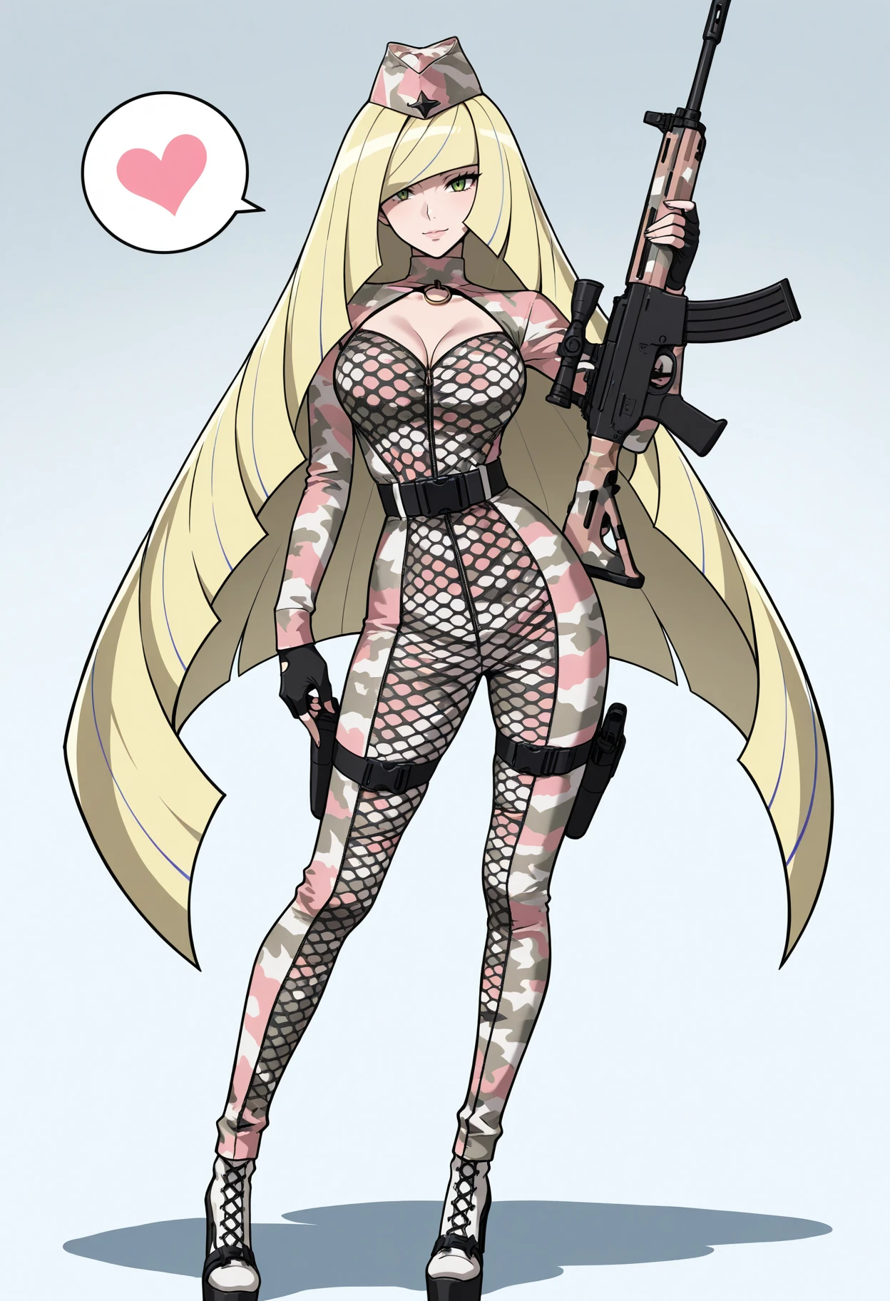 camouflage bodysuit, fishnet, snap-fit buckle, thigh straps, garrison cap, star \(symbol\), platform heels, laced footwear, bare hands, full length zipper