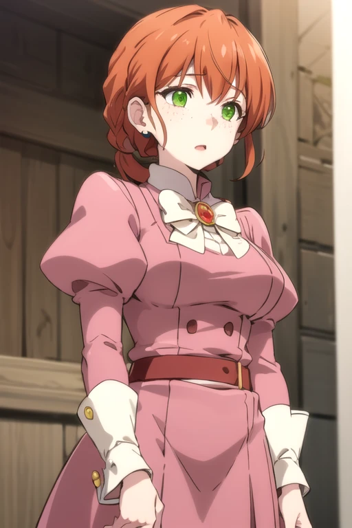 ElizeJamil, 1girl, solo, short hair, long sleeves, pink dress, jewelry, green eyes, braid, red hair, puffy sleeves, bowtie, orange hair, brooch, freckles