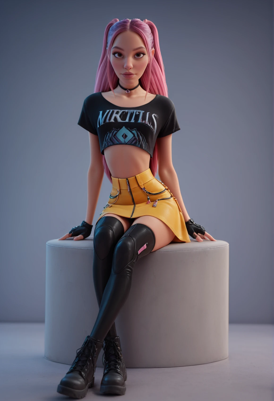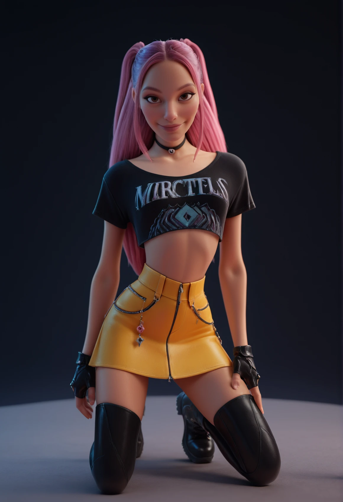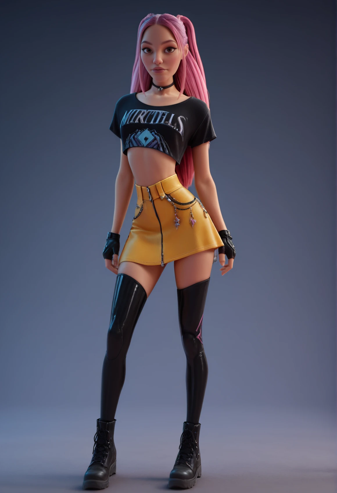 crop top, skirt, fingerless gloves, thighhighs, boots, choker
