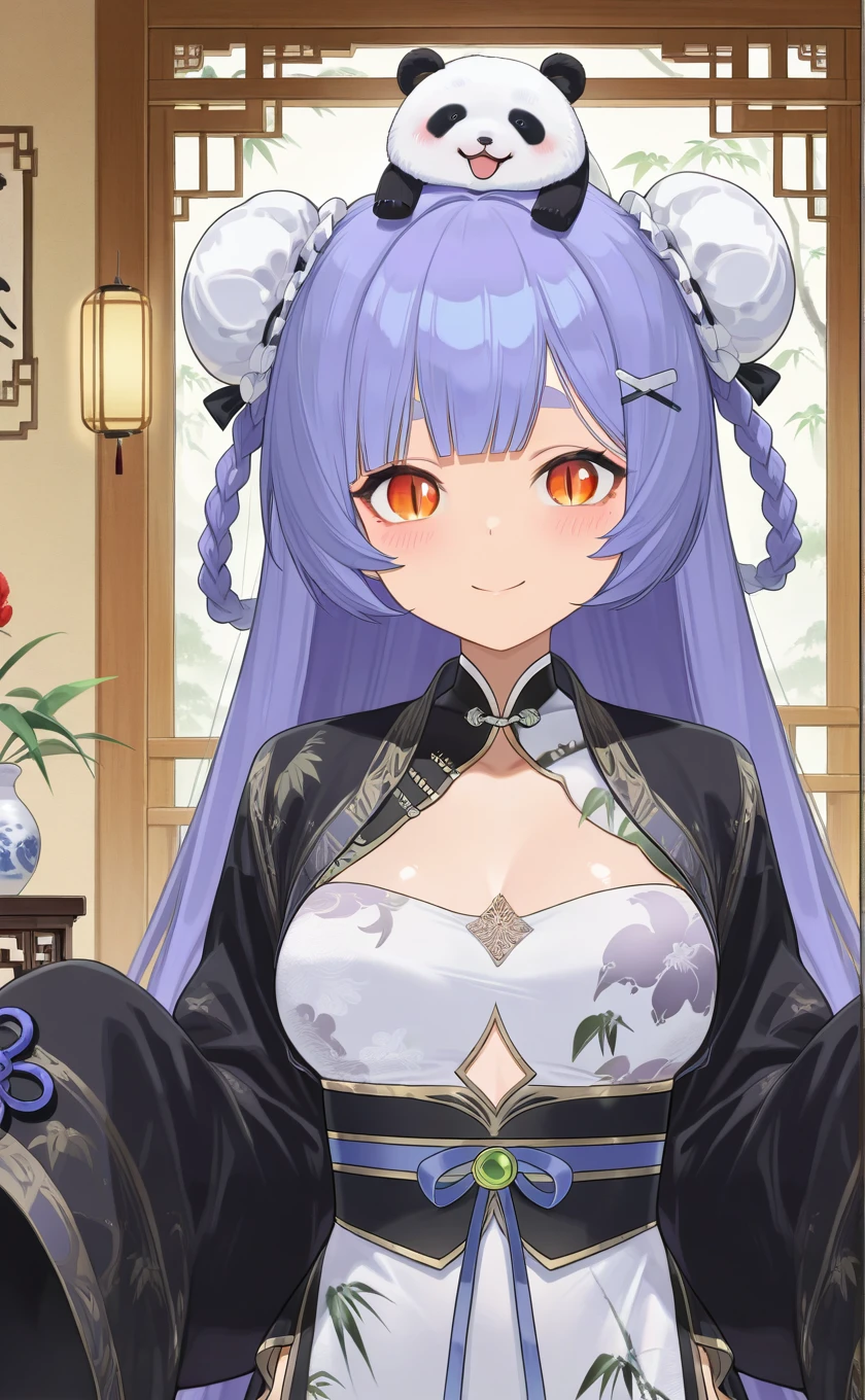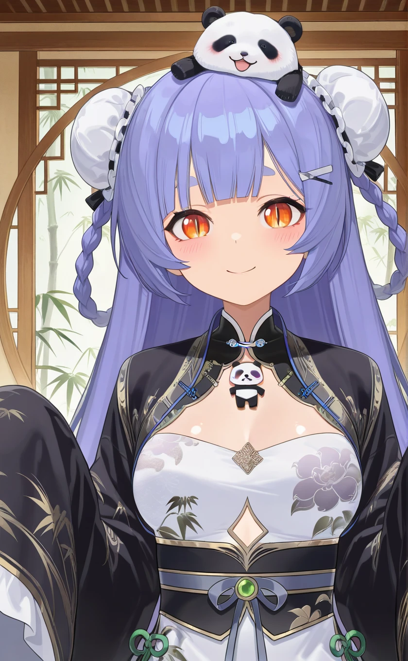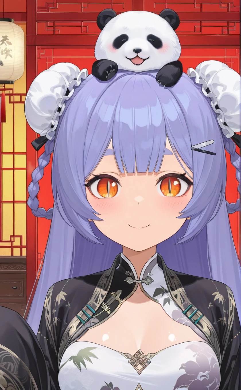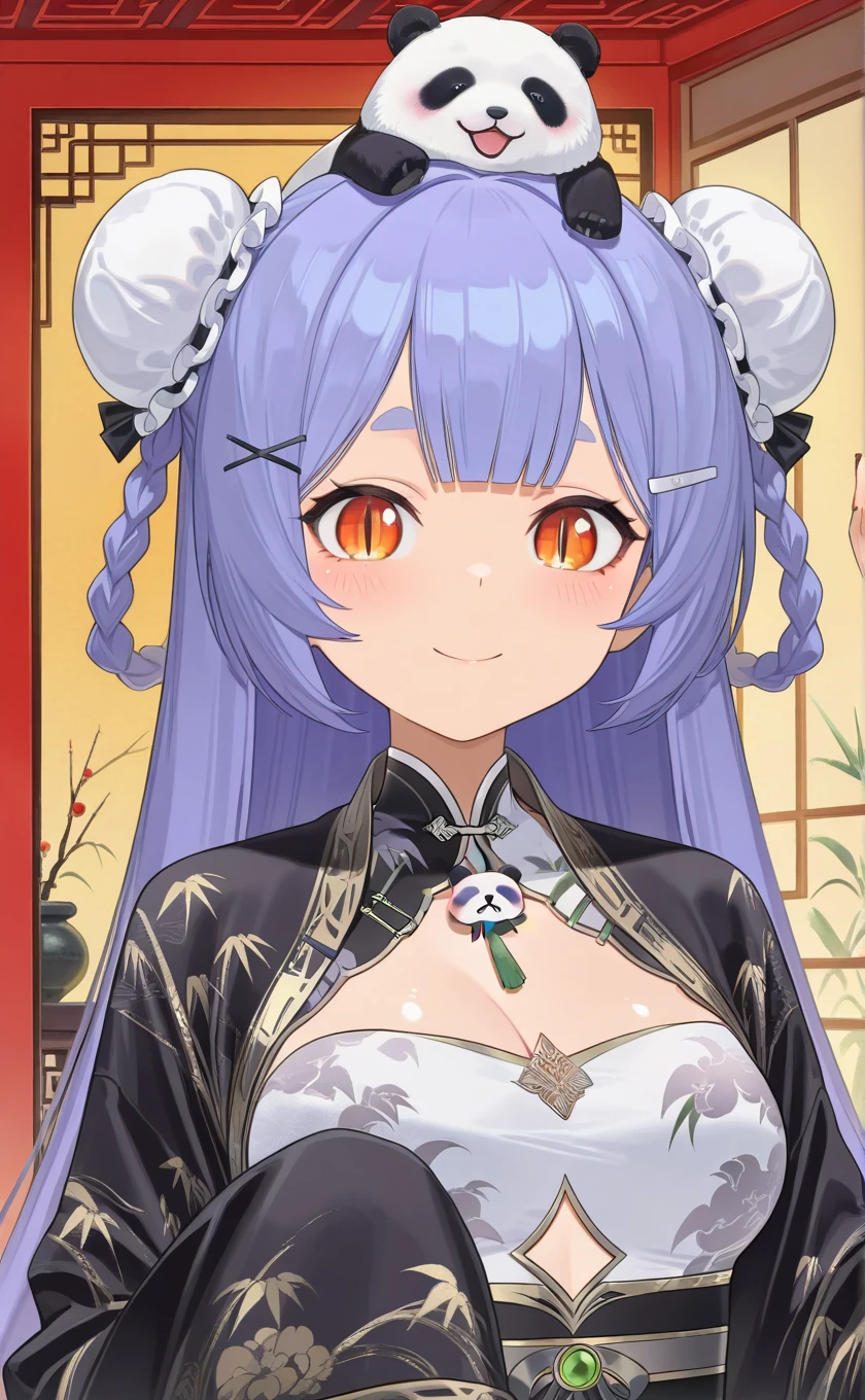 animal on head,panda,very long hair,purple hair,double bun,twin braids,hairclip,blunt bangs,orange eyes,slit pupils