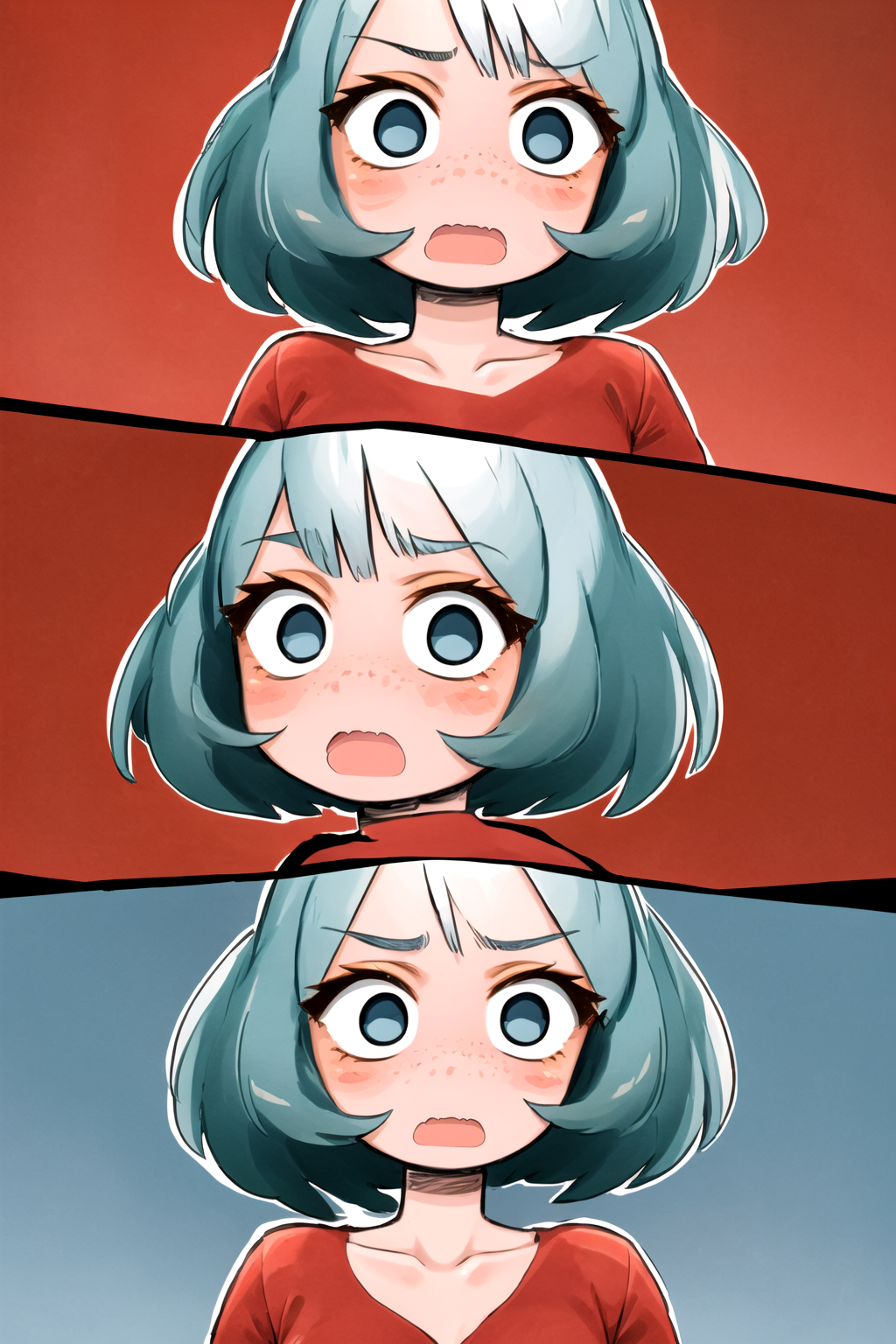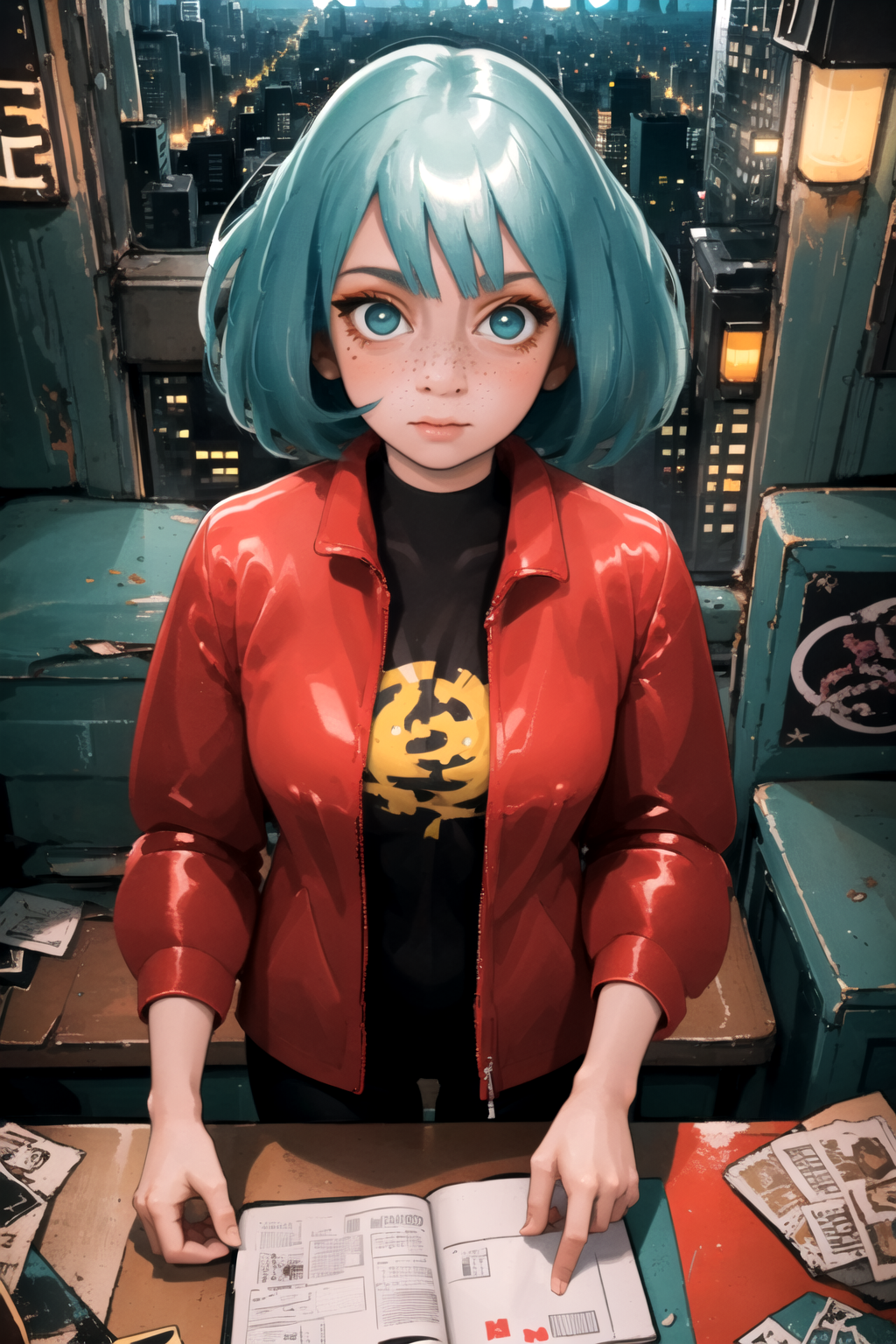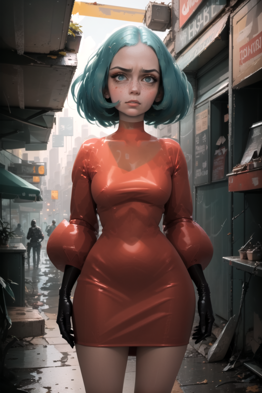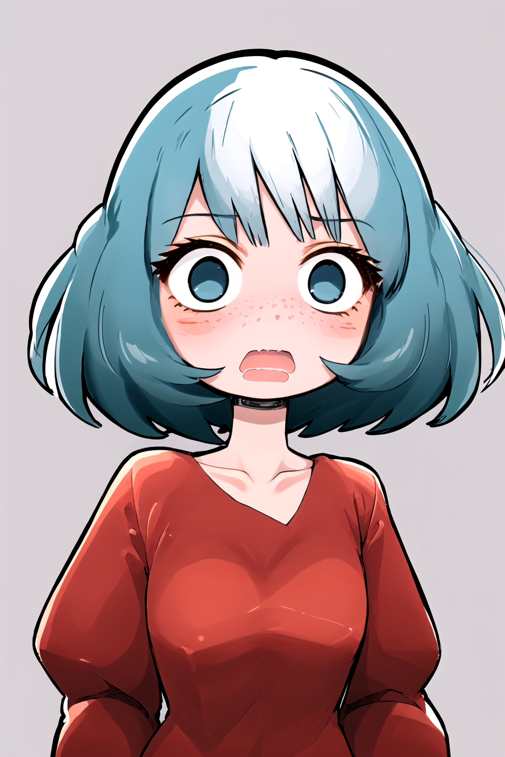 Other prompt : 1girl, blush, freckles, blue hair, short hair, bangs, black gloves, long sleeves, dress, black thighhighs