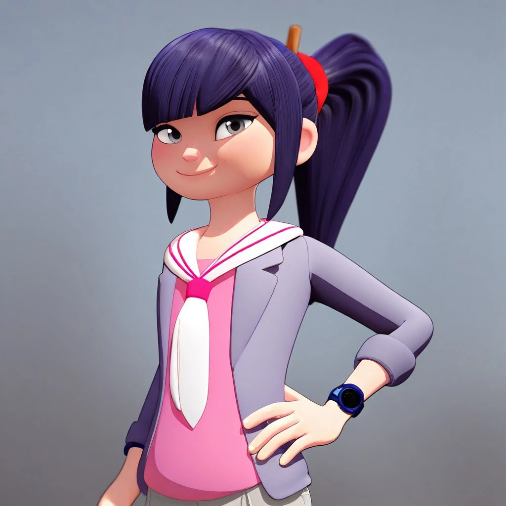 grey eyes, ponytail, indigo hair, red scrunchie, pencil, grey jacket, pink shirt, sailor collar tie, light gray pants, blue sneakers,