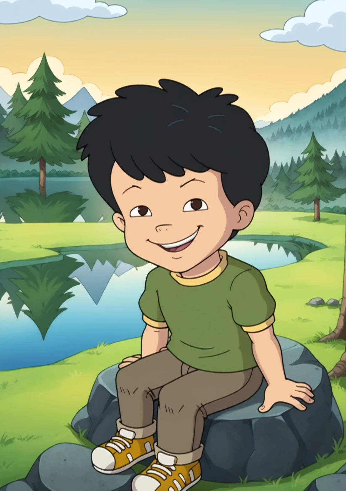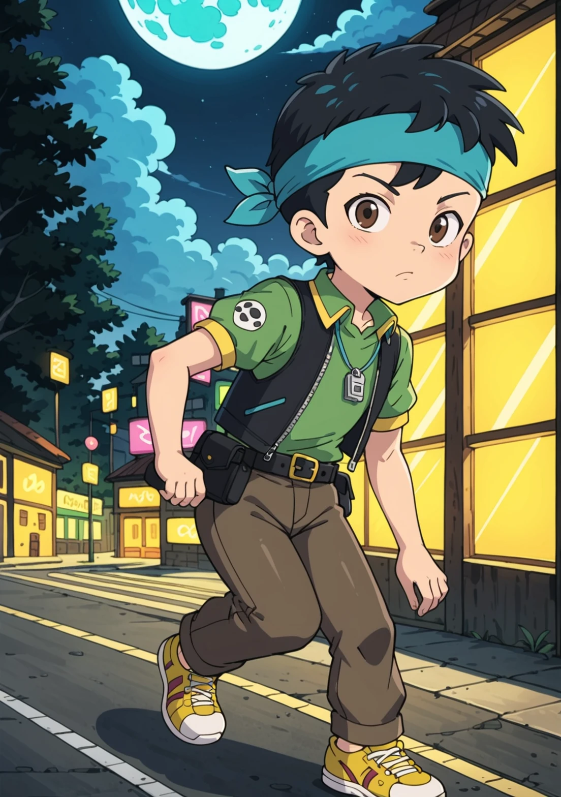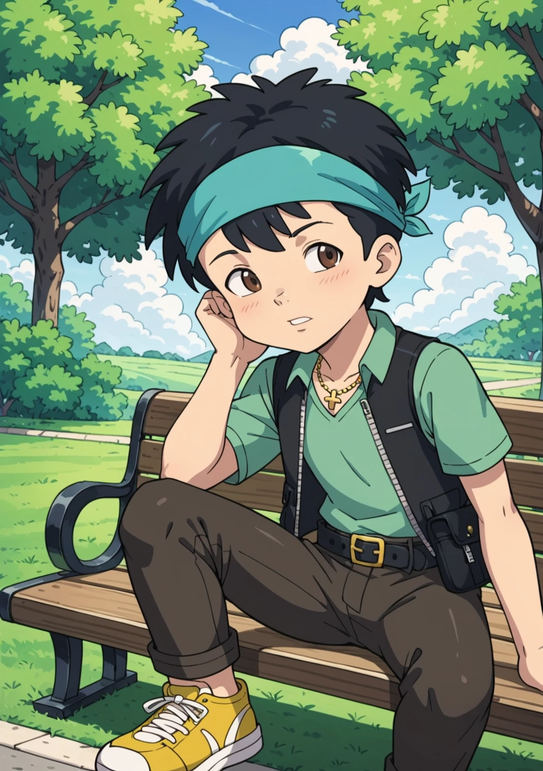 black hair, short hair, green shirt, grey pants, dark golden footwear, dark golden sneakers