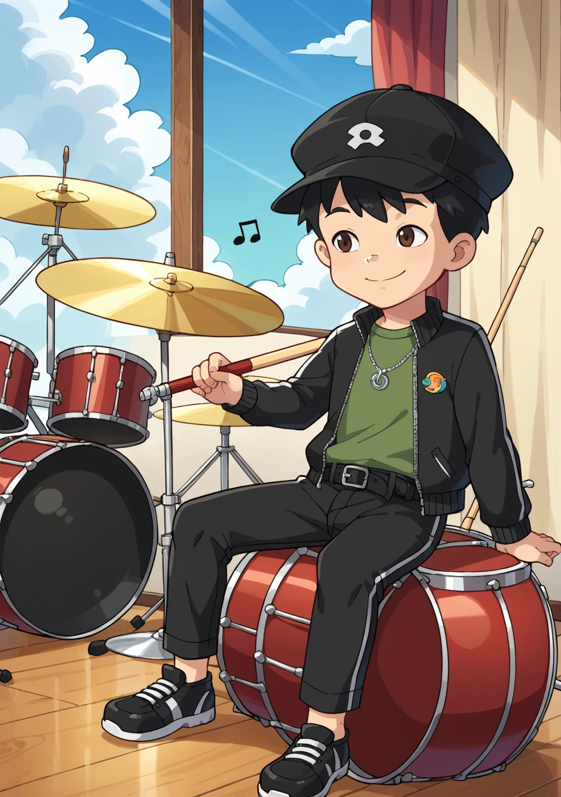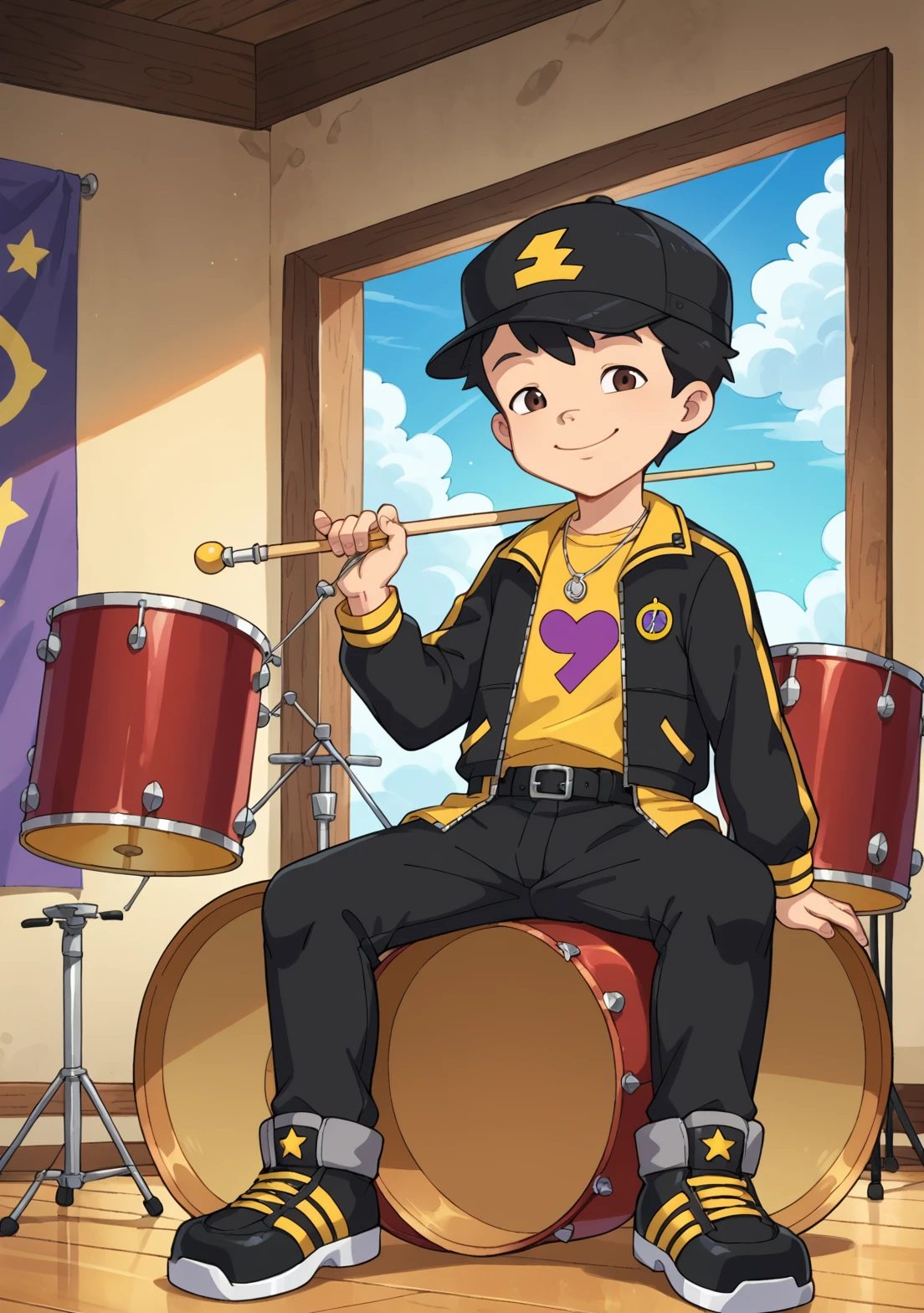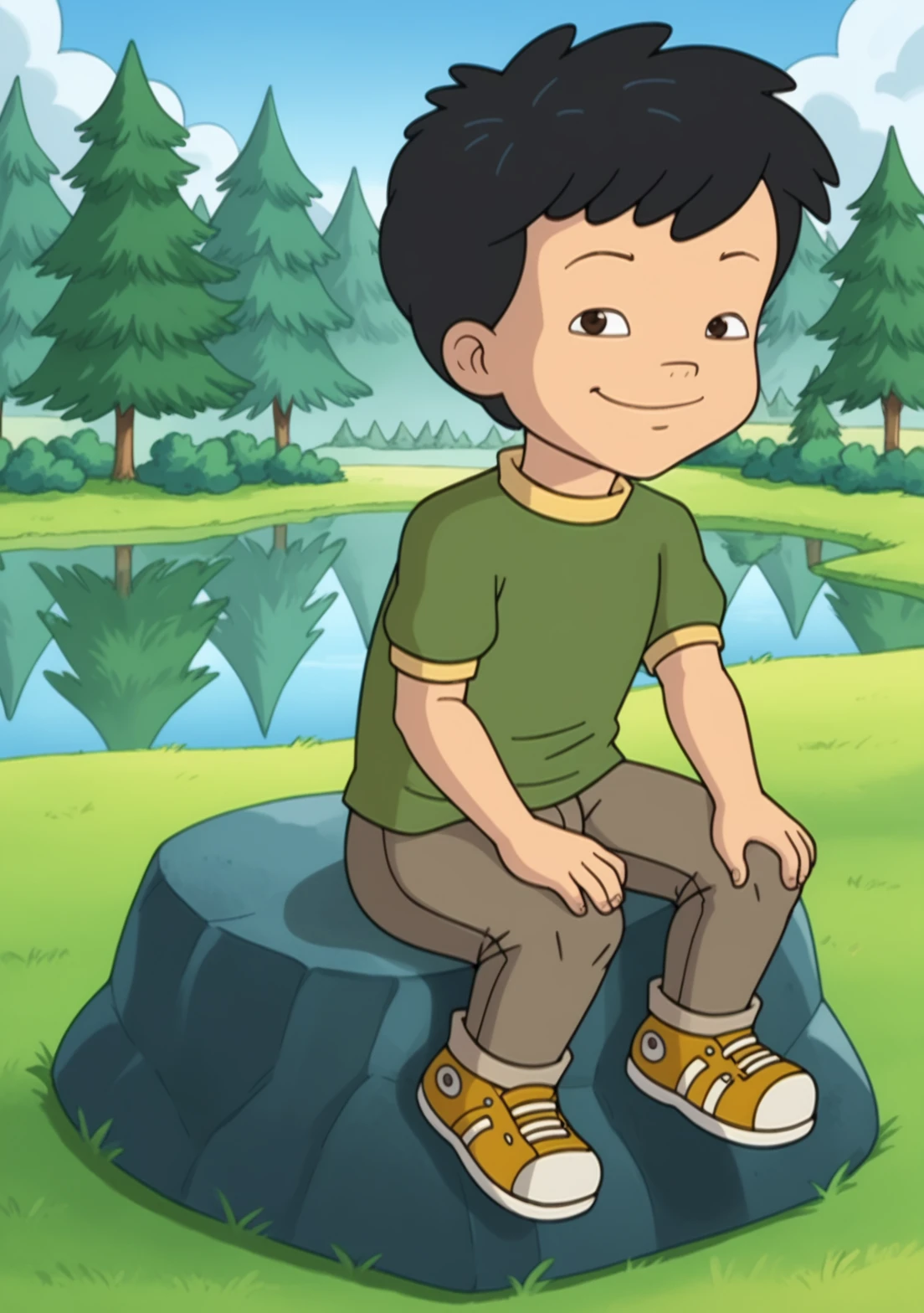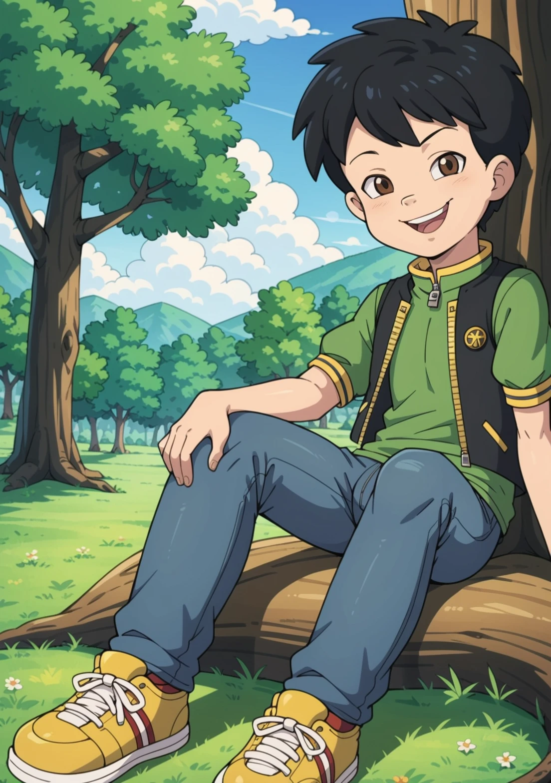black hair, short hair, green shirt, grey pants, dark golden footwear, dark golden sneakers