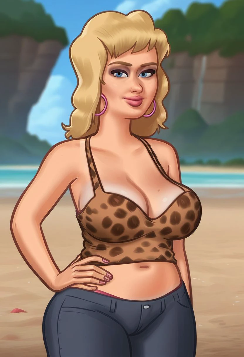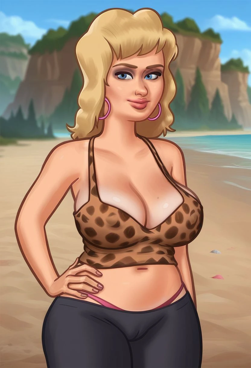 tank top, leopard print, navel, midriff, cleavage, covered nipples
