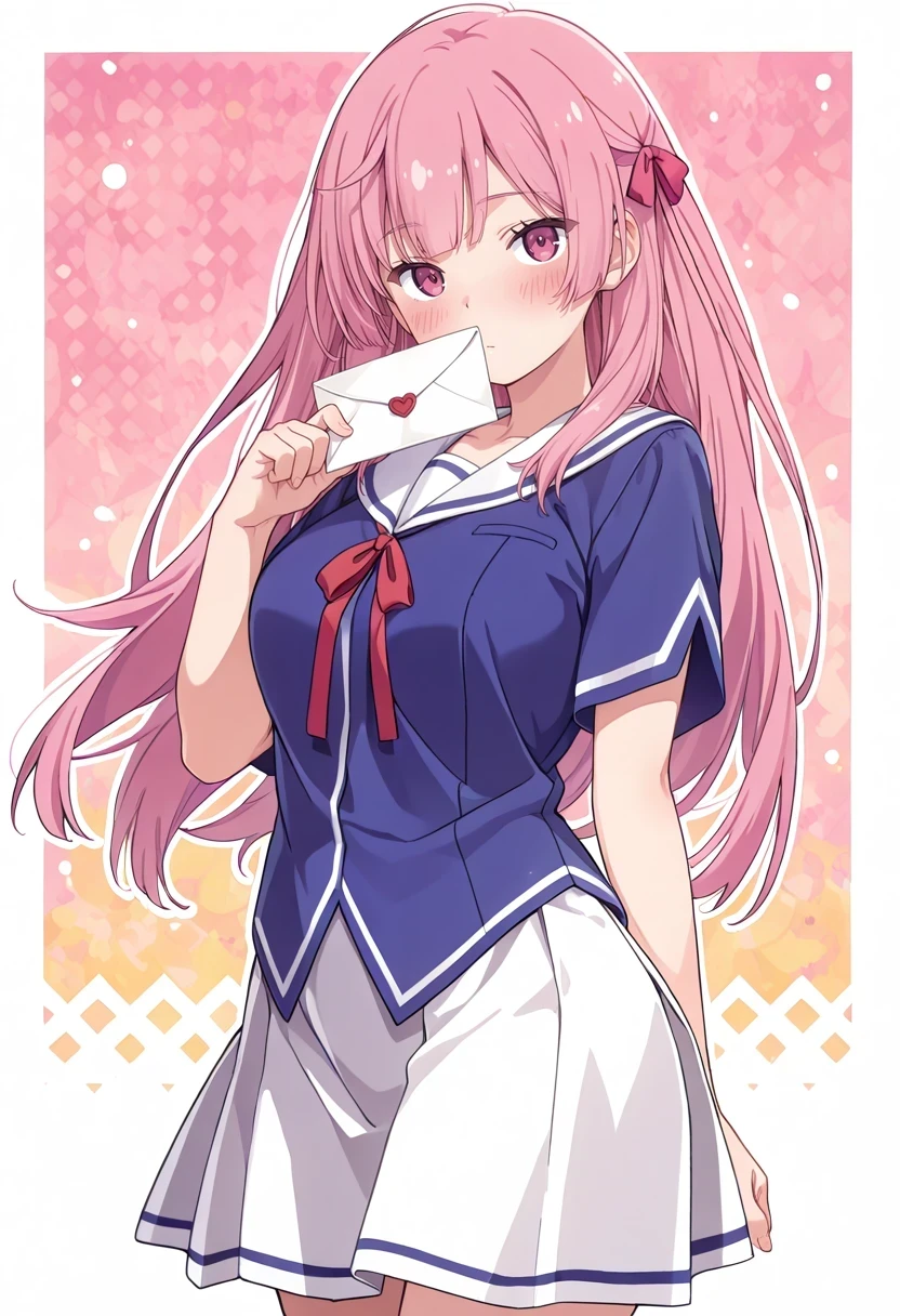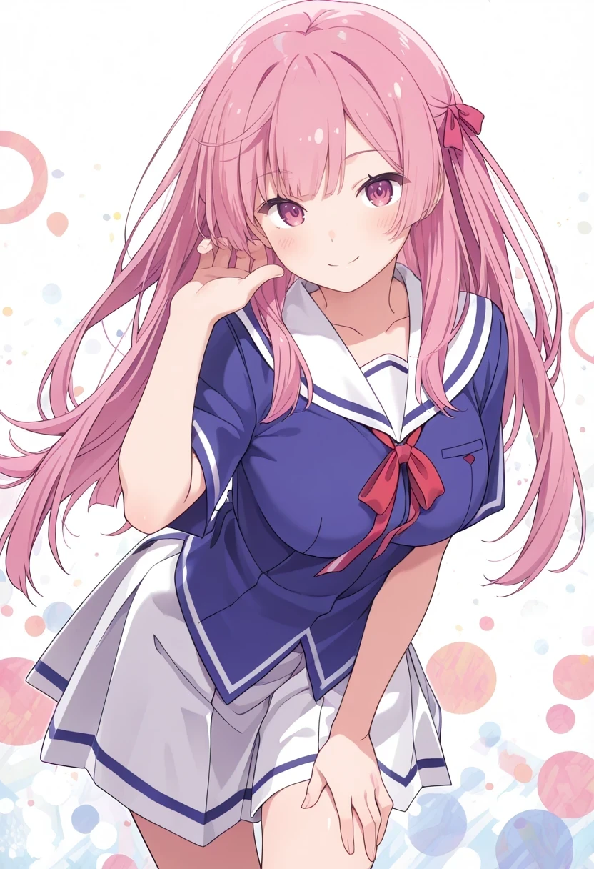 serafuku,red neck ribbon,blue shirt,white skirt,pleated skirt,Description