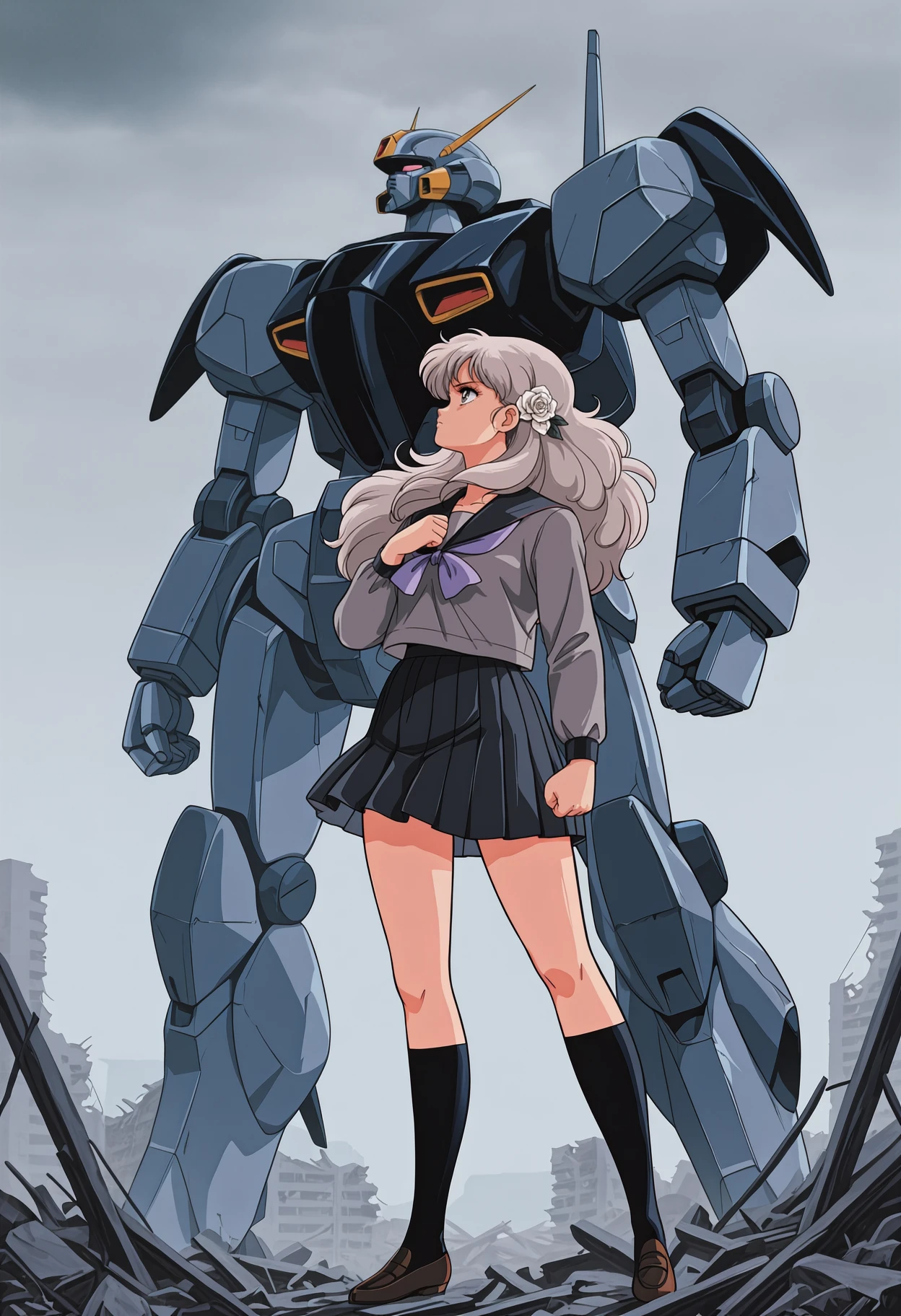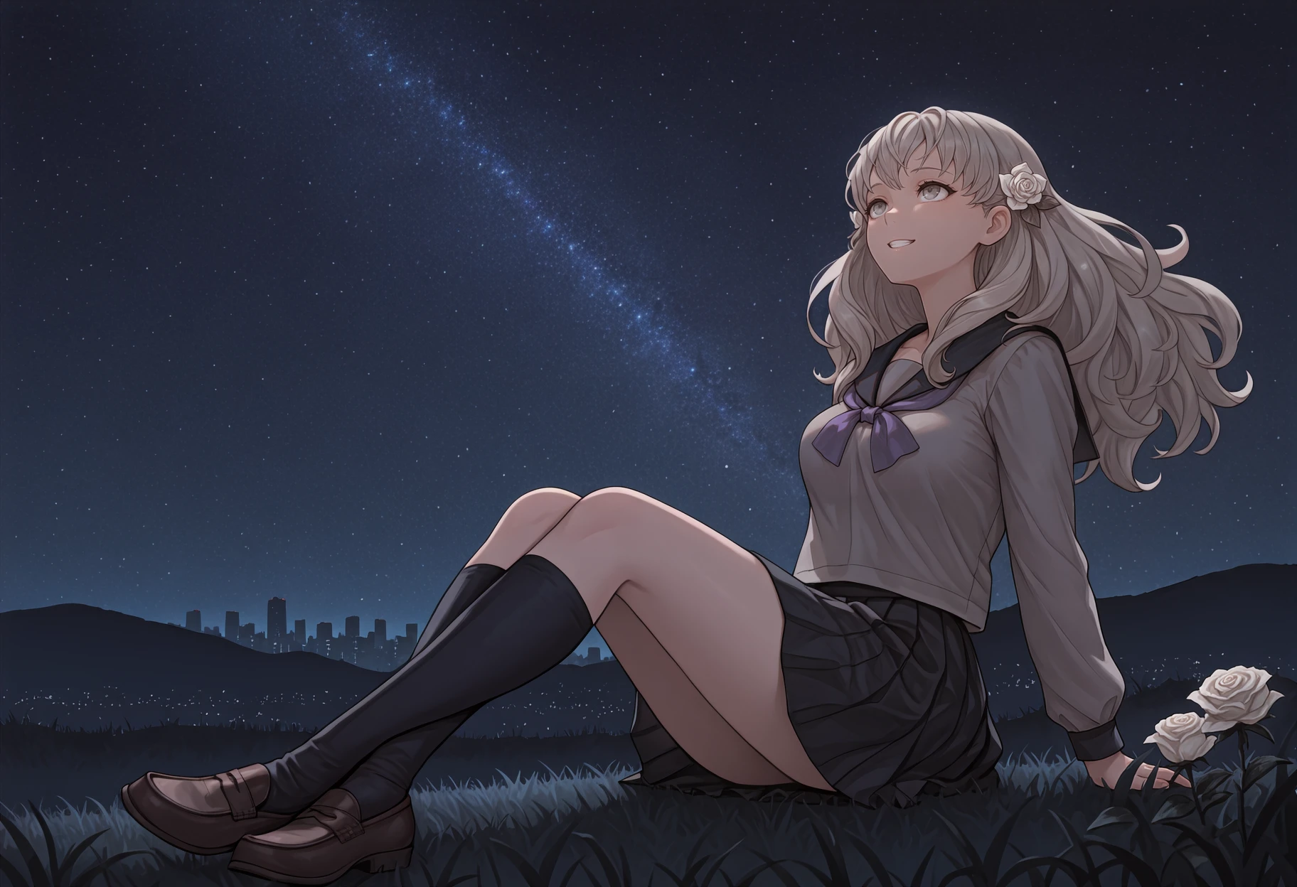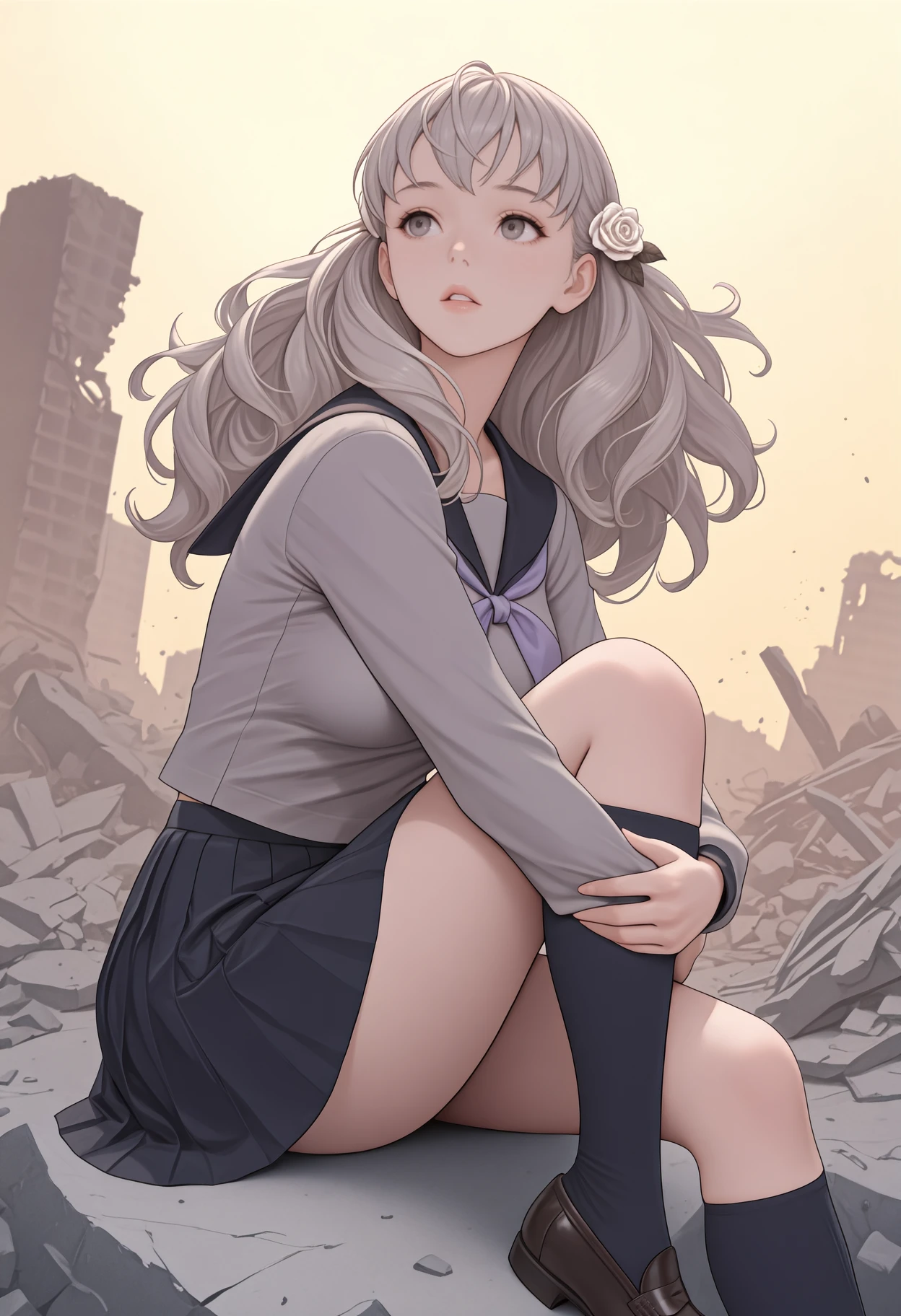 grey hair, long hair, hair flower, white rose, grey eyes, serafuku, black sailor collar, grey shirt, purple neckerchief, long sleeves, black skirt, pleated skirt, kneehighs, black socks, loafers