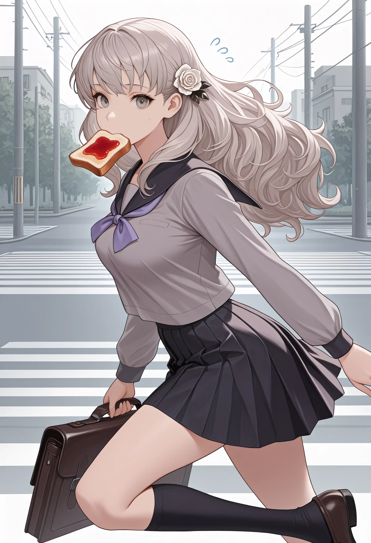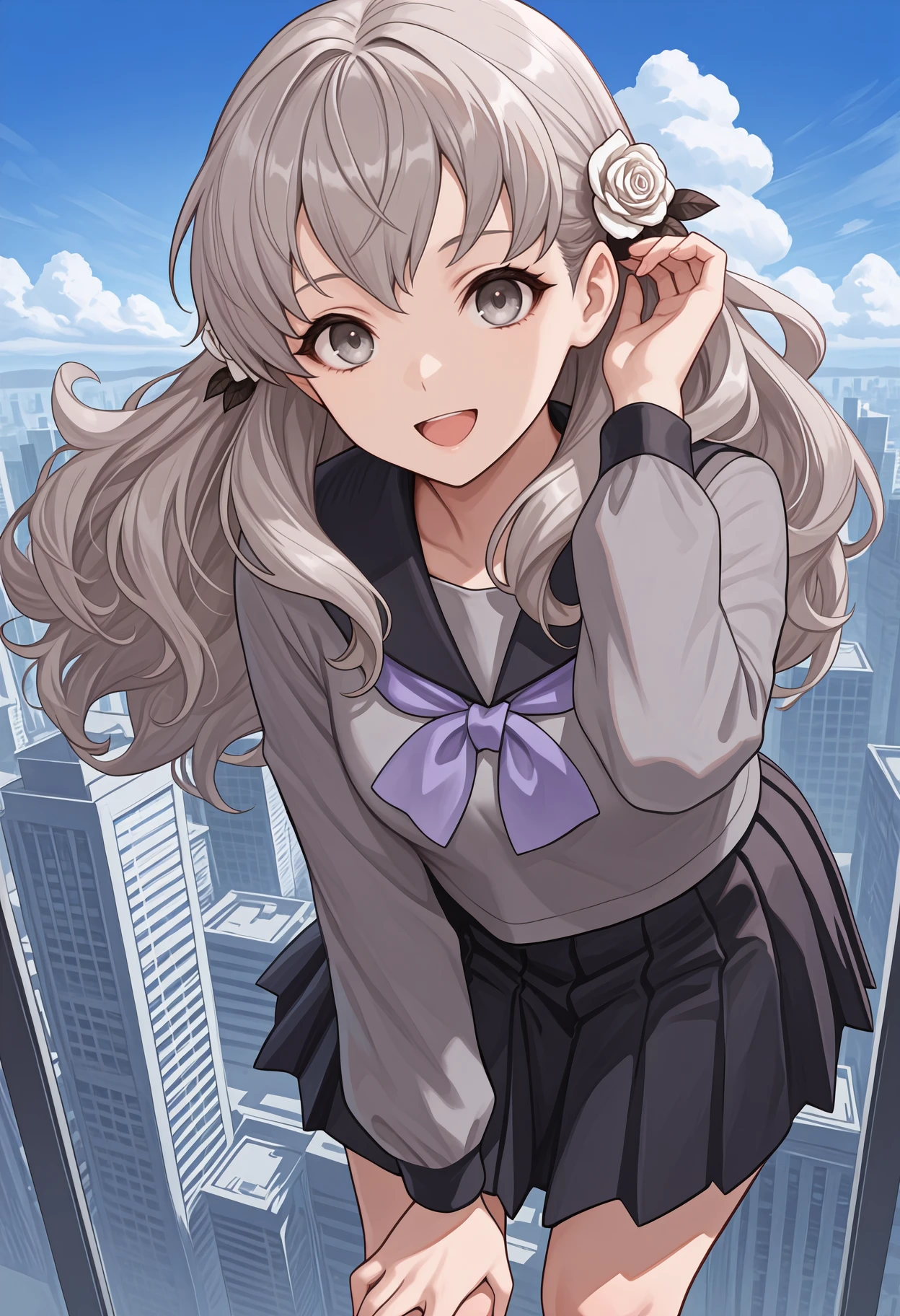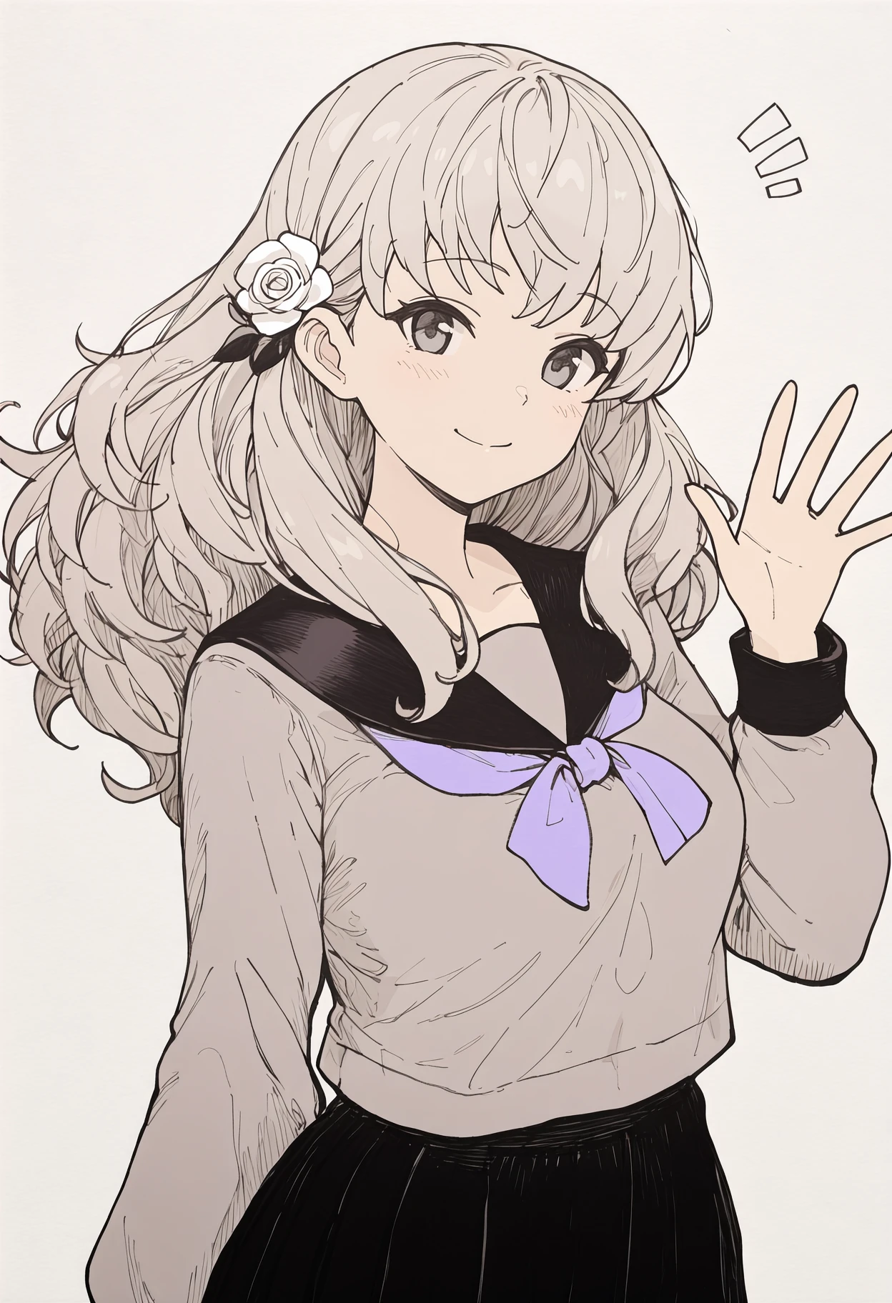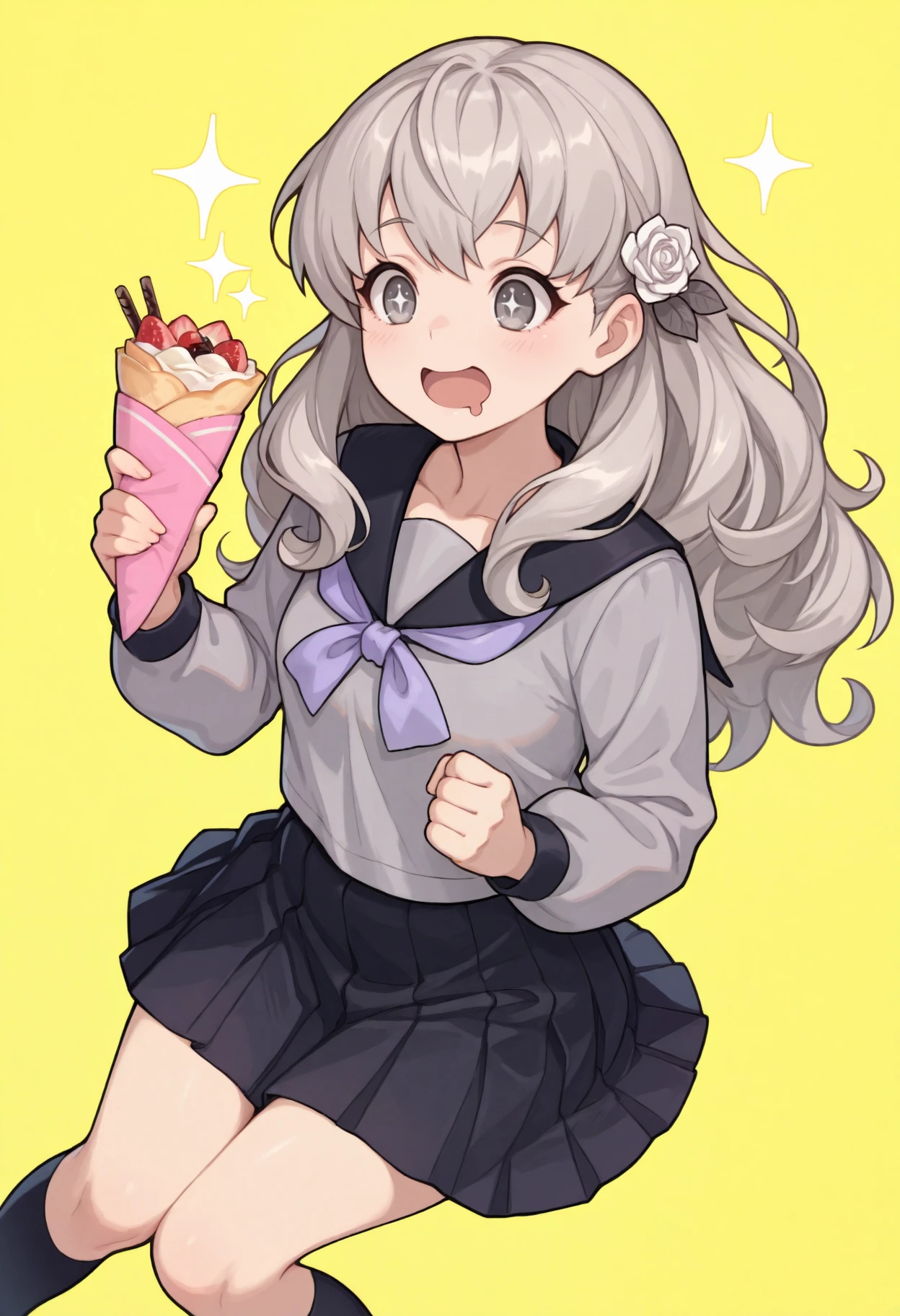 Default appearance: grey hair, long hair, hair flower, white rose, grey eyes, serafuku, black sailor collar, grey shirt, purple neckerchief, long sleeves, black skirt, pleated skirt, kneehighs, black socks, loafers
