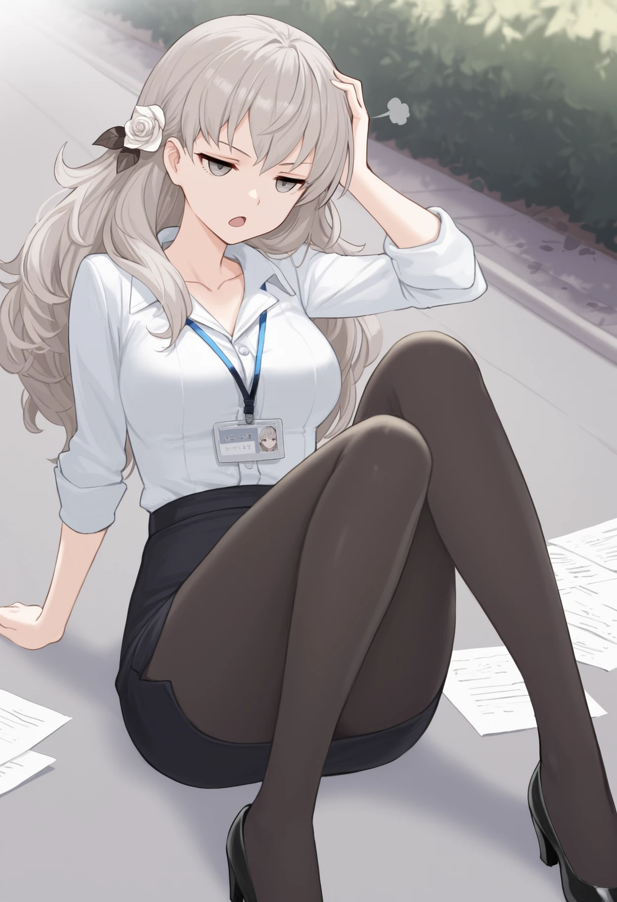 grey hair, long hair, hair flower, white rose, grey eyes