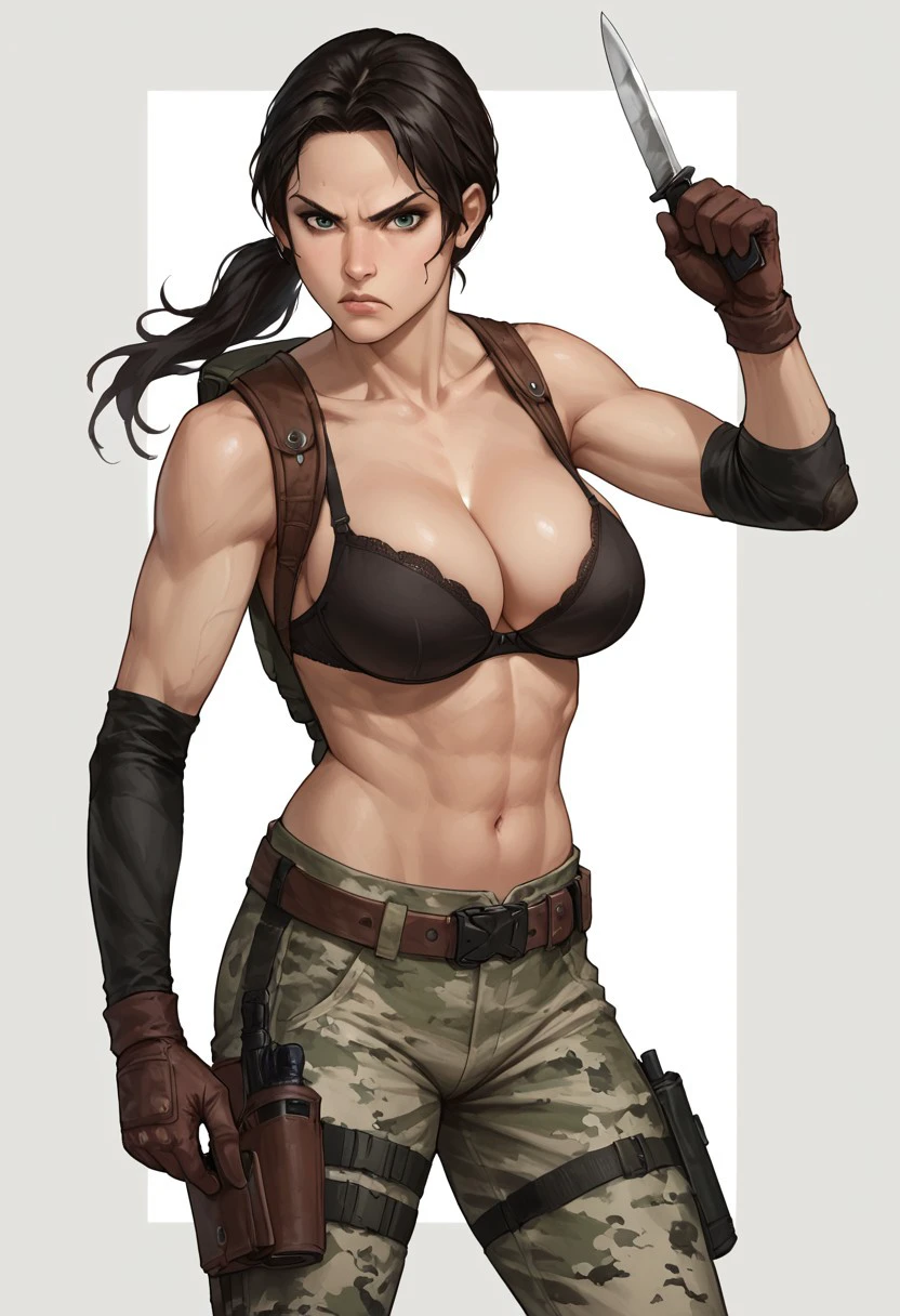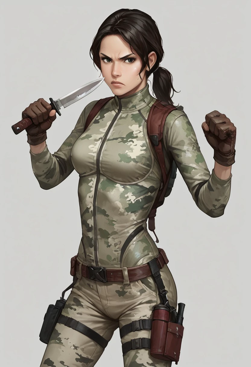 camouflage bodysuit, belt, holsters, gloves, boots, backpack,