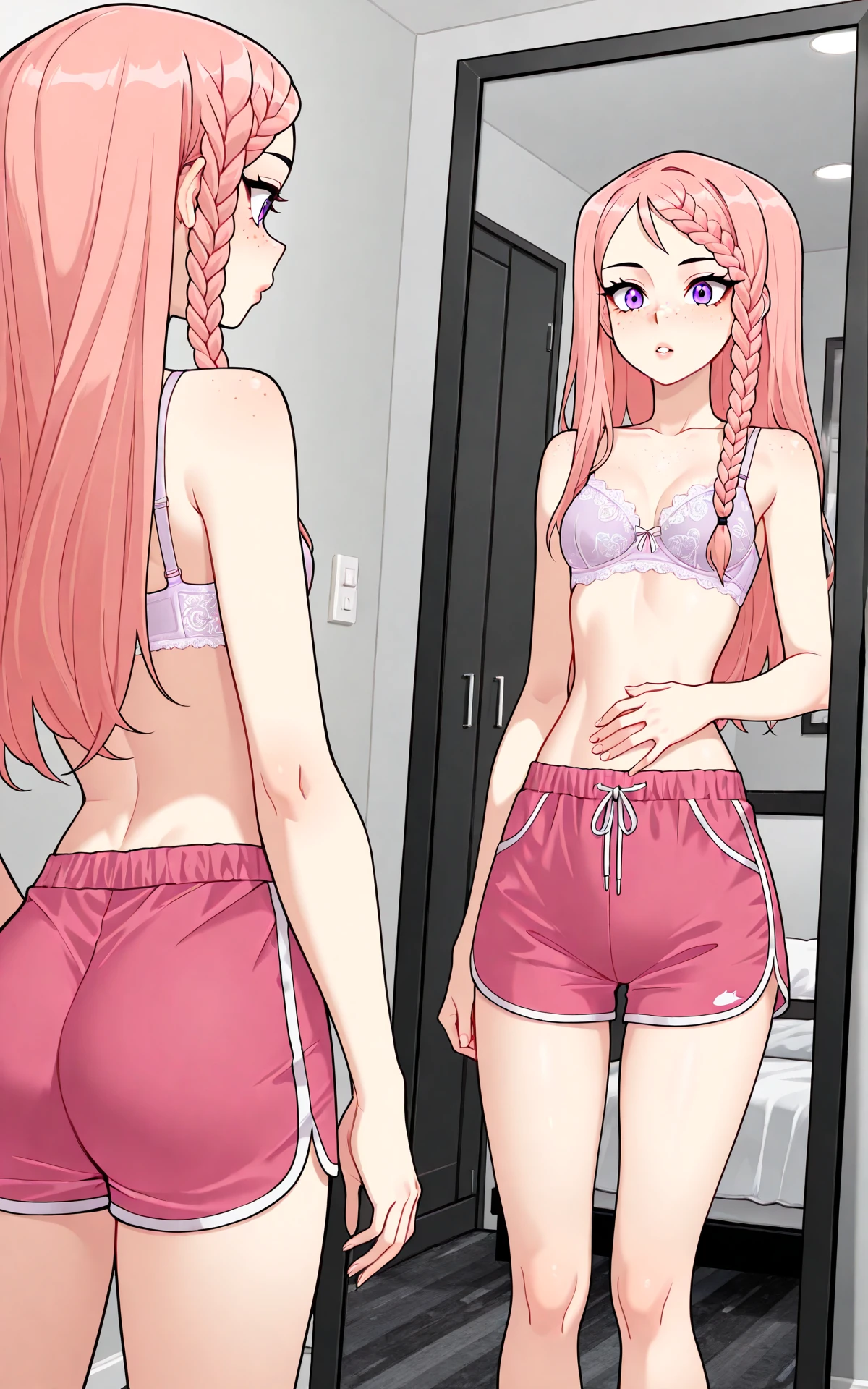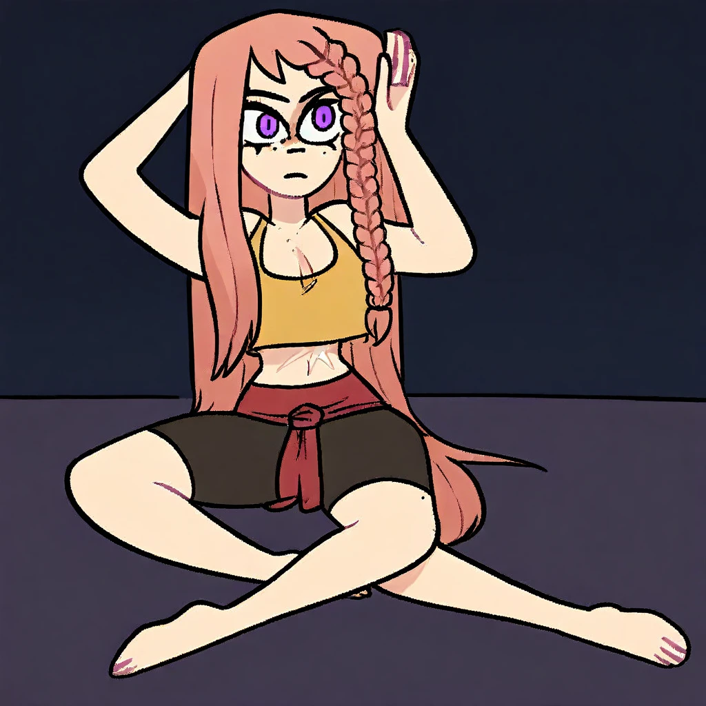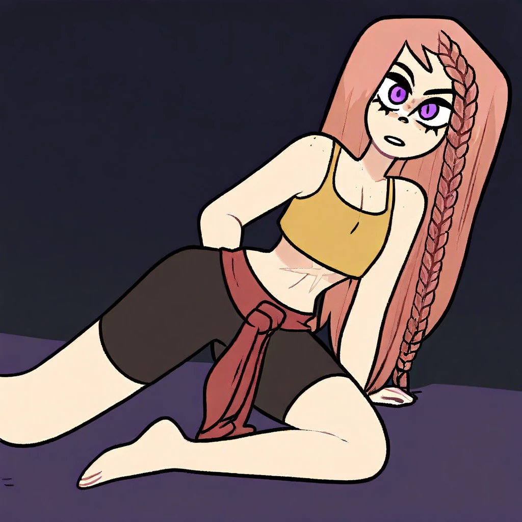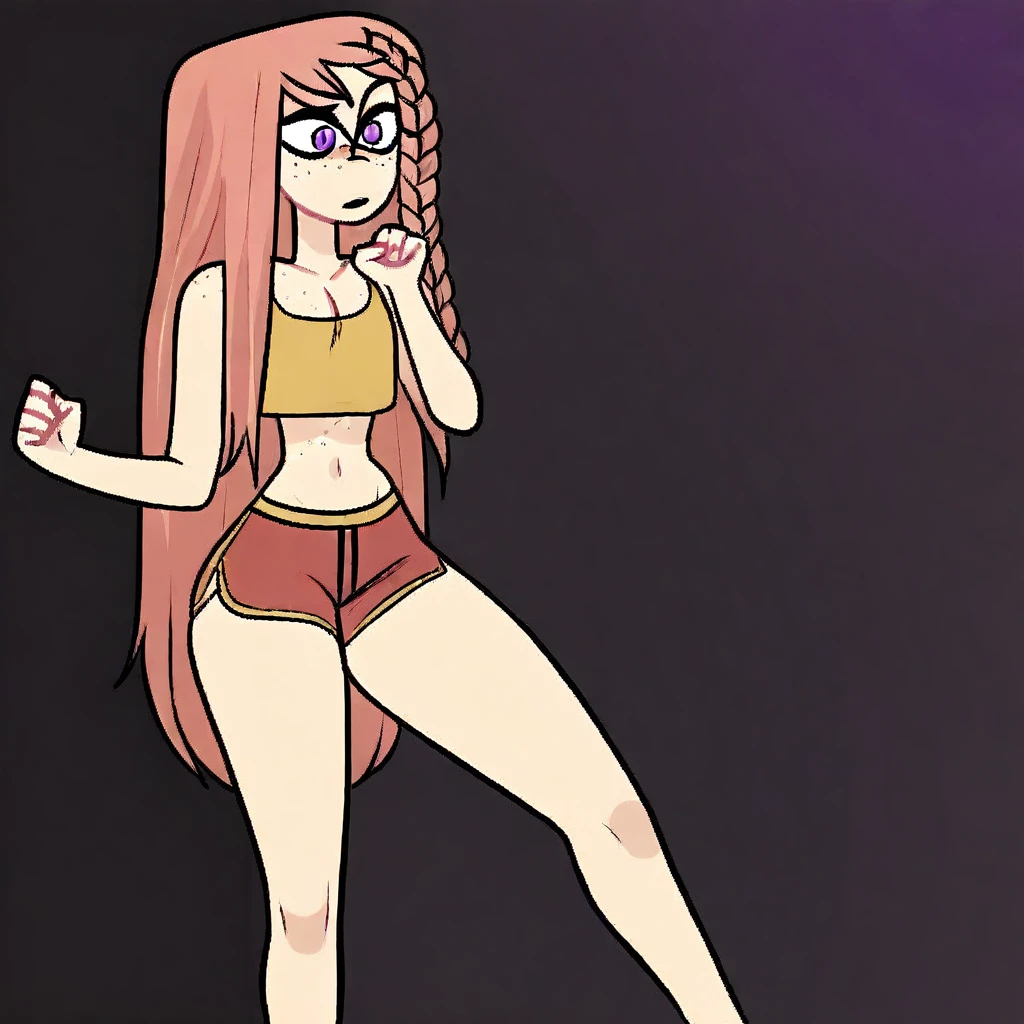 long pink hair, hair braid, purple eyes, freckles, scar on midriff, small , narrow waist, wide , long legs,