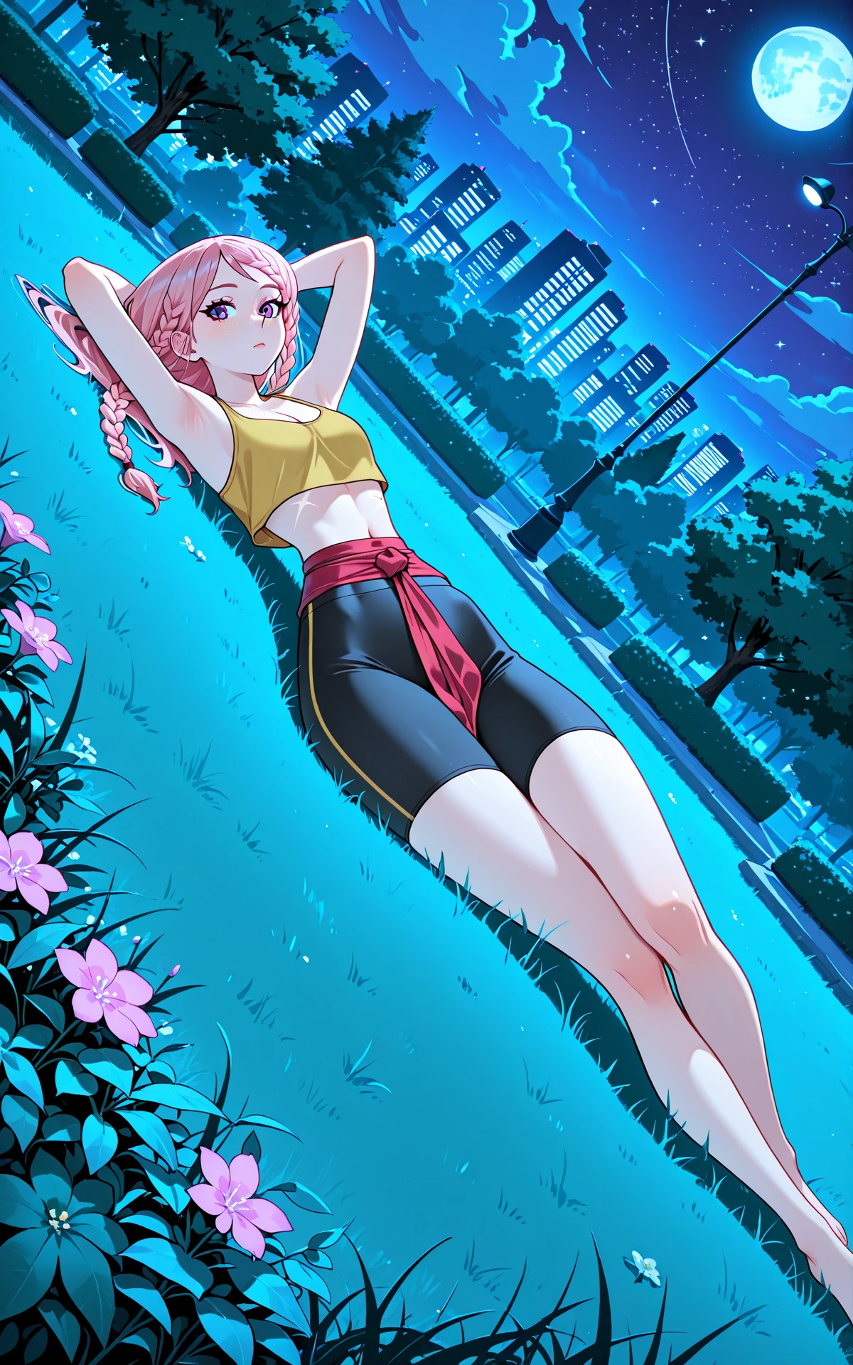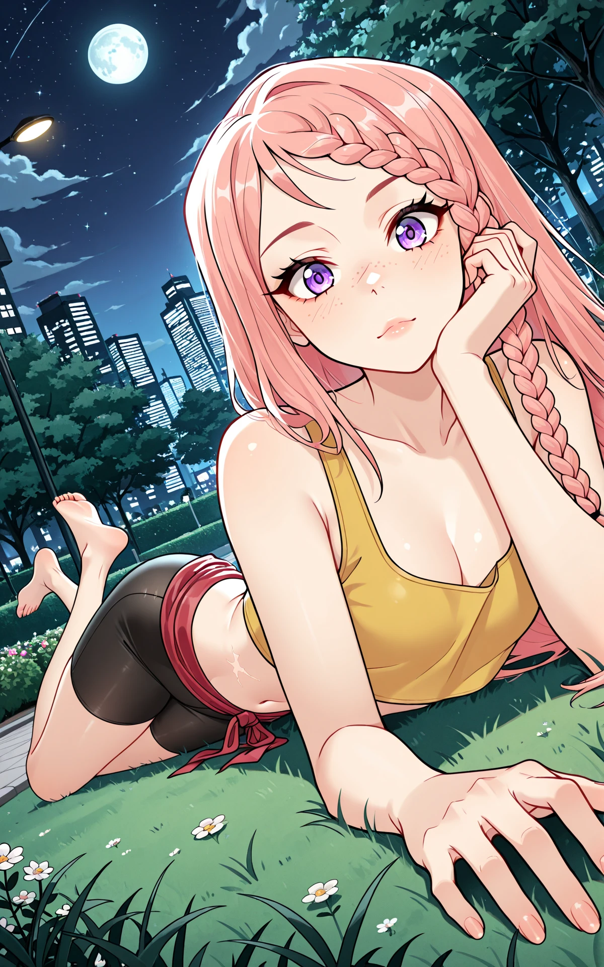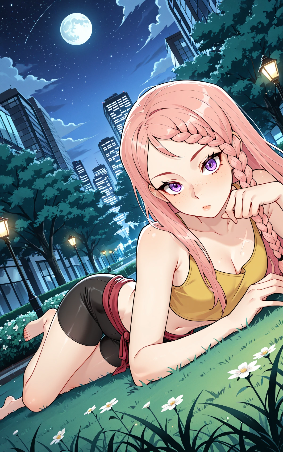 long pink hair, hair braid, purple eyes, freckles, scar on midriff, small , narrow waist, wide , long legs,