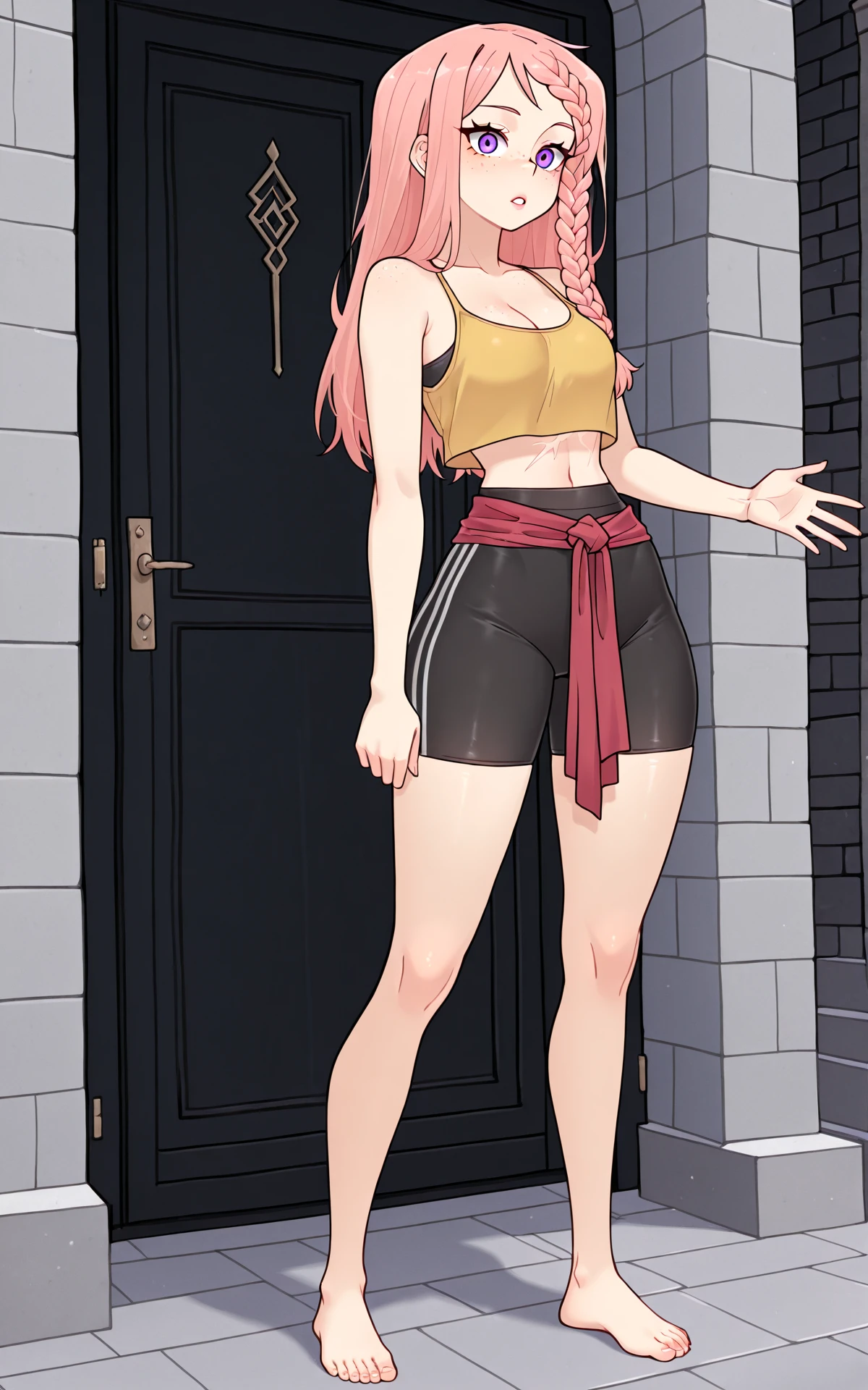 yellow crop tank-top, midriff, cleavage, black yoga shorts, red waist wrap, barefoot,