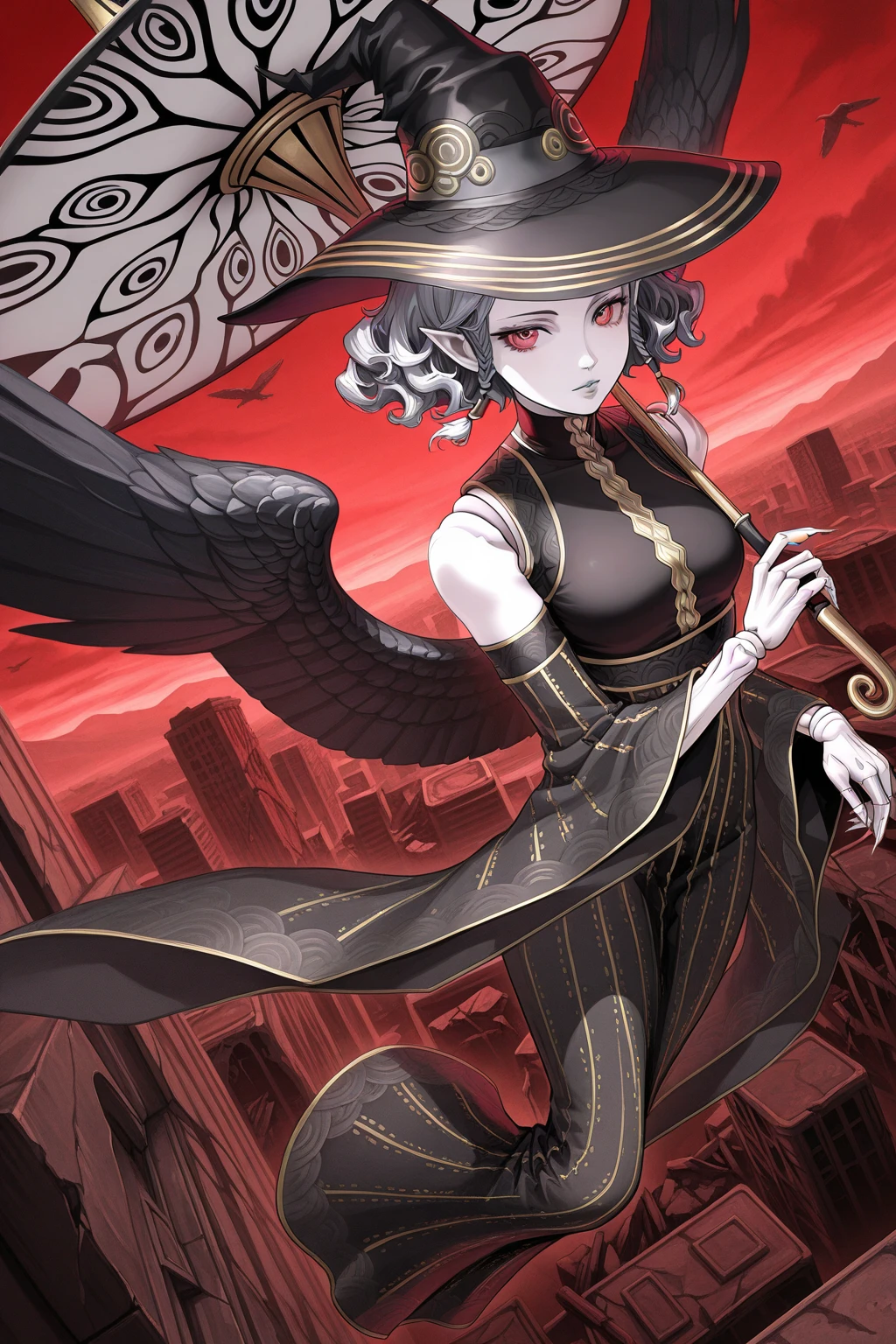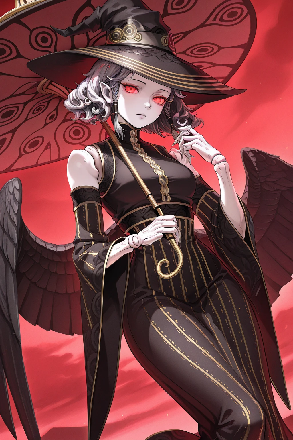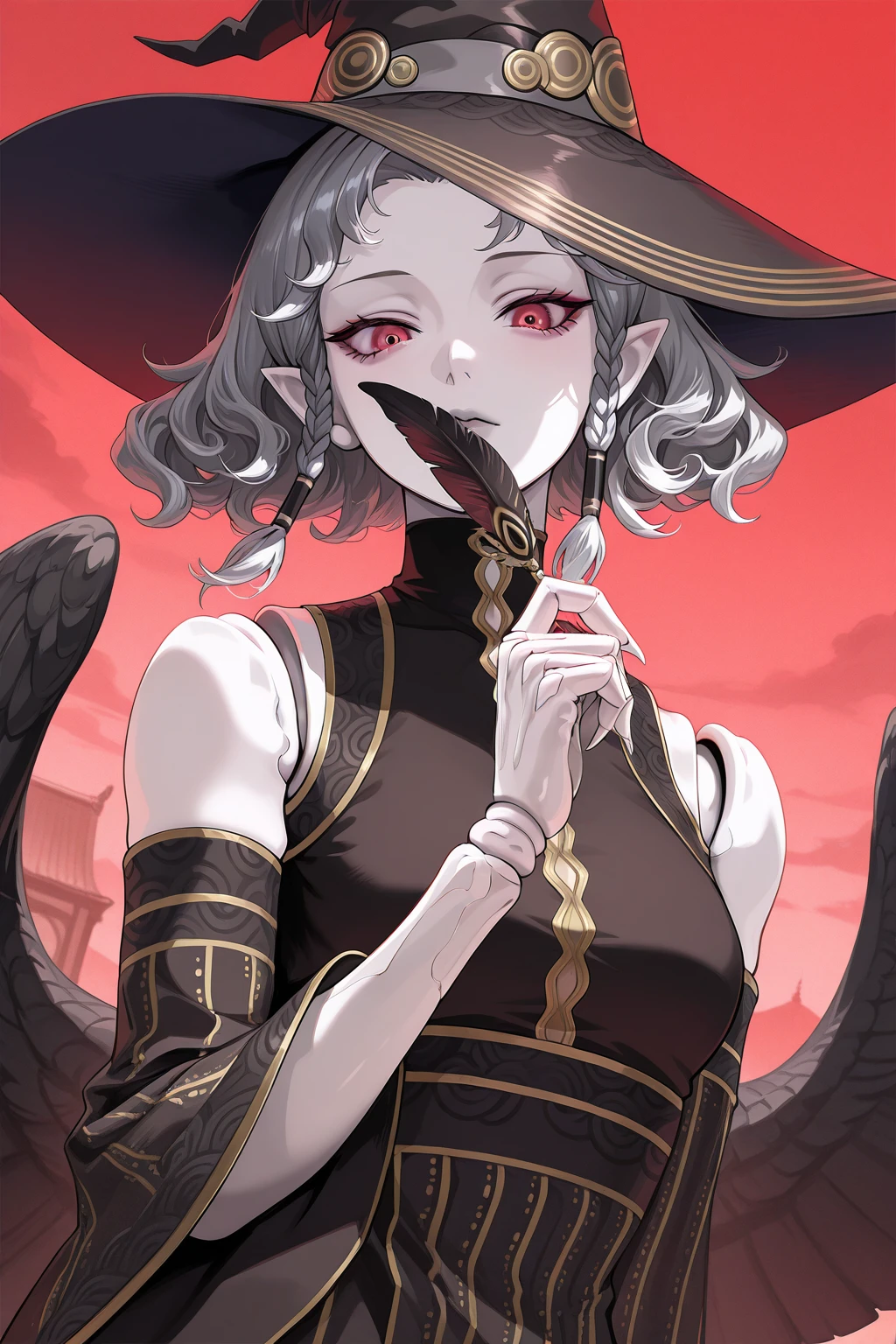 short hair, side braids, red eyes, detailed eyes, grey lips, pale skin, pointy ears, joints, doll joints, claws, witch hat, black dress, detached sleeves, wide sleeves, feathered wings