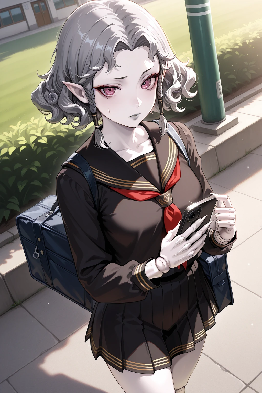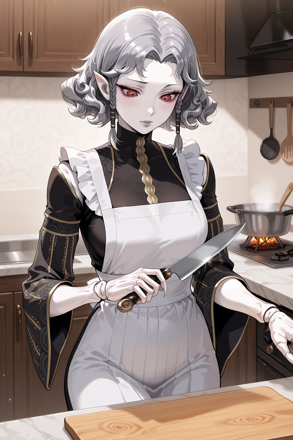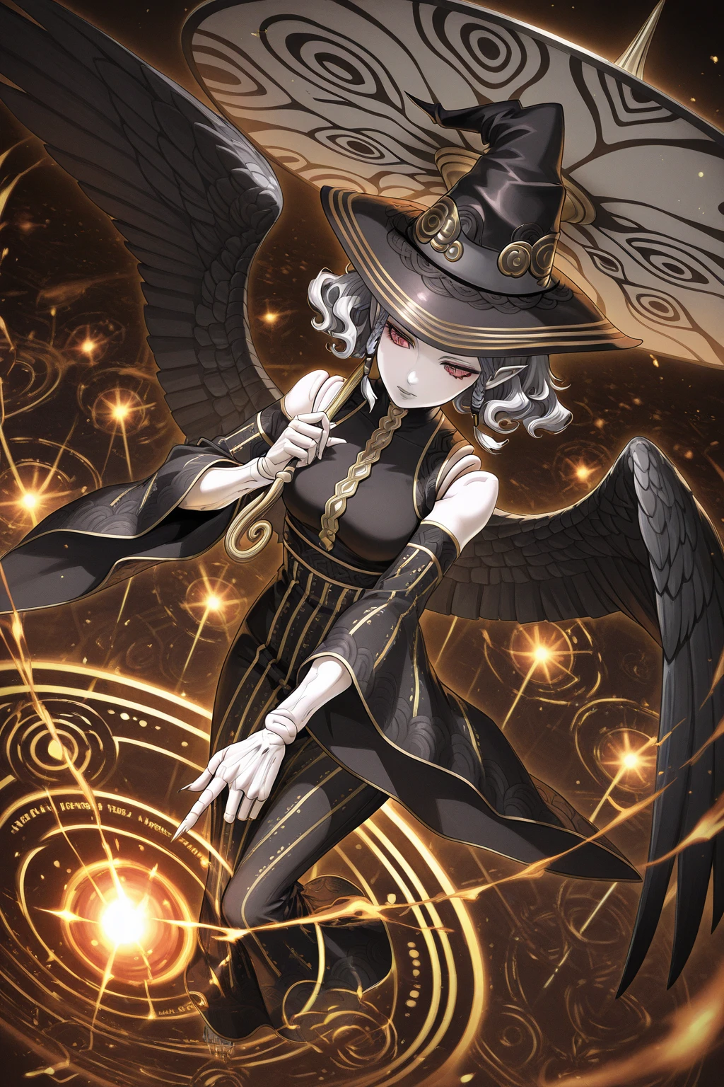 short hair, side braids, red eyes, detailed eyes, grey lips, pale skin, pointy ears, joints, doll joints, claws, witch hat, black dress, detached sleeves, wide sleeves, feathered wings