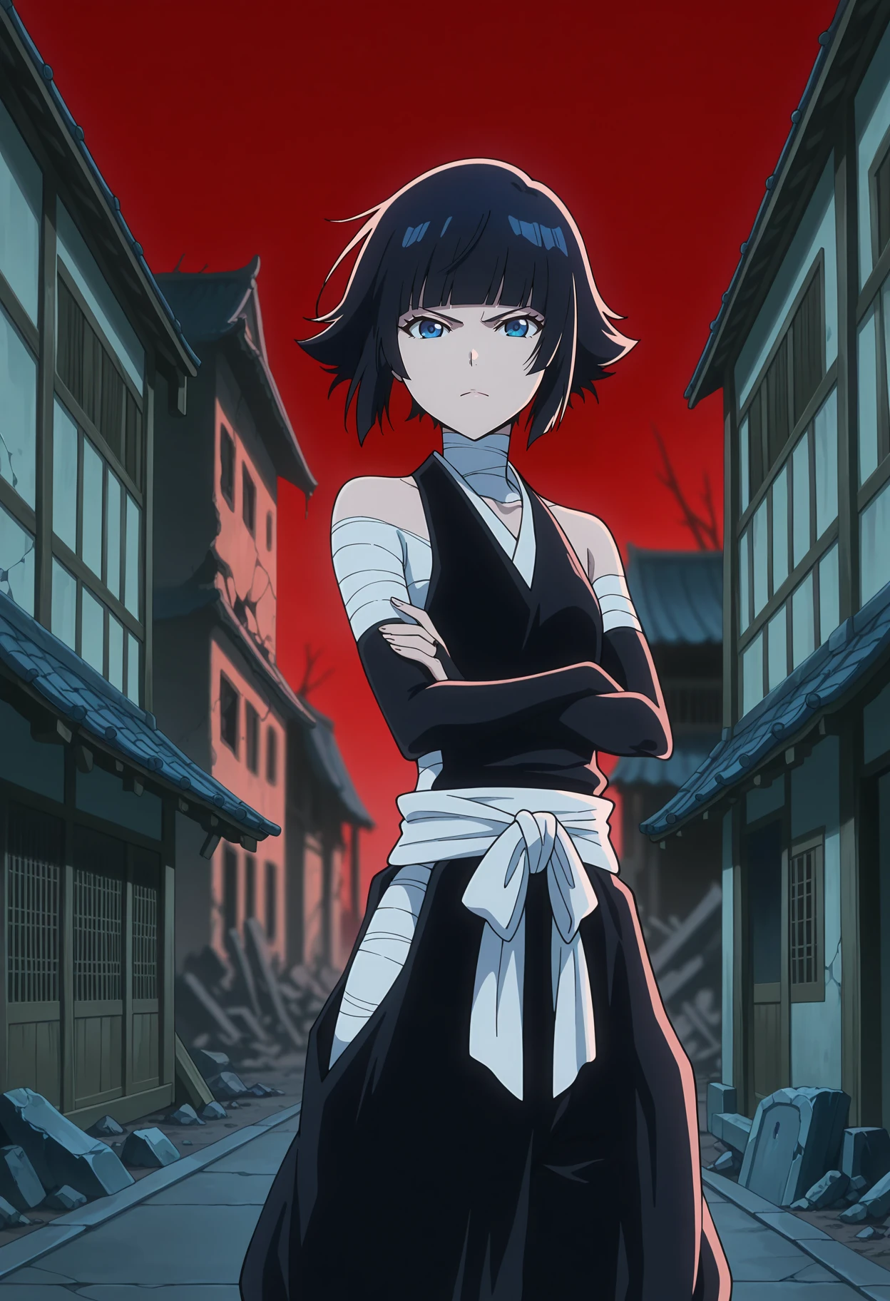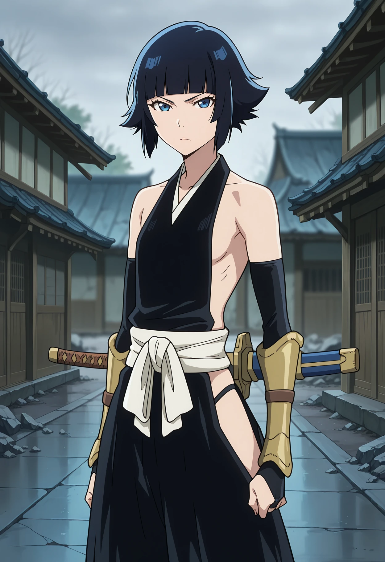 sleeveless, black kimono, sideboob, small breasts, white sash, bridal gauntlets, black gloves, vambraces, puffy pants