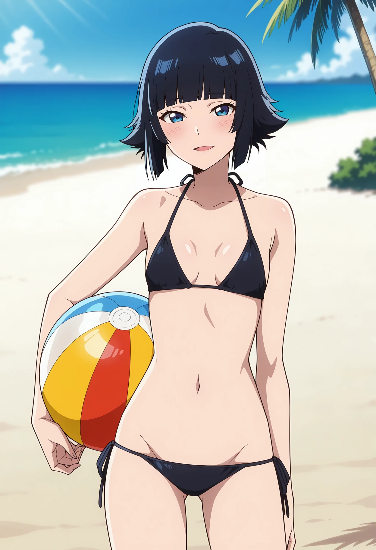 blunt bangs, short hair, black hair, blue eyes