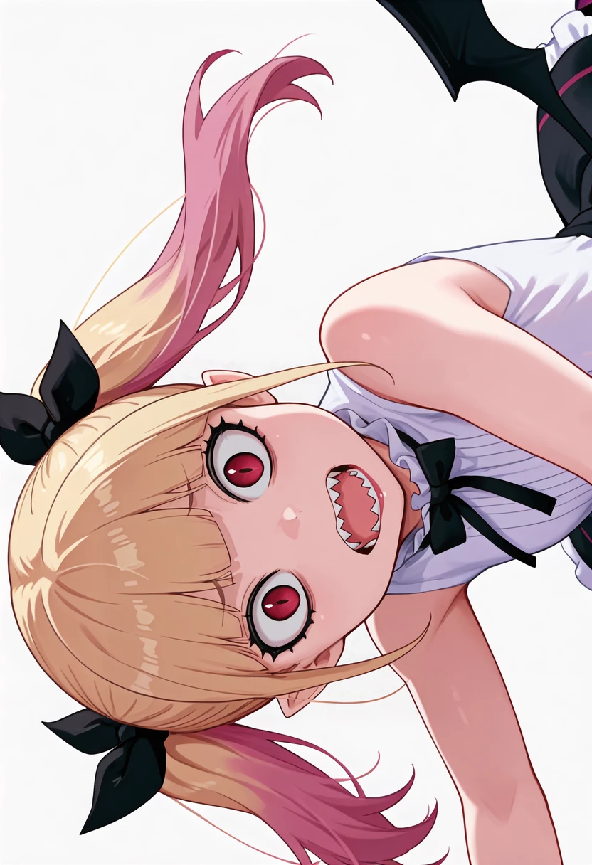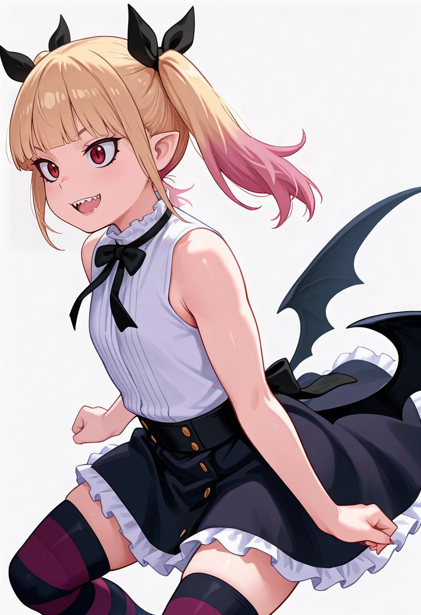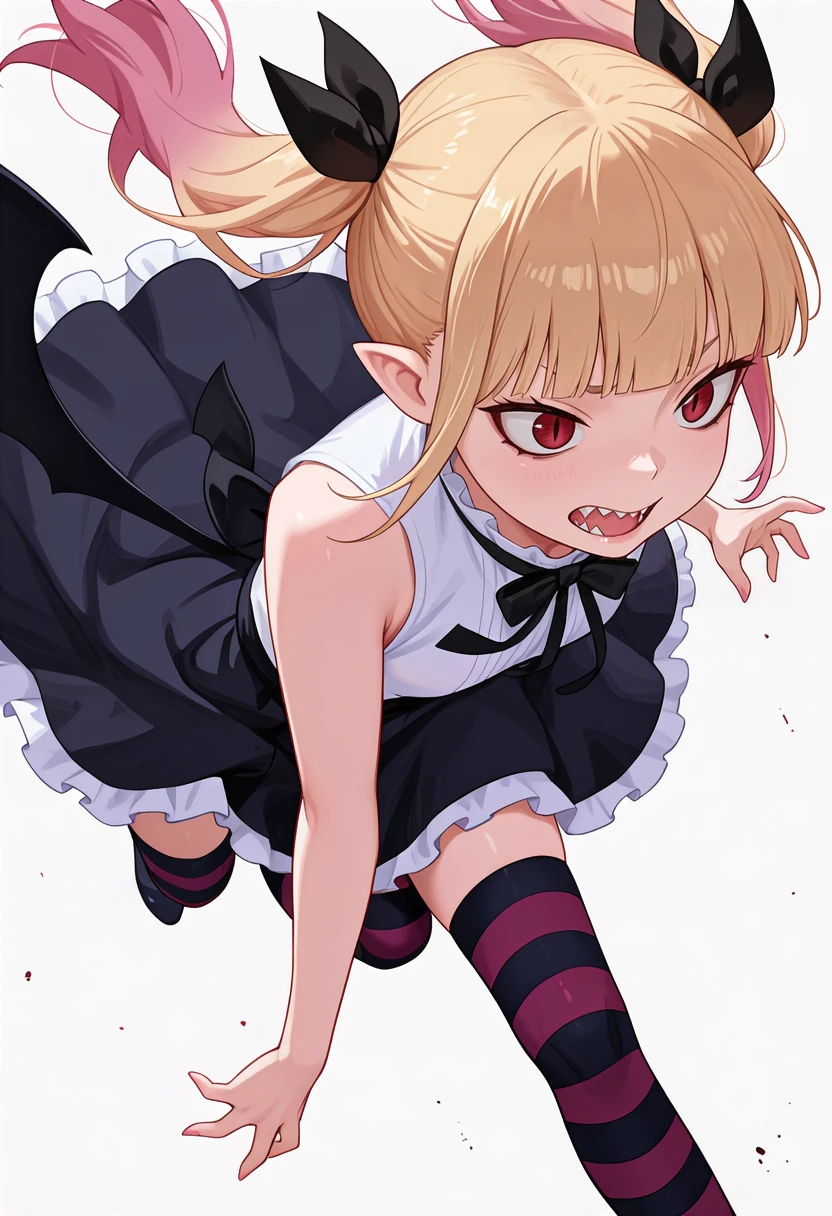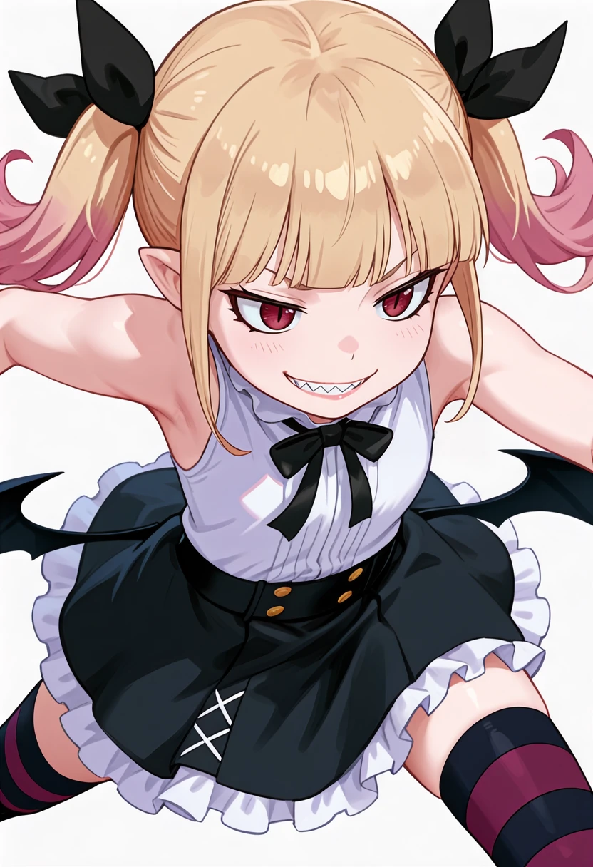 peschutz_cnr, 1girl,blonde hair, twintails, multicolored hair, red eyes, pink hair, blunt bangs, sharp teeth, vampire, low wings, sidelocks, fangs, slit pupils,hair ribbon,